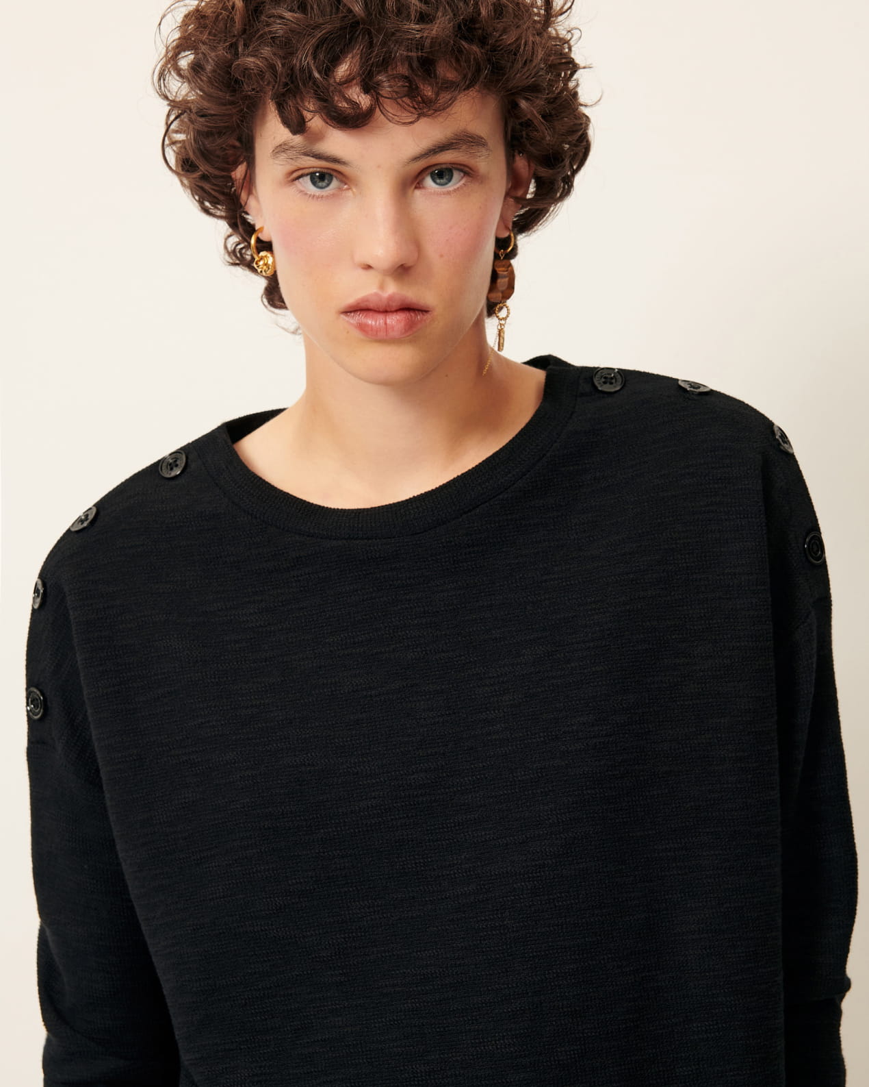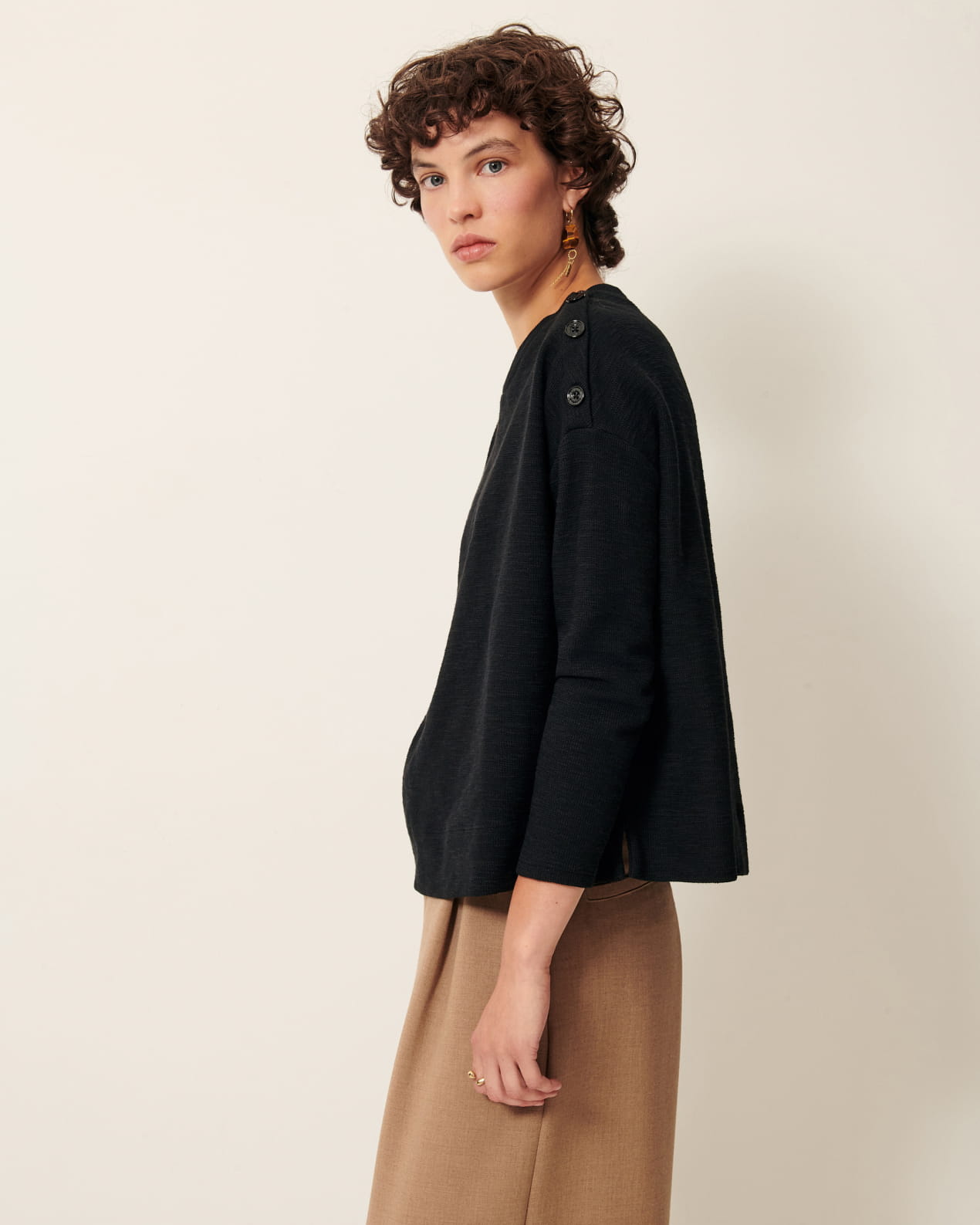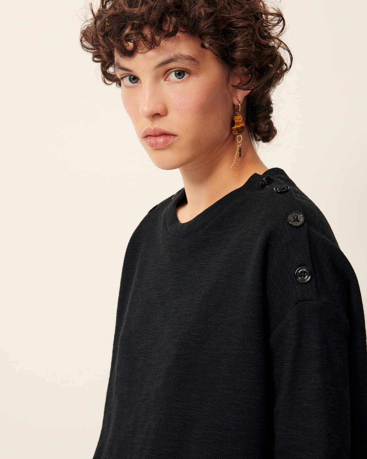 Long sleeved T-shirt with a button tab on the shoulder in a fine uneven slub yarn fleece fabric.