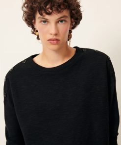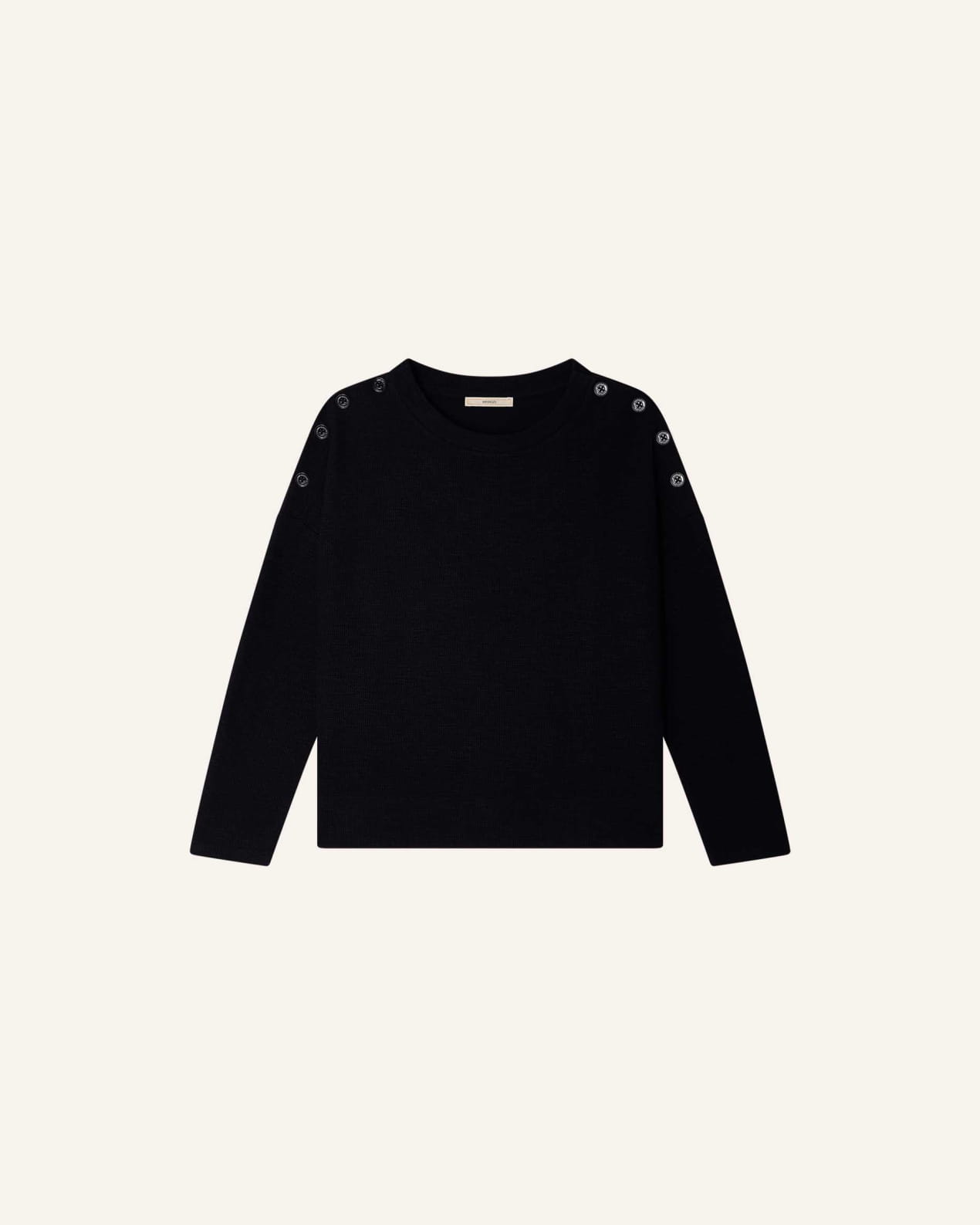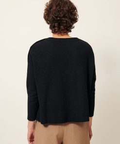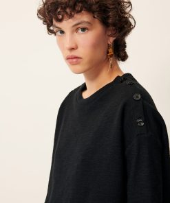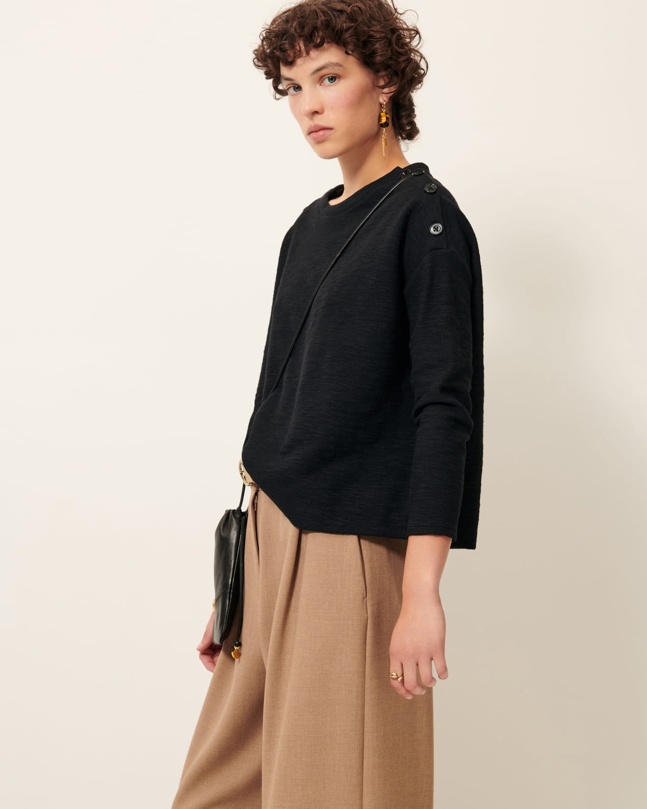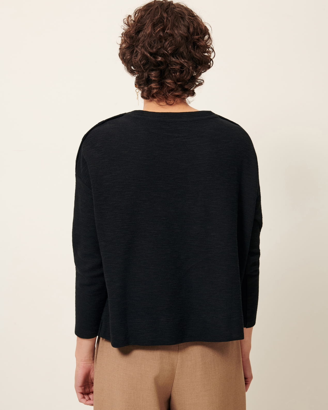 Long sleeved T-shirt with a button tab on the shoulder in a fine uneven slub yarn fleece fabric.