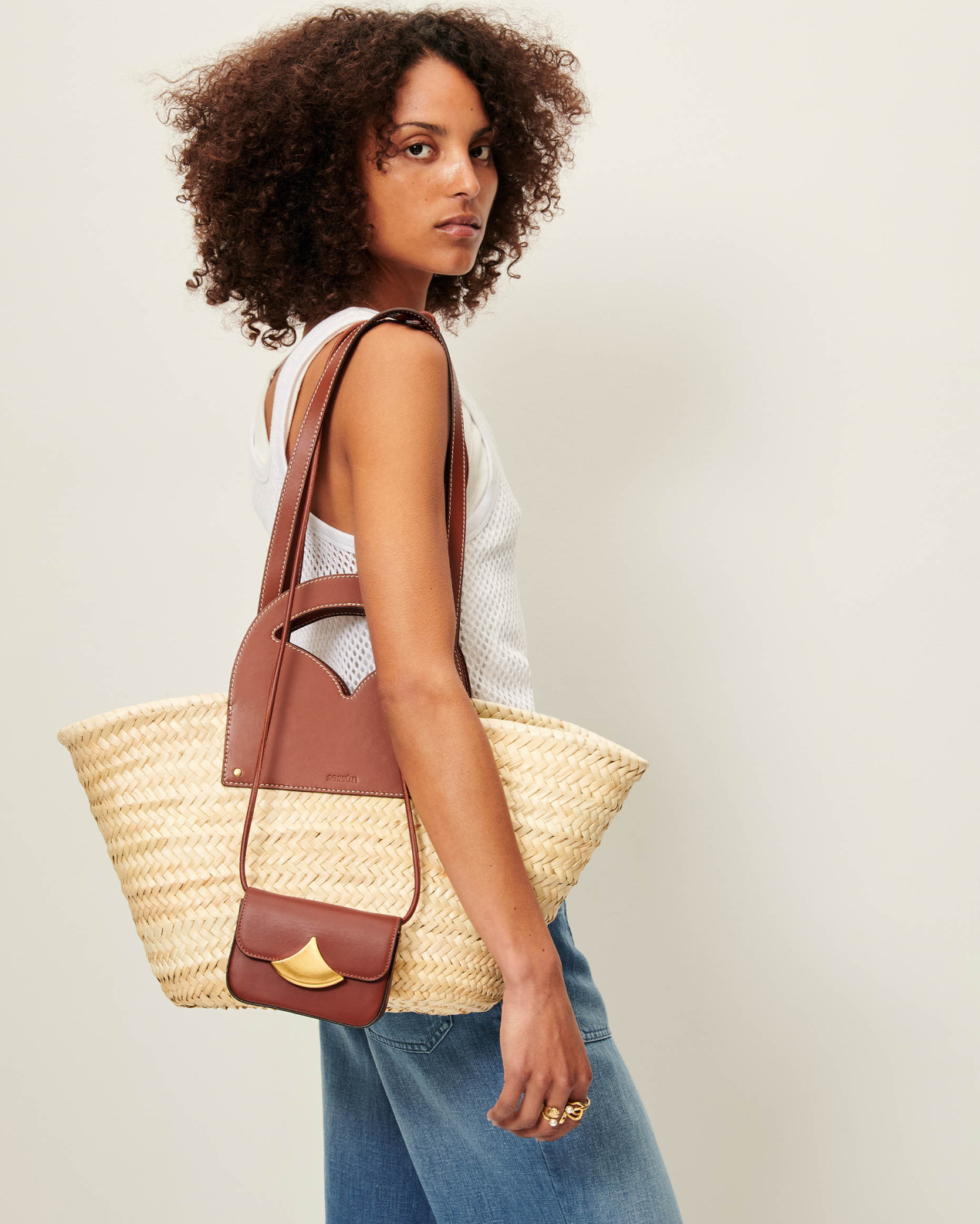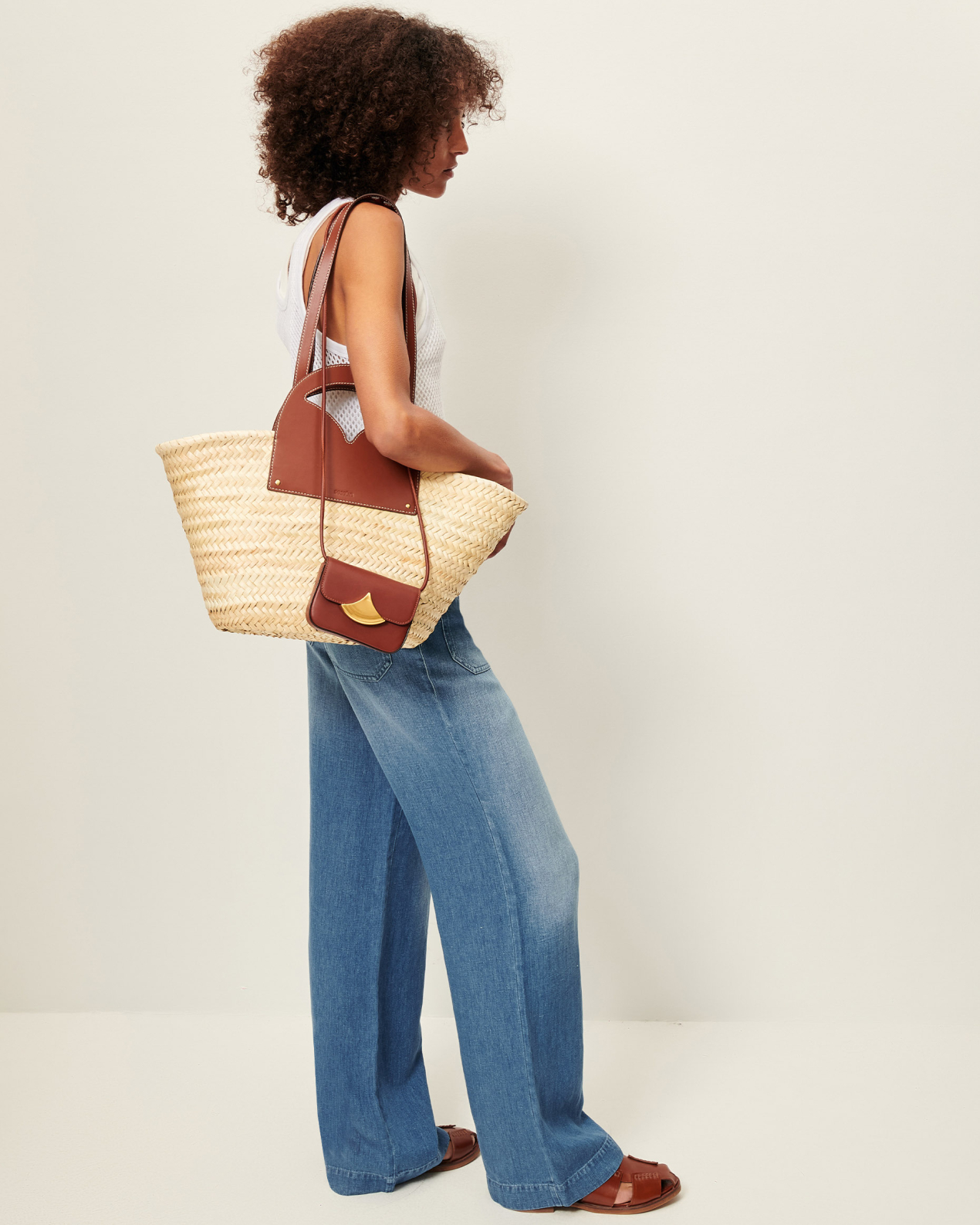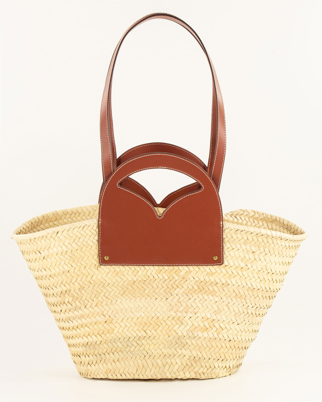 Hand-woven straw basket bag, with signature leather handle and shoulder strap.