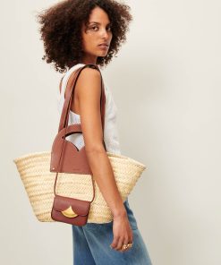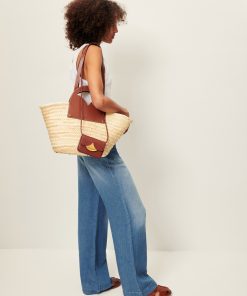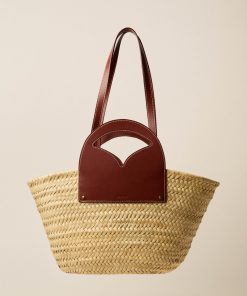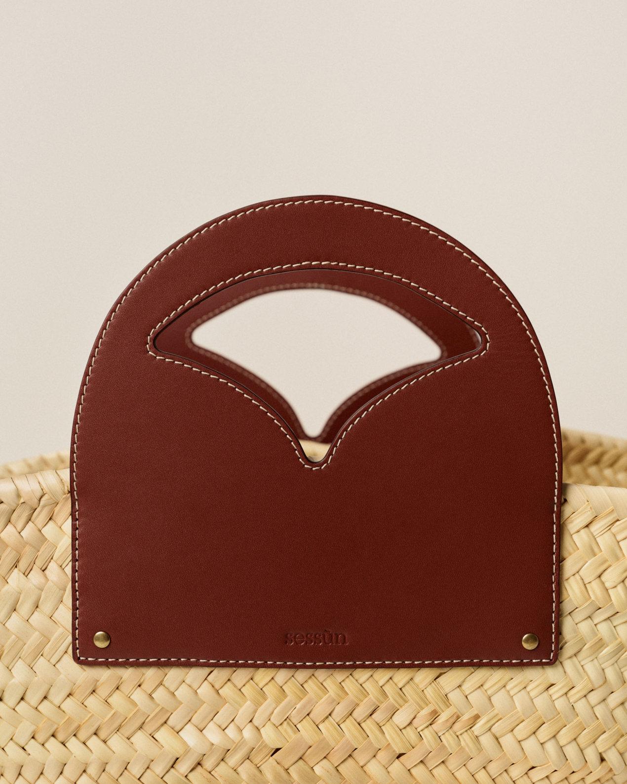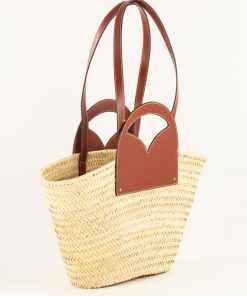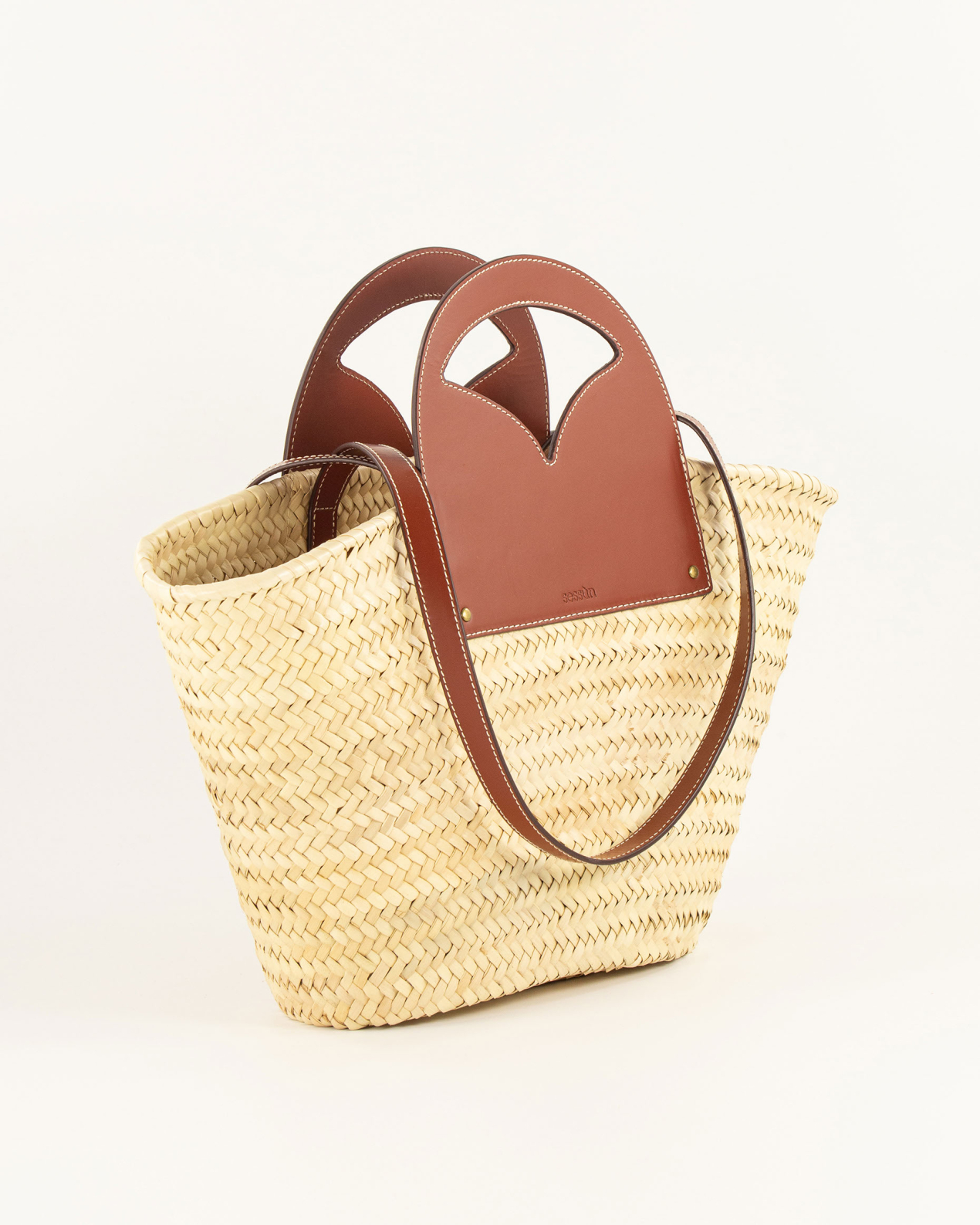 Hand-woven straw basket bag, with signature leather handle and shoulder strap.