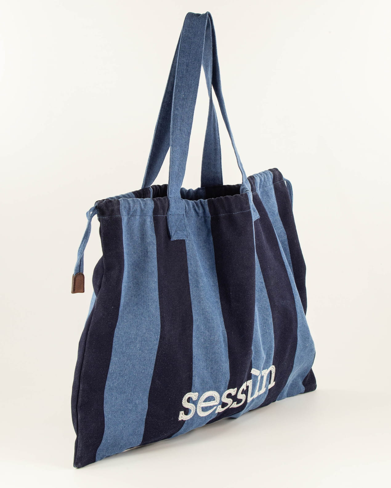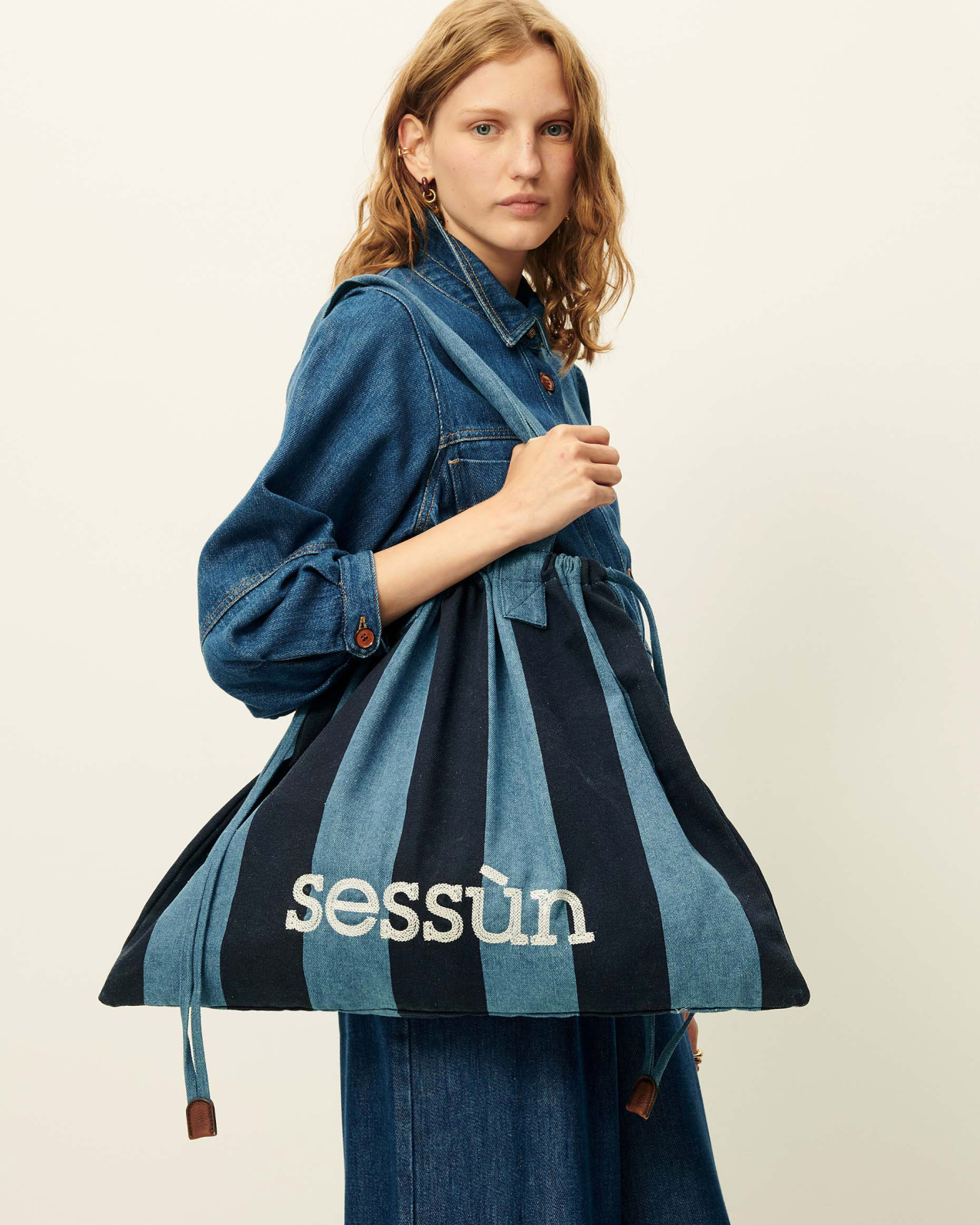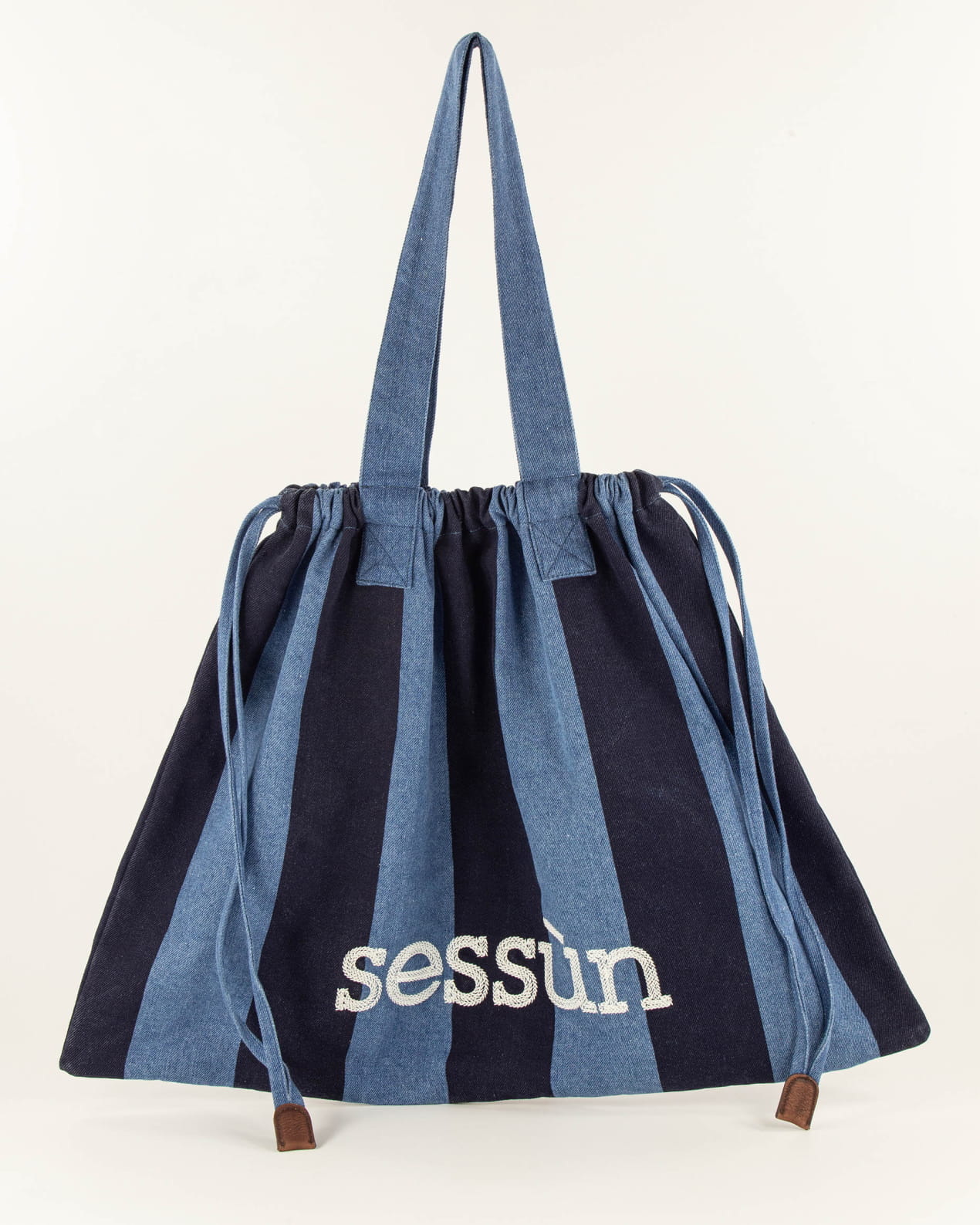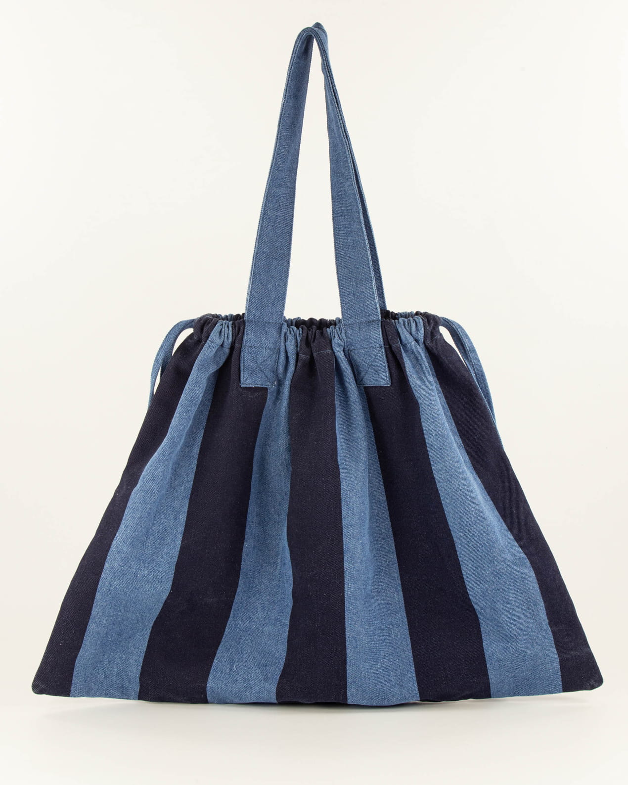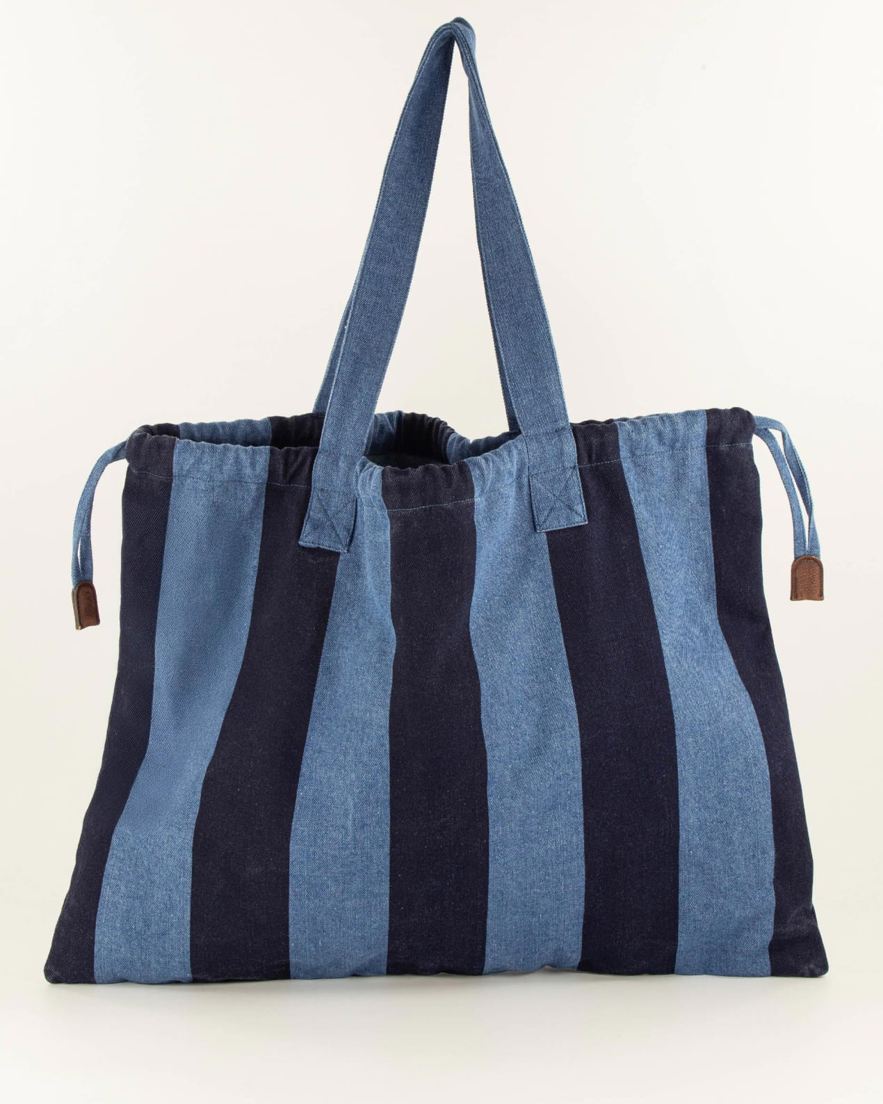 Tote bag in denim with printed stripes, featuring drawstrings with leather aglets.