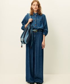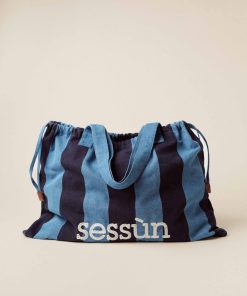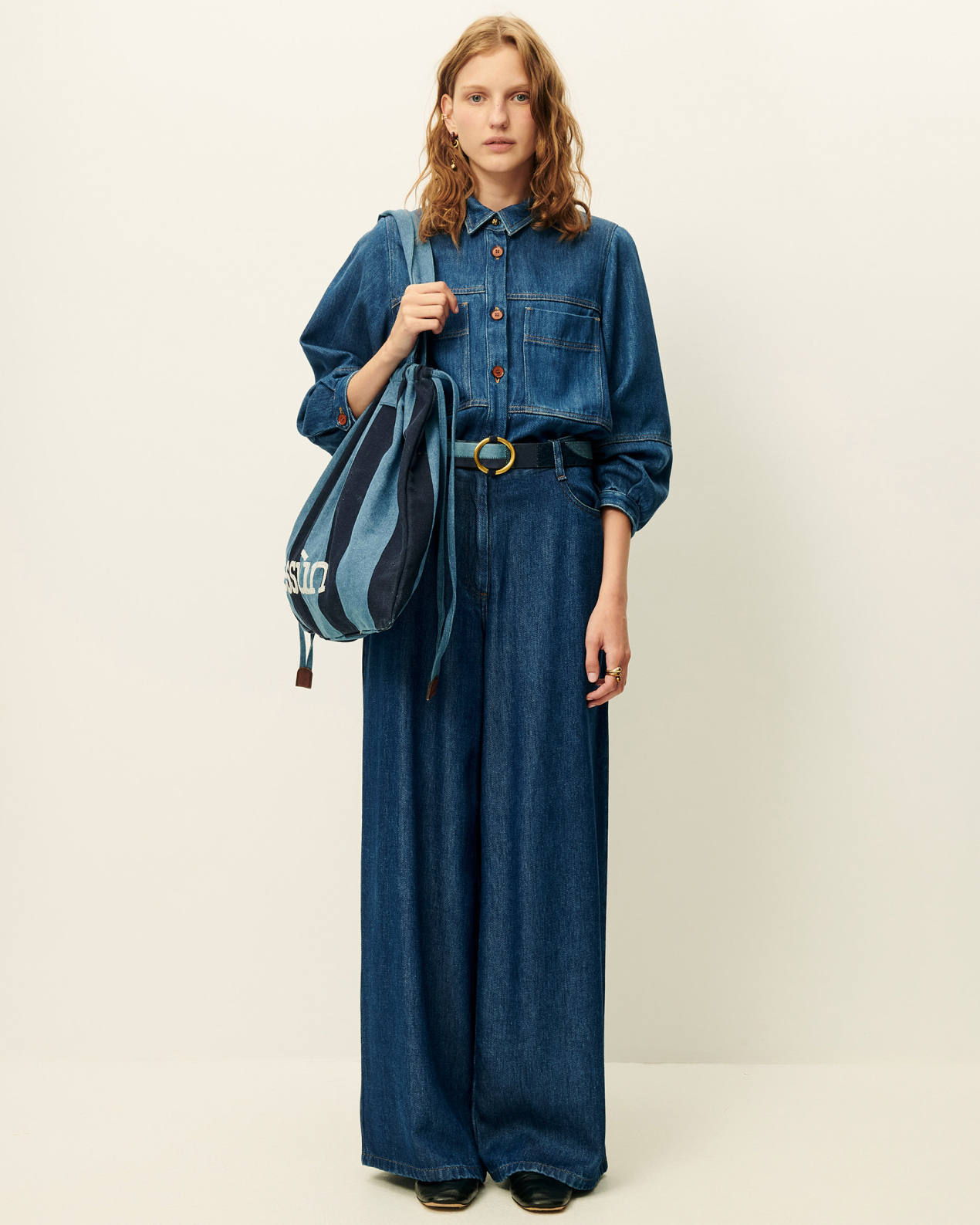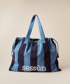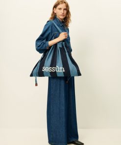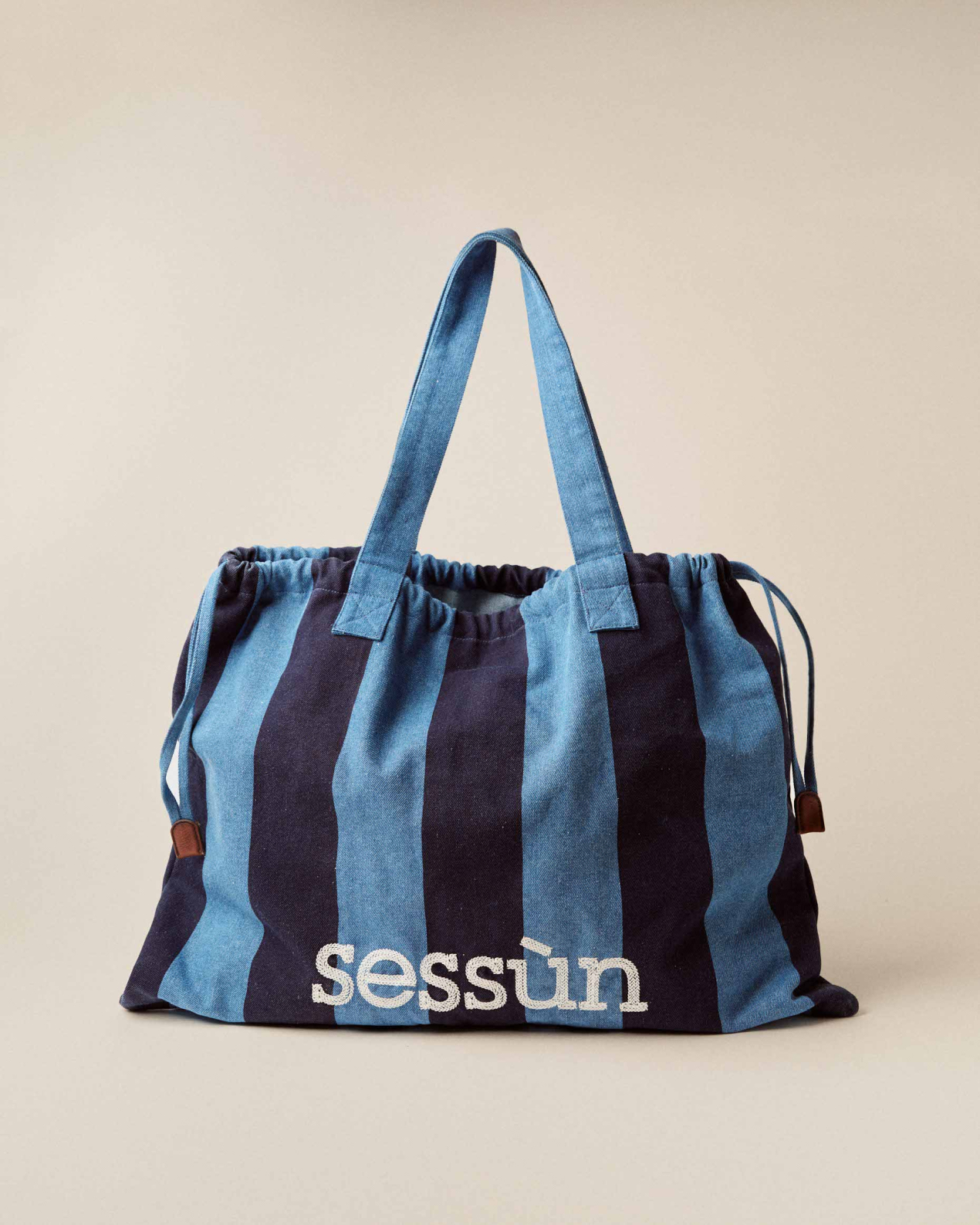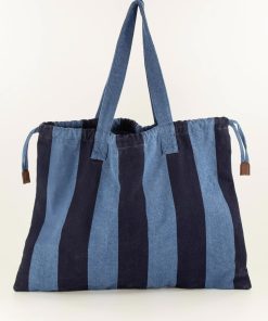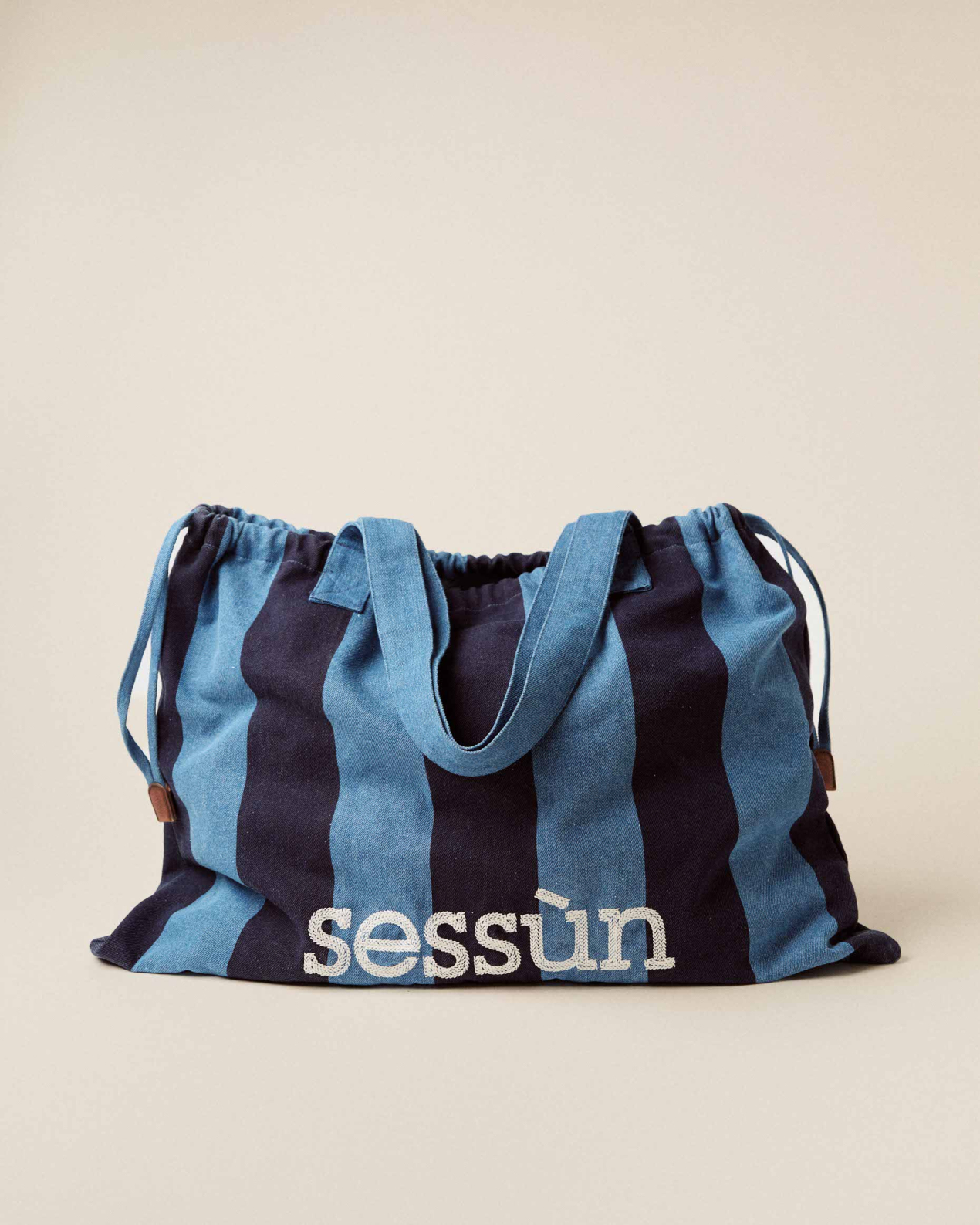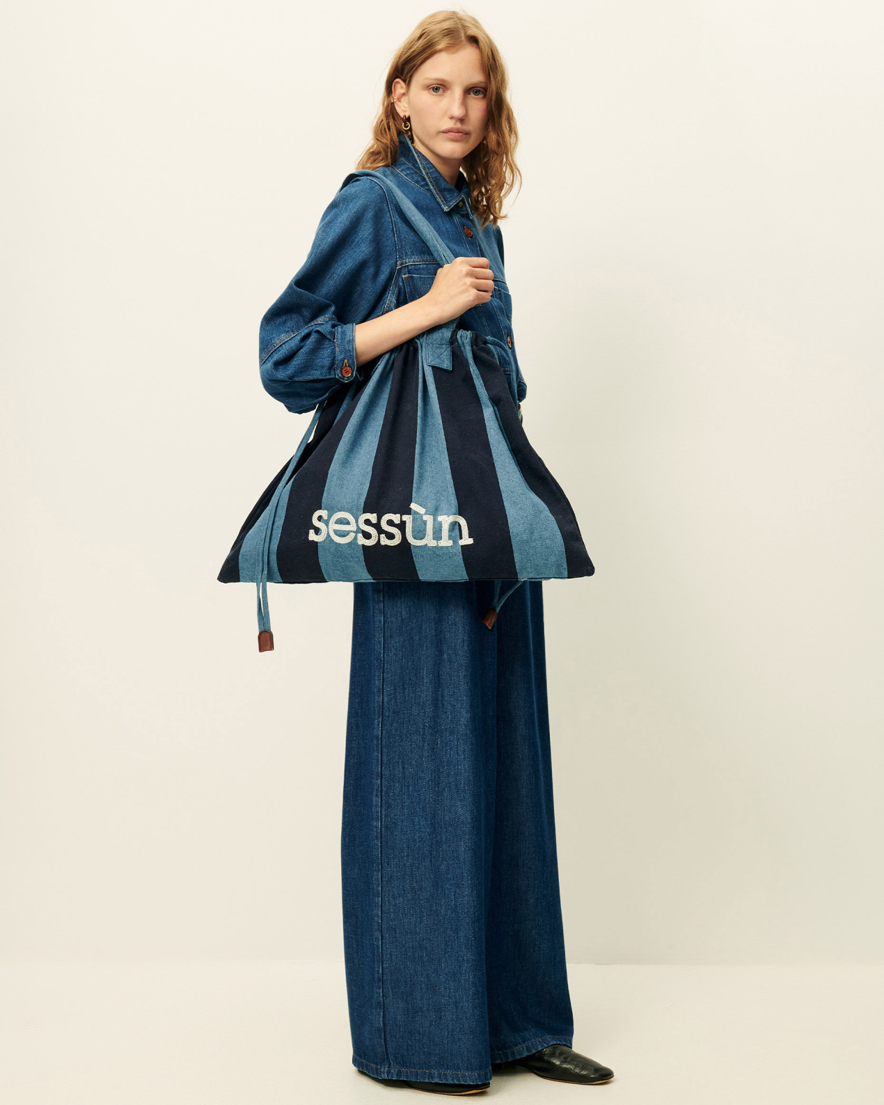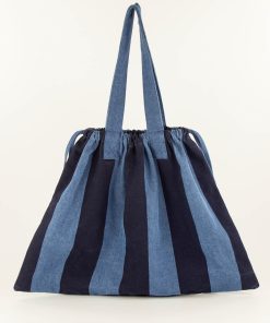 Tote bag in denim with printed stripes, featuring drawstrings with leather aglets.