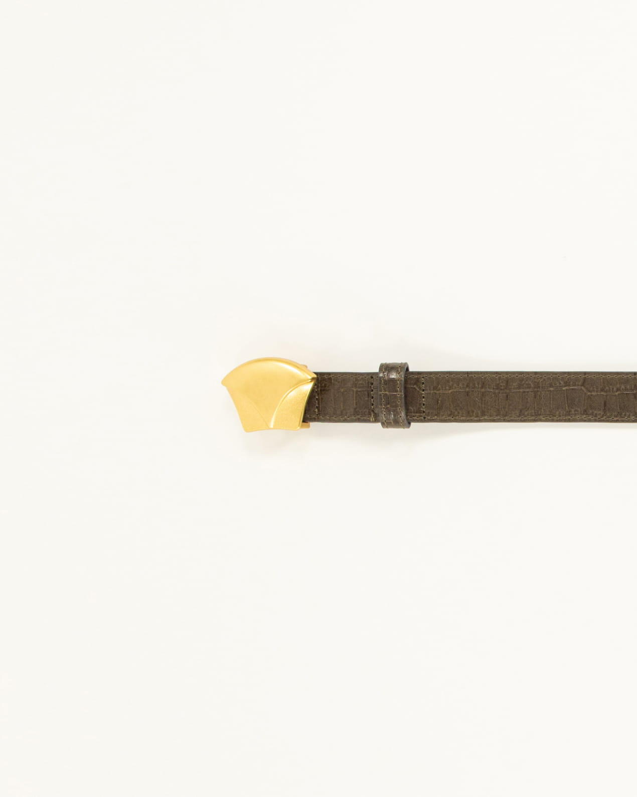 Crocodile-print cow leather belt. Collar-stud-style buckle, developed exclusively by Sessùn.