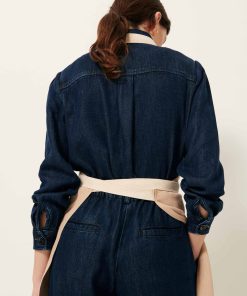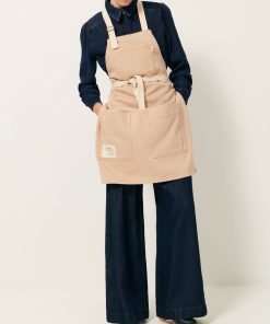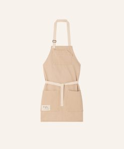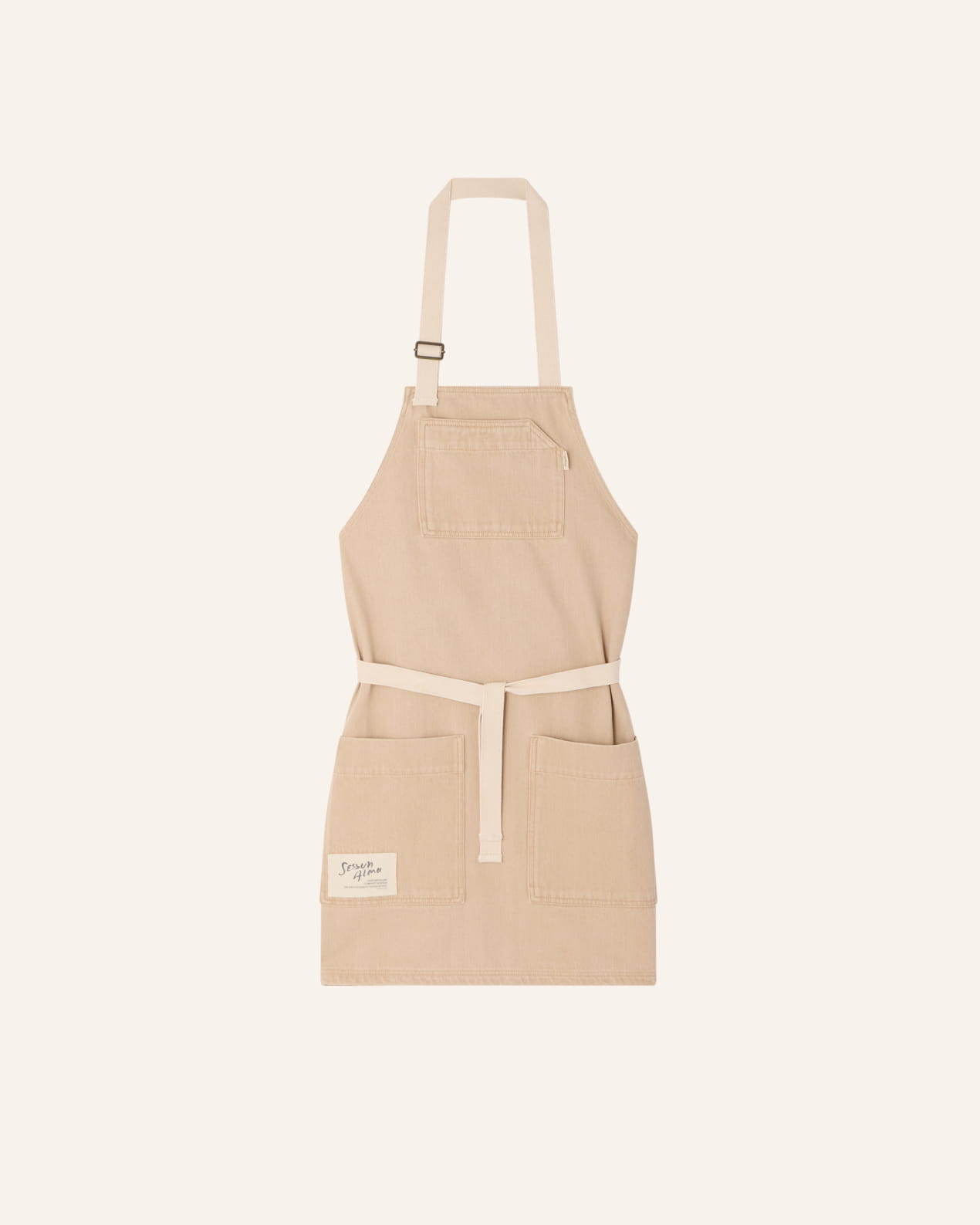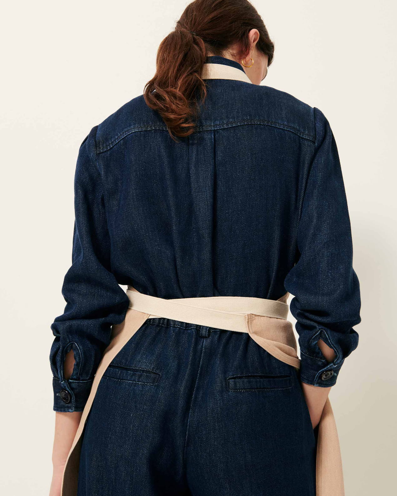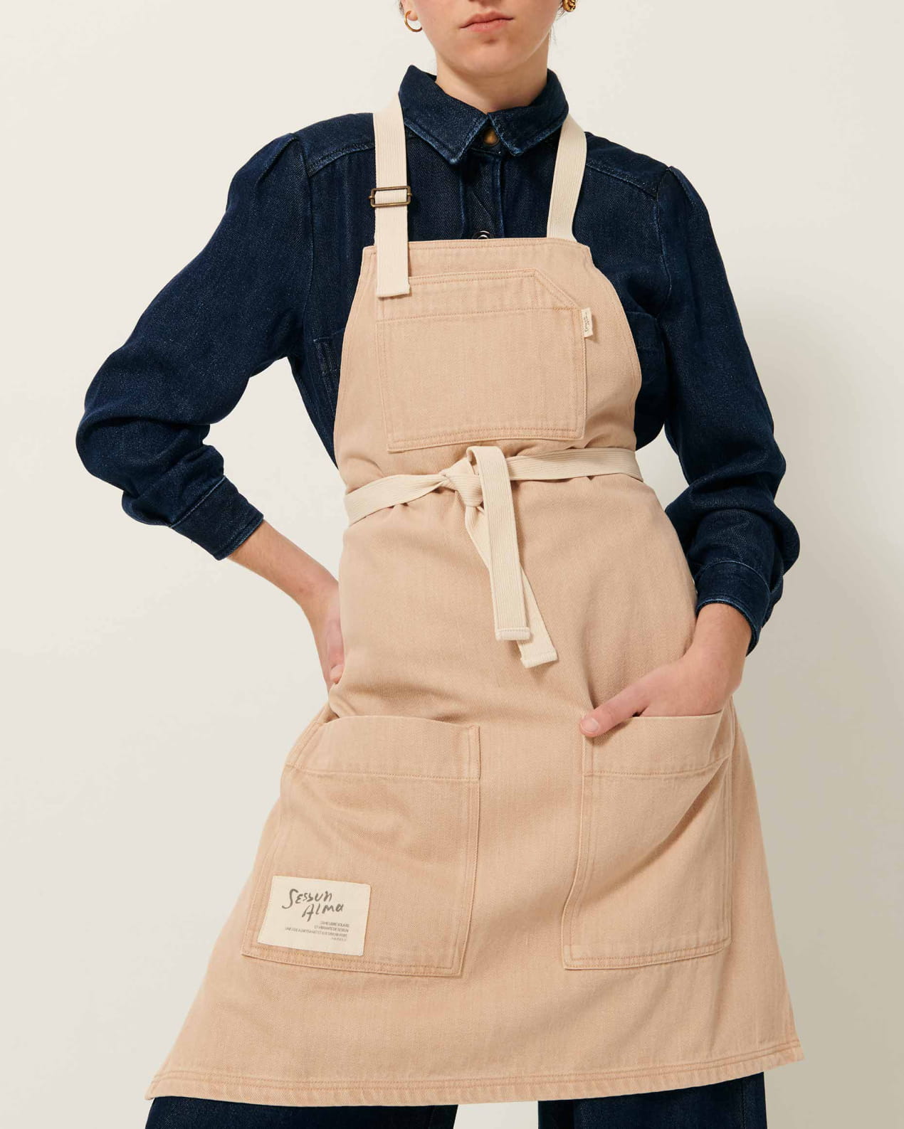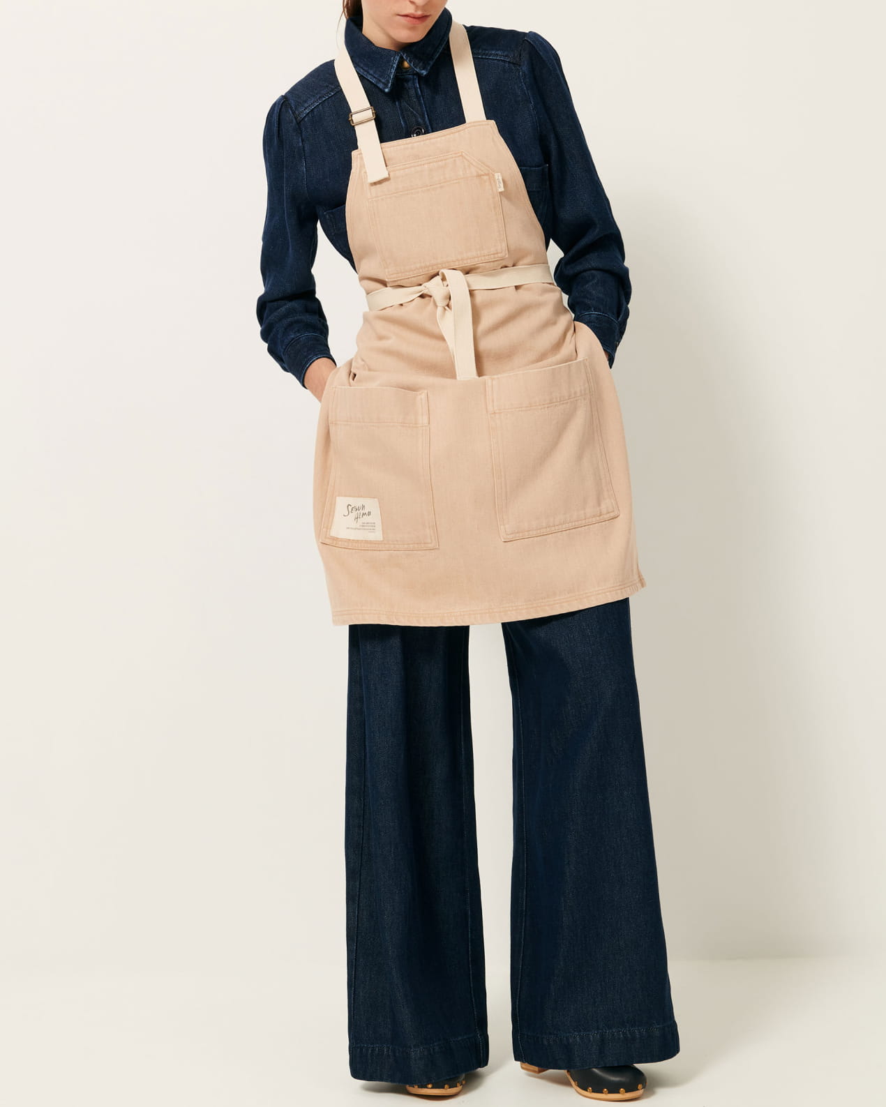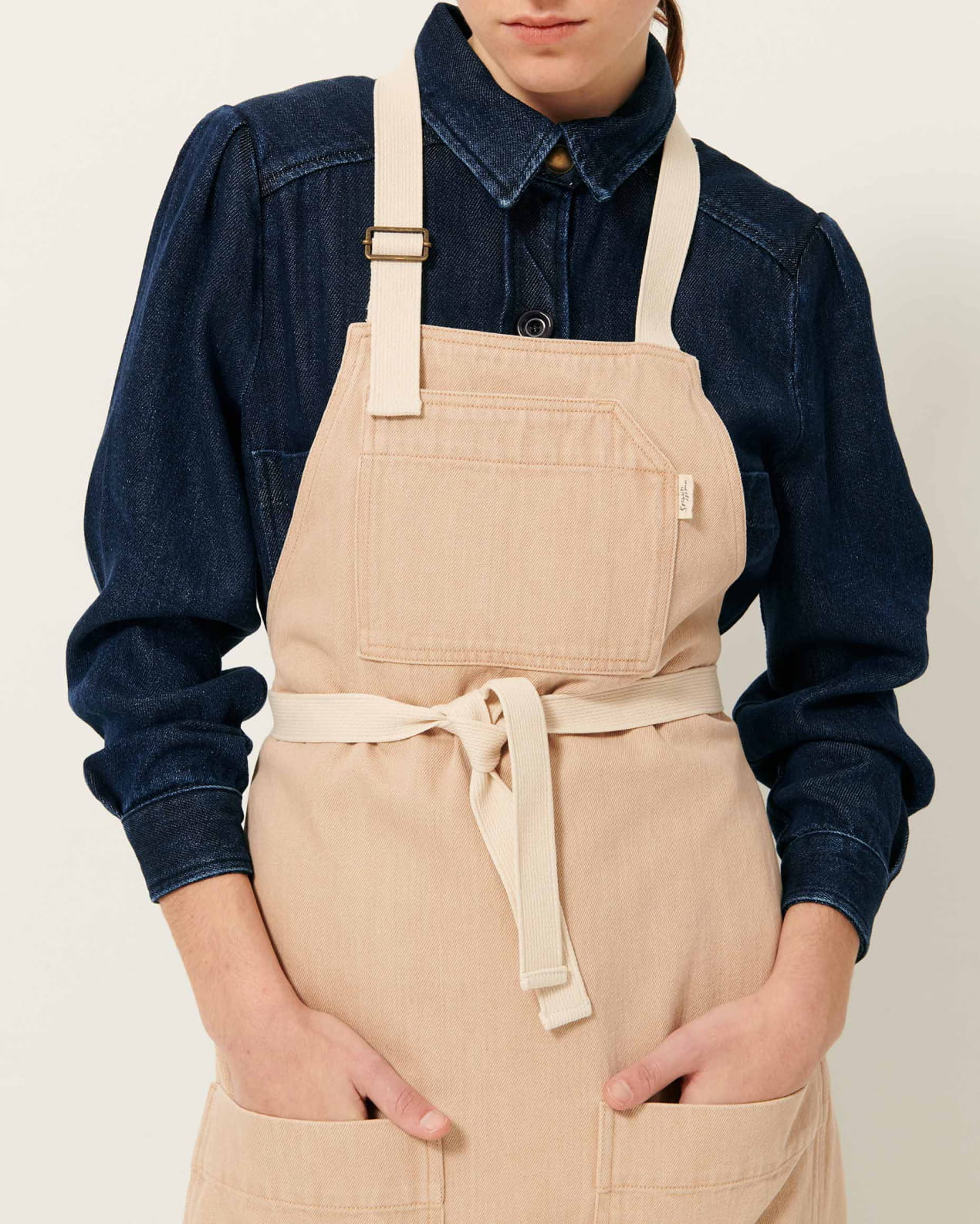 Apron with pockets in thread-dyed cotton twill with a chambray effect.