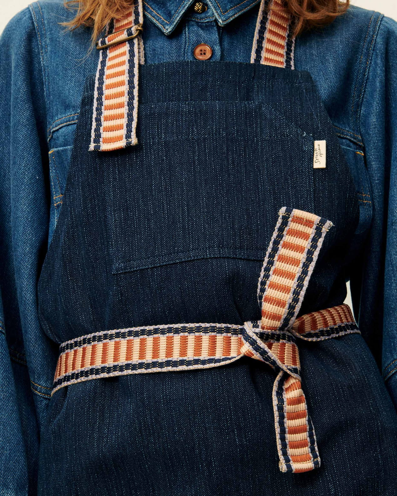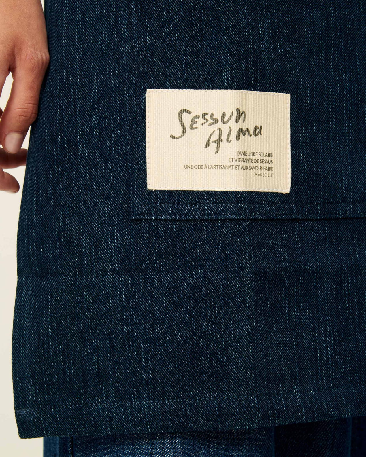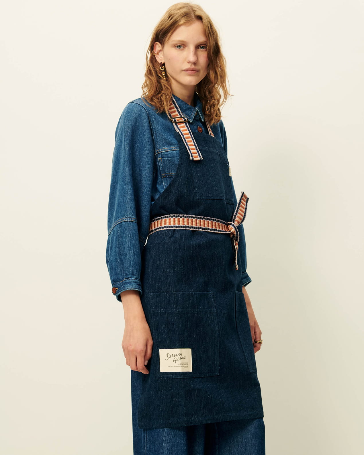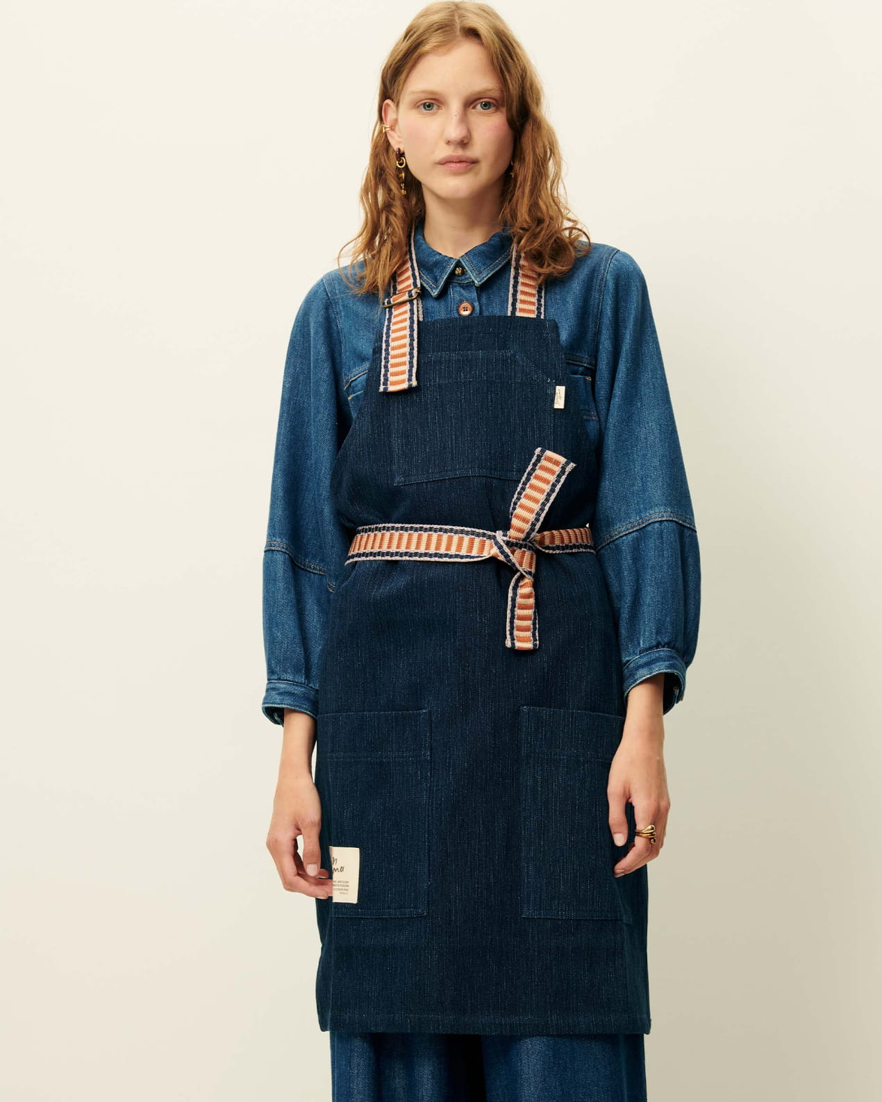 Apron with pockets in cotton twill, featuring indigo-dyed threads, woven in Italy.