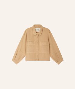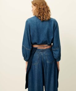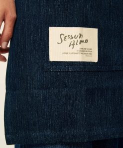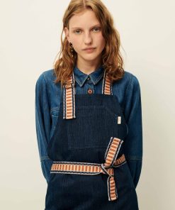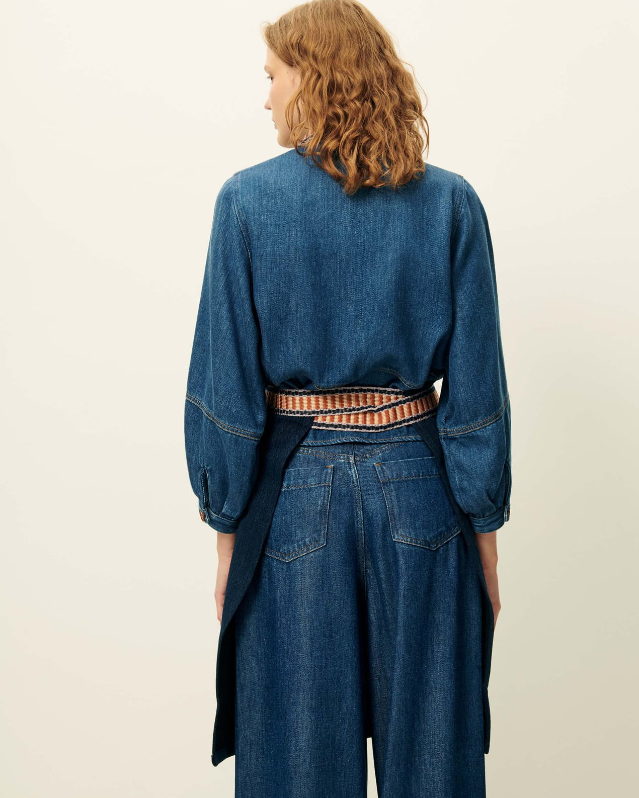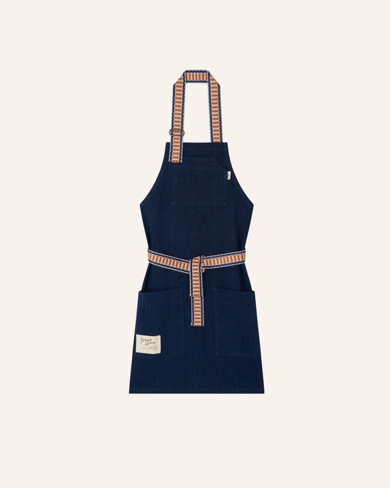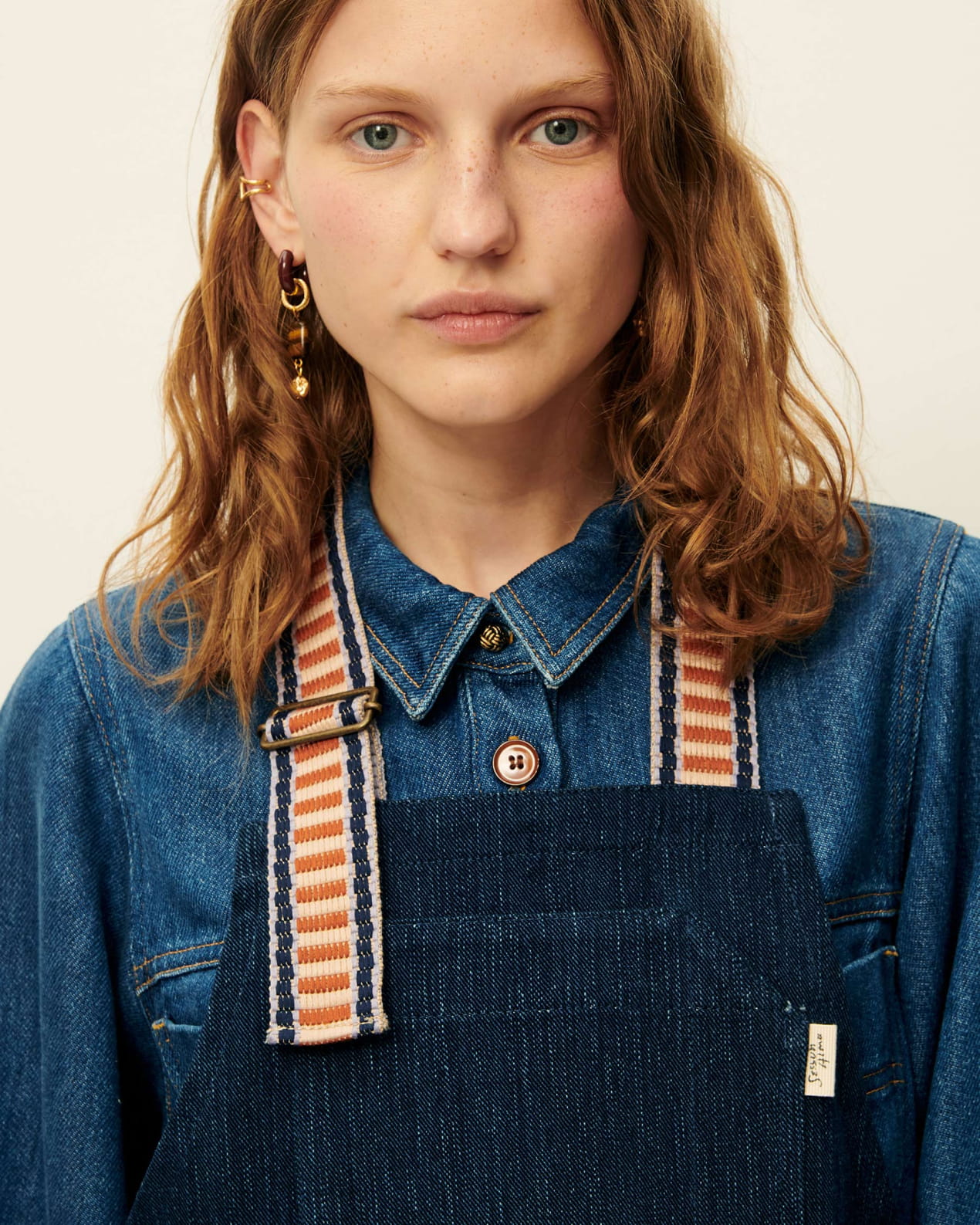 Apron with pockets in cotton twill, featuring indigo-dyed threads, woven in Italy.