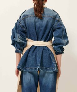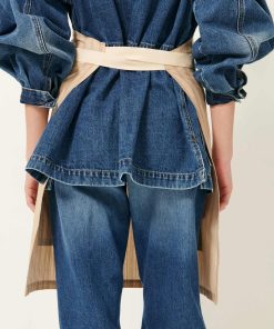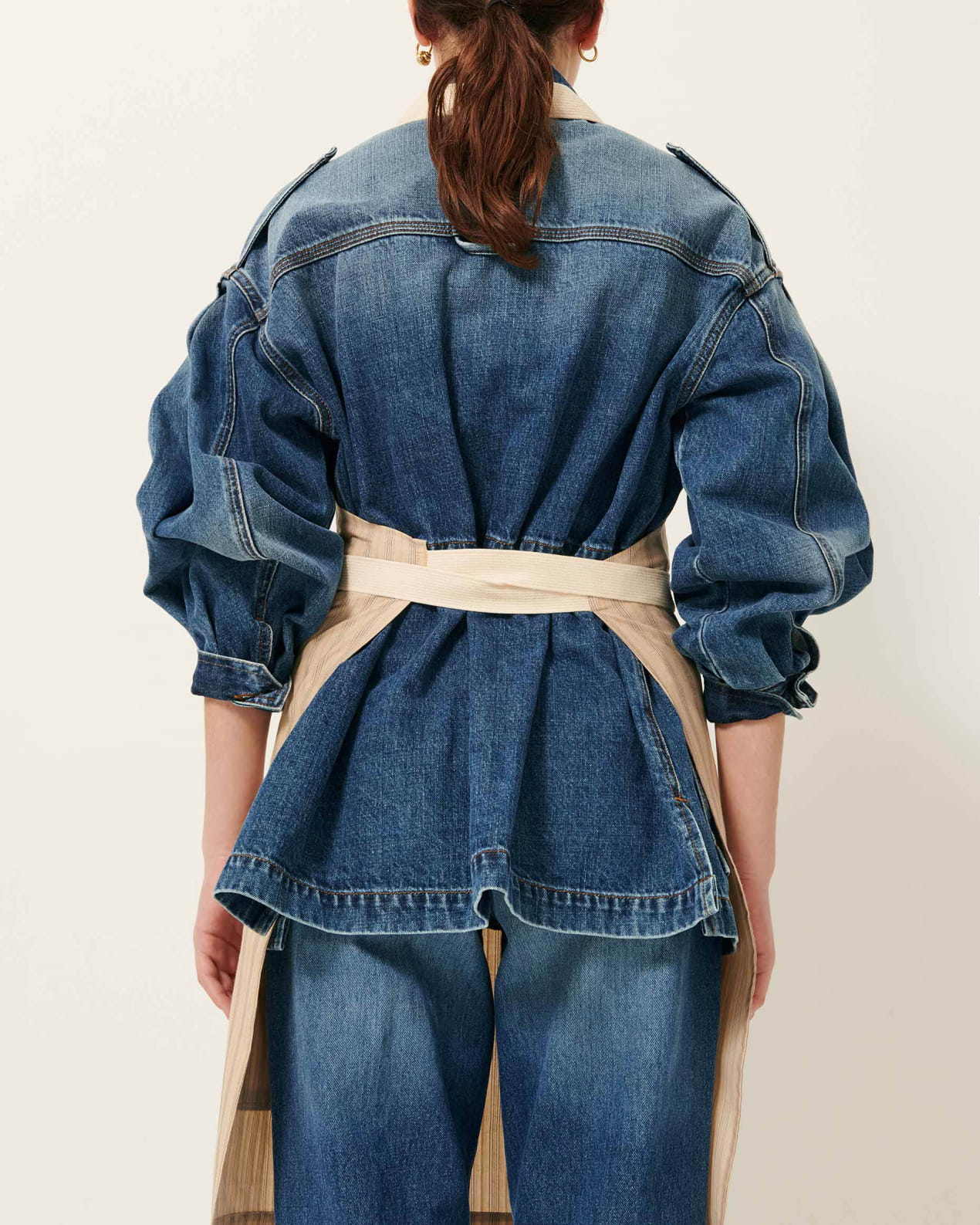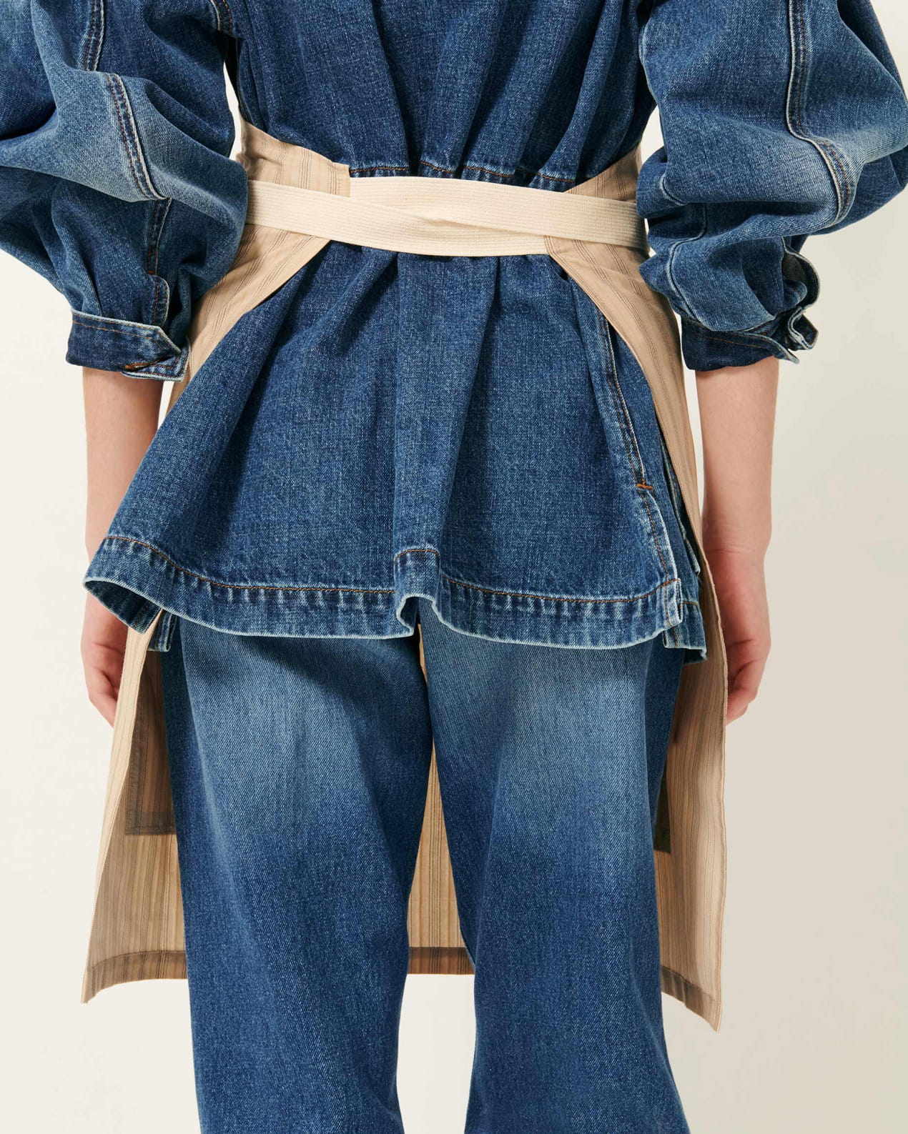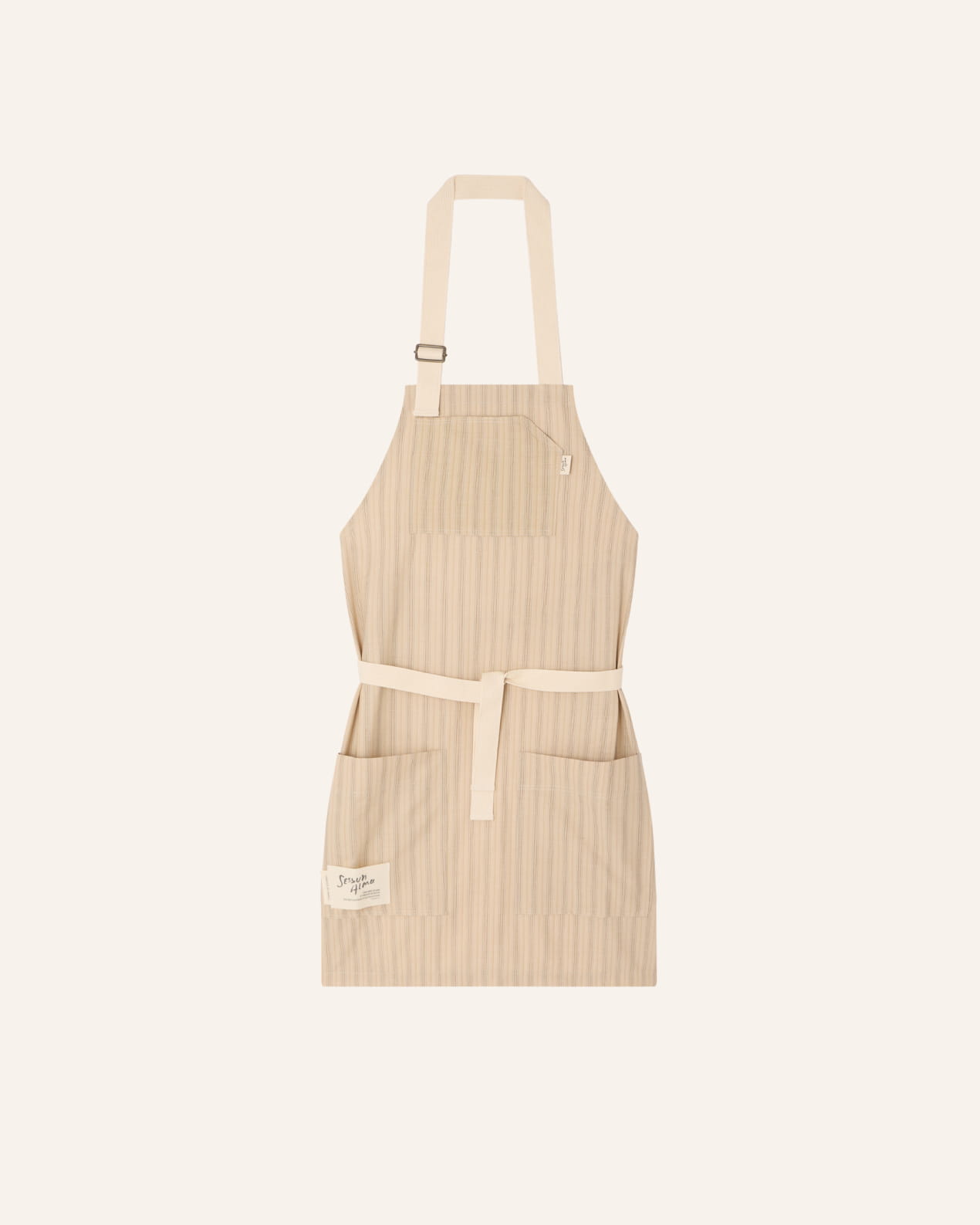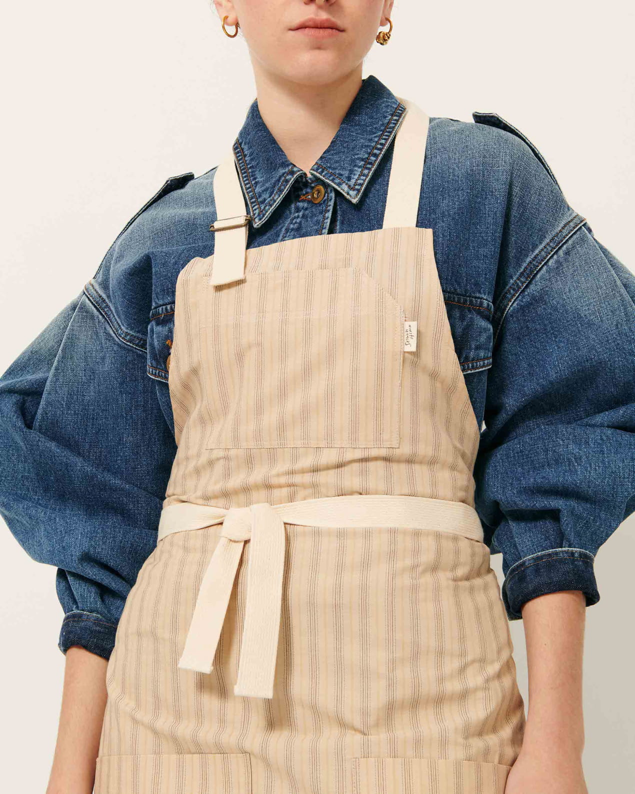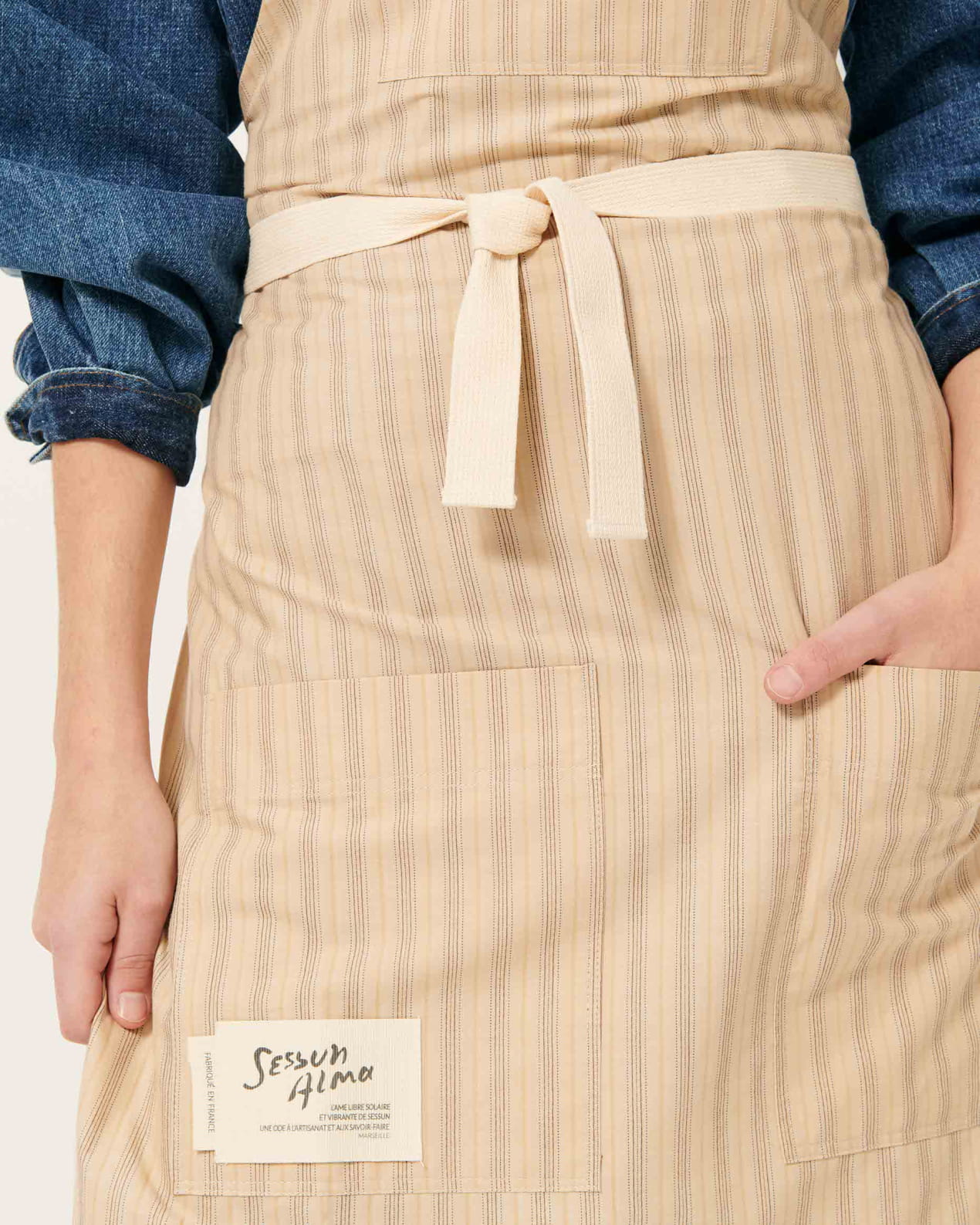 Apron with pockets in organic cotton twill, featuring decorative jacquard-weave stripes, woven in France.