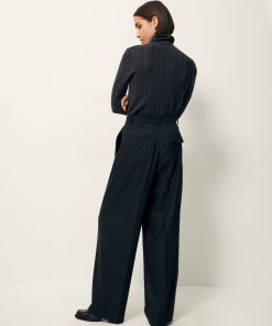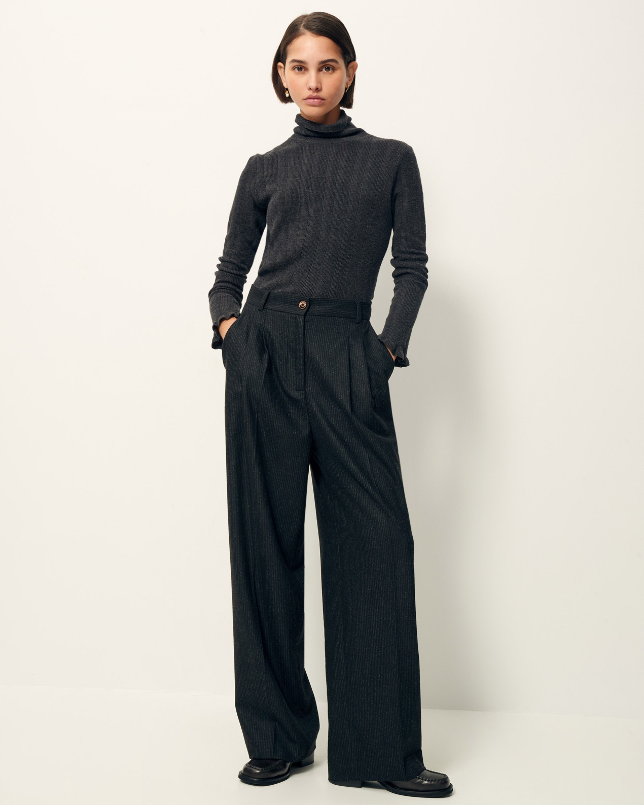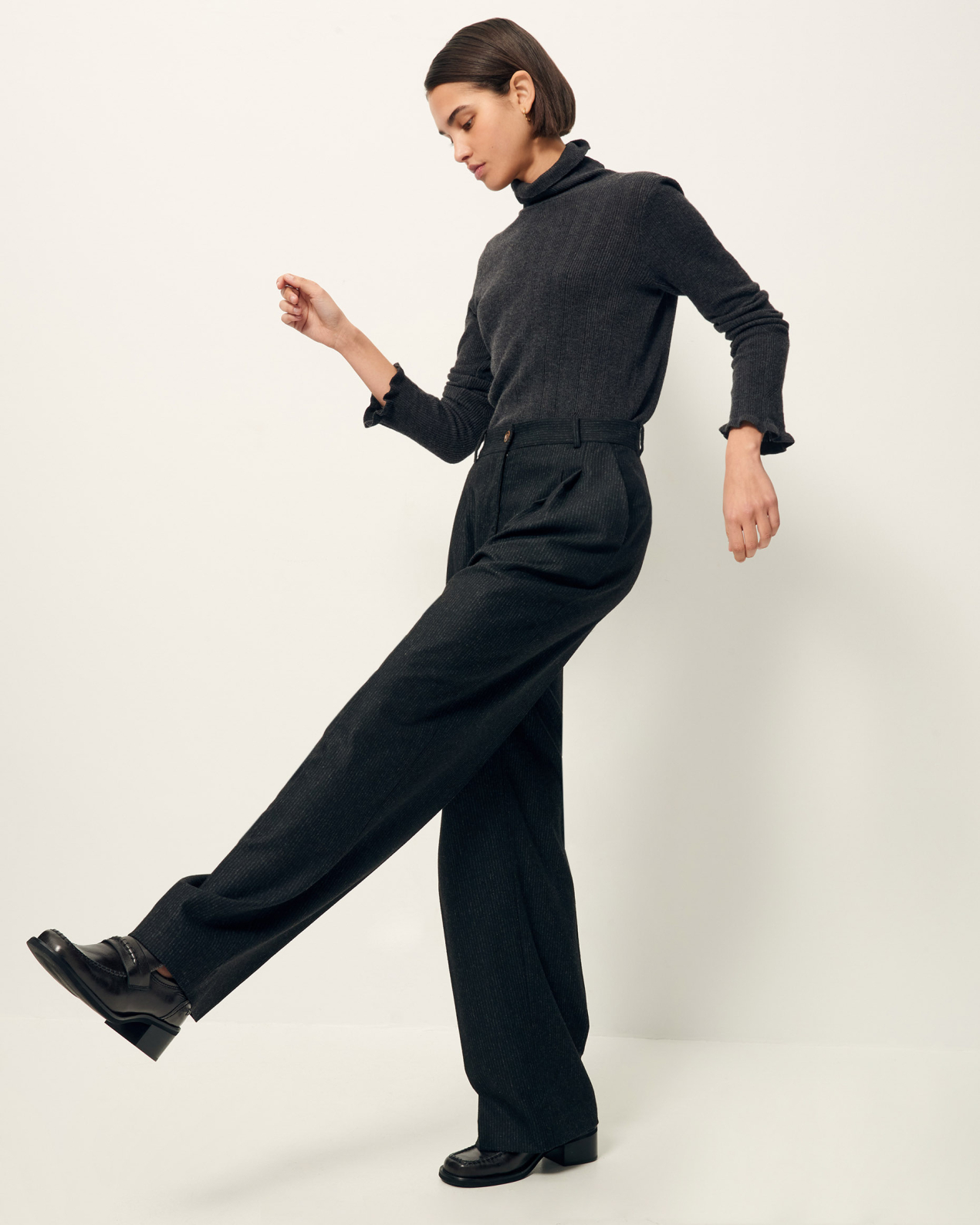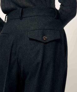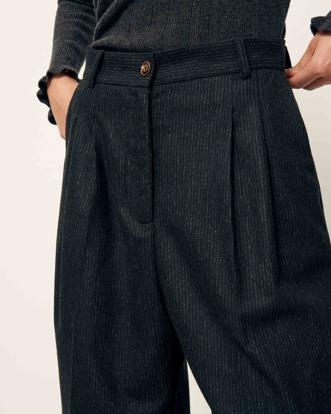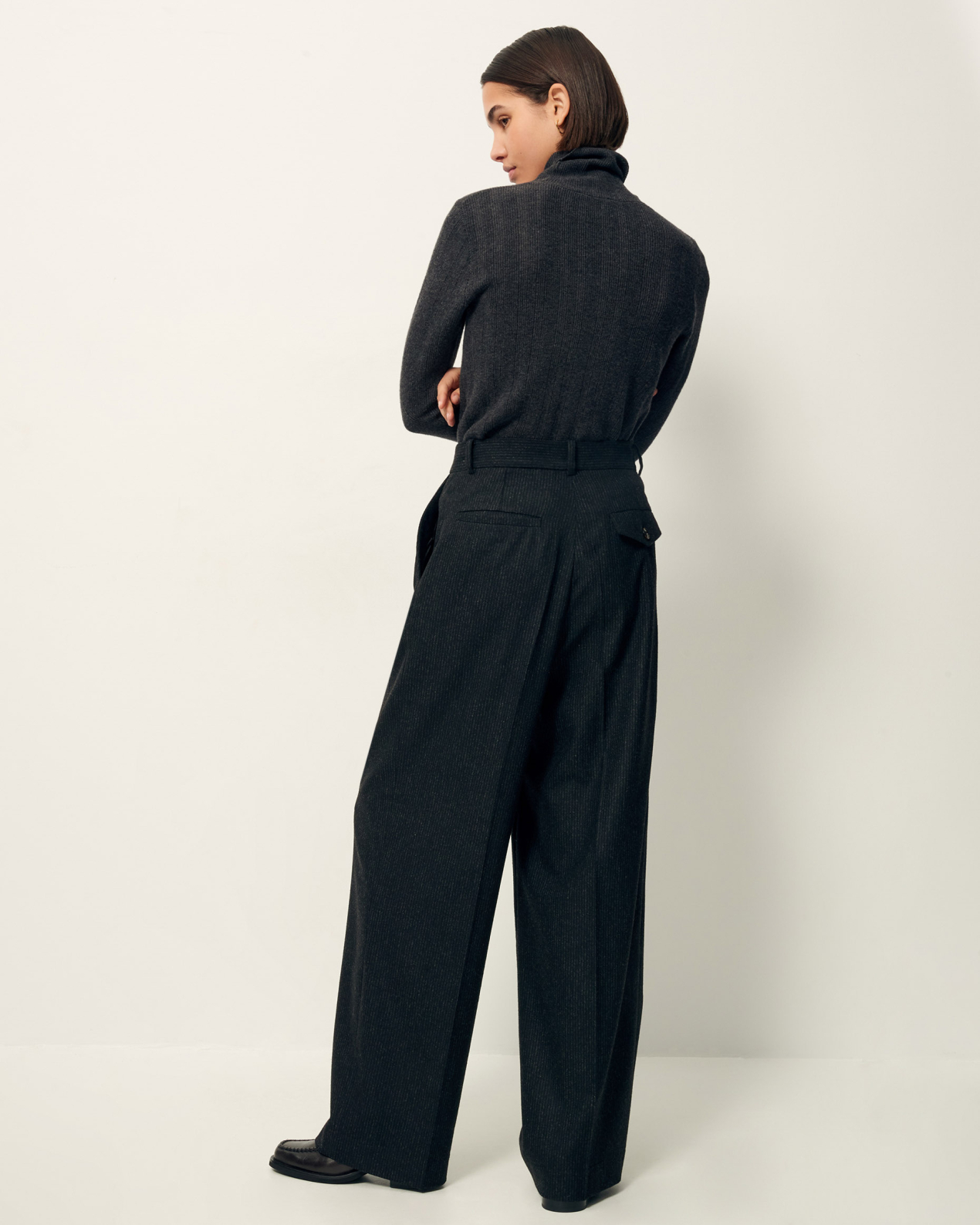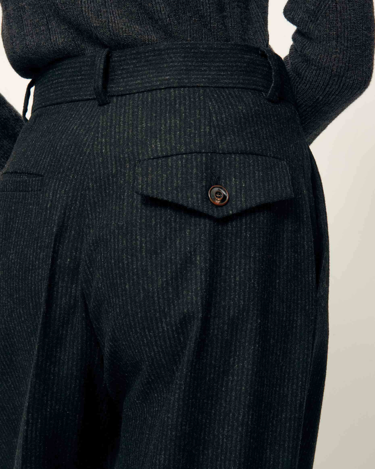Masculine-style straight pants with knife pleats at the waist in a marengo-striped flannel fabric, woven in Italy.