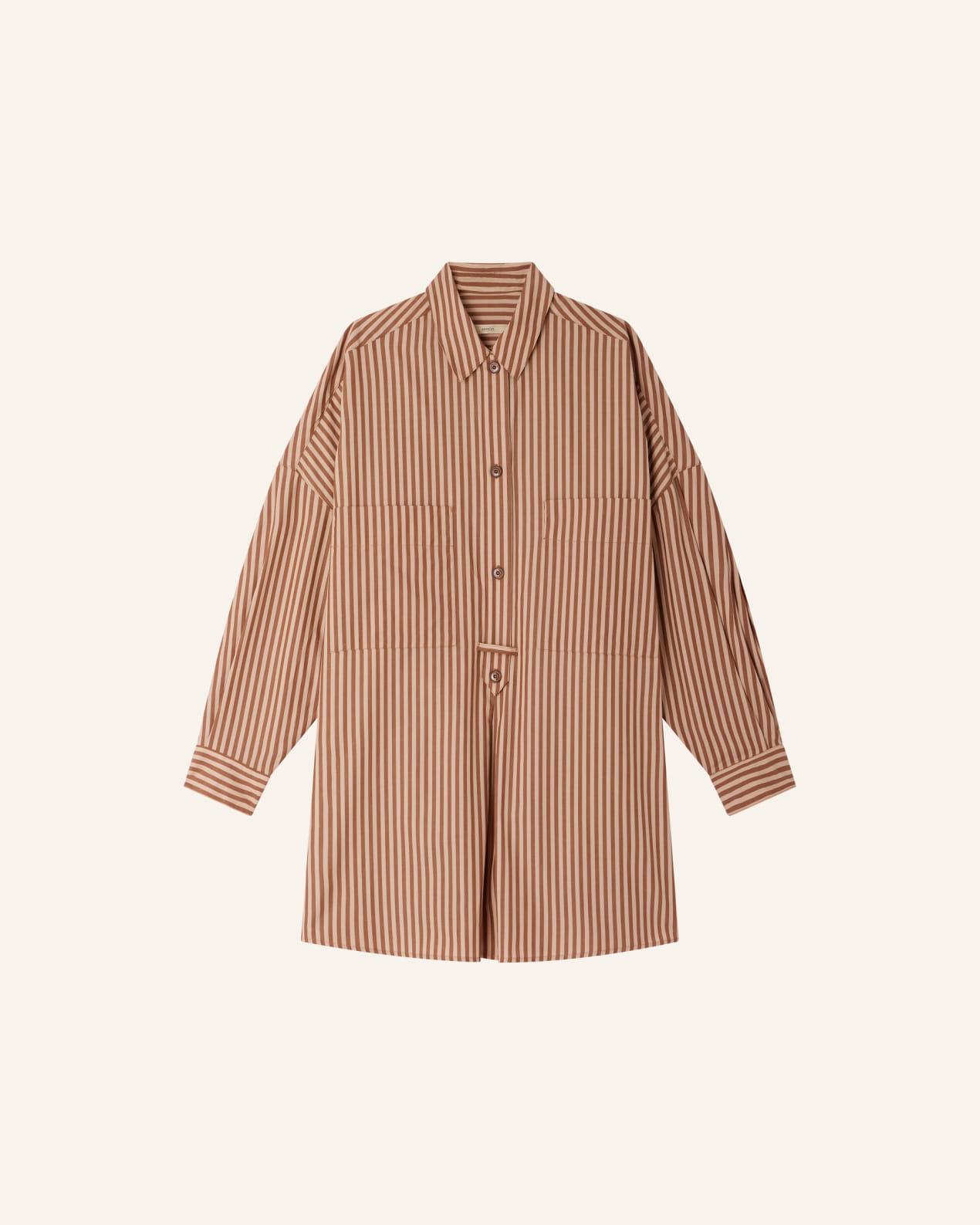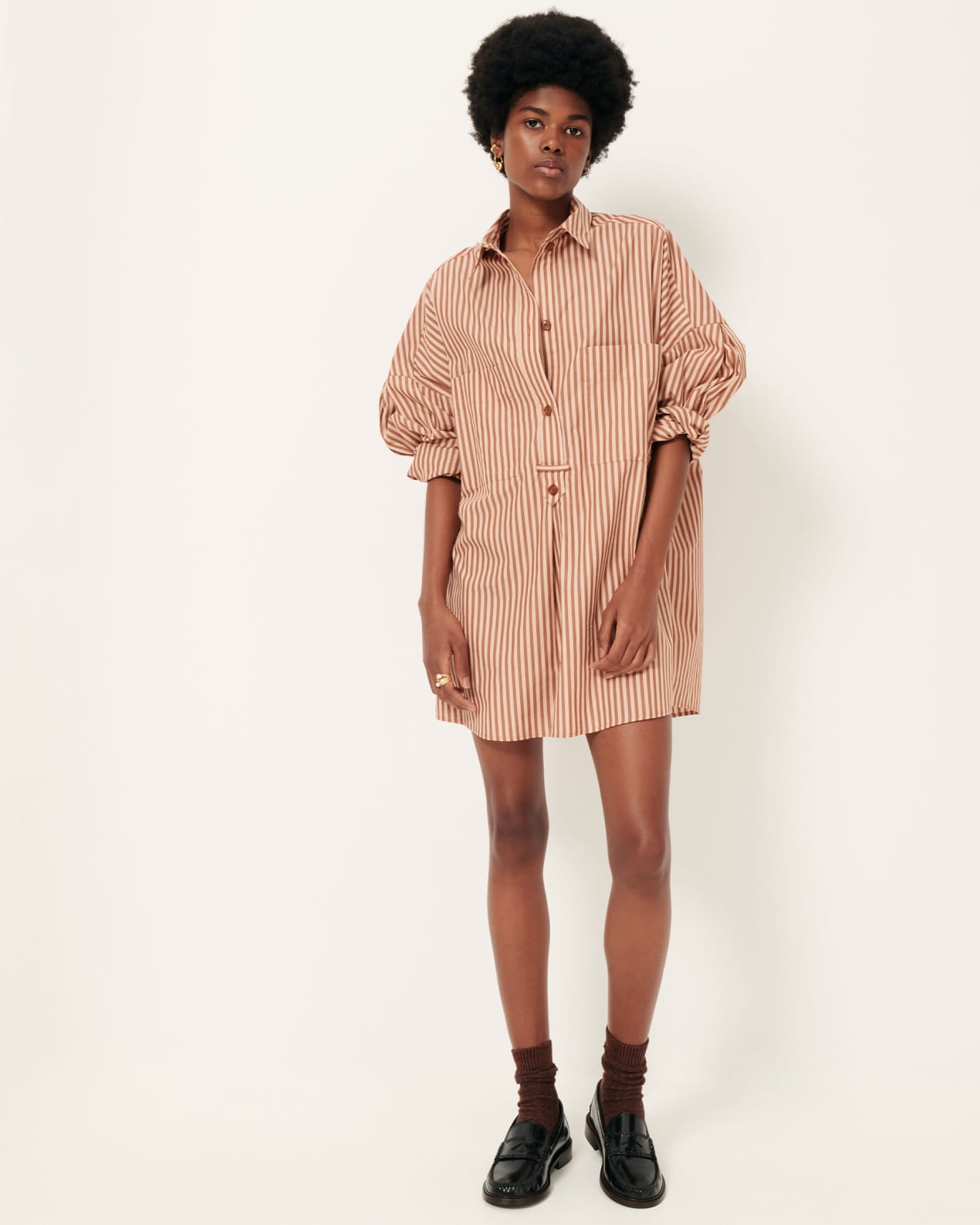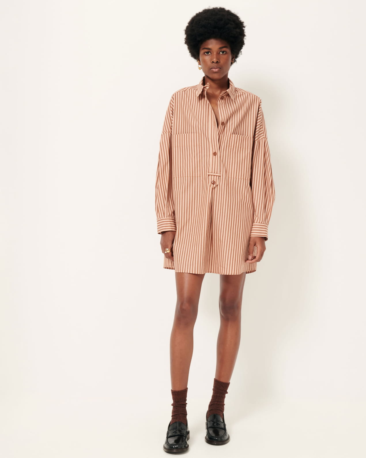 Short shirt dress with patch pockets in compact cotton poplin with two-tone stripes, woven in Italy, exclusive to Sessùn.