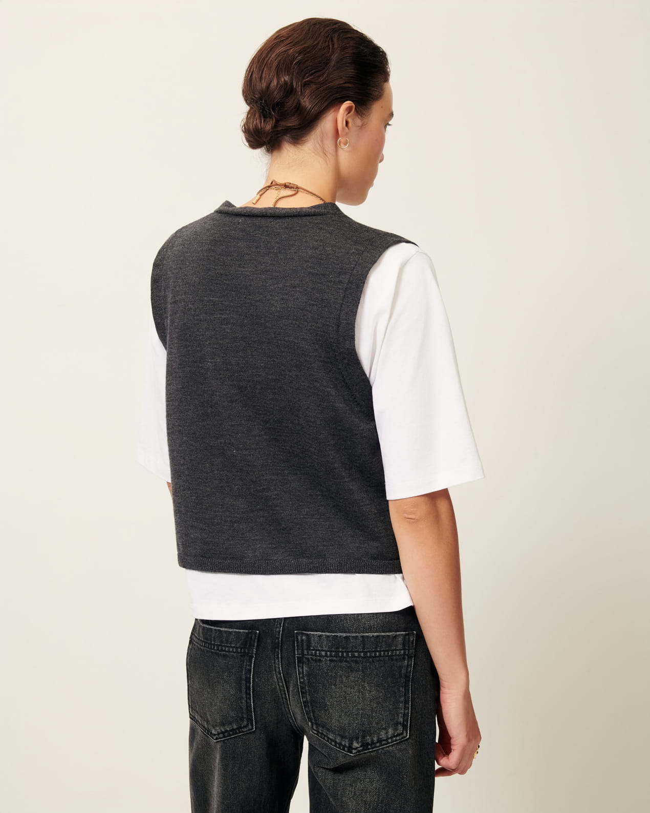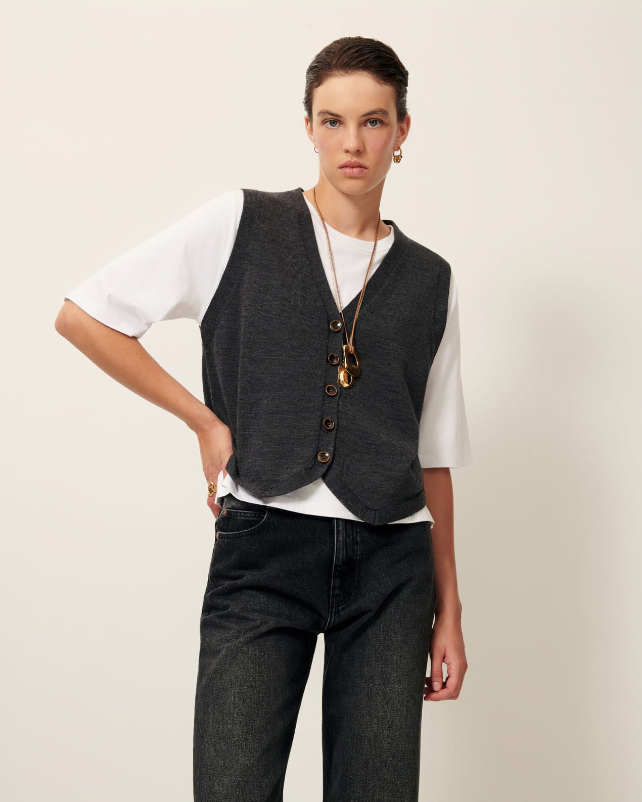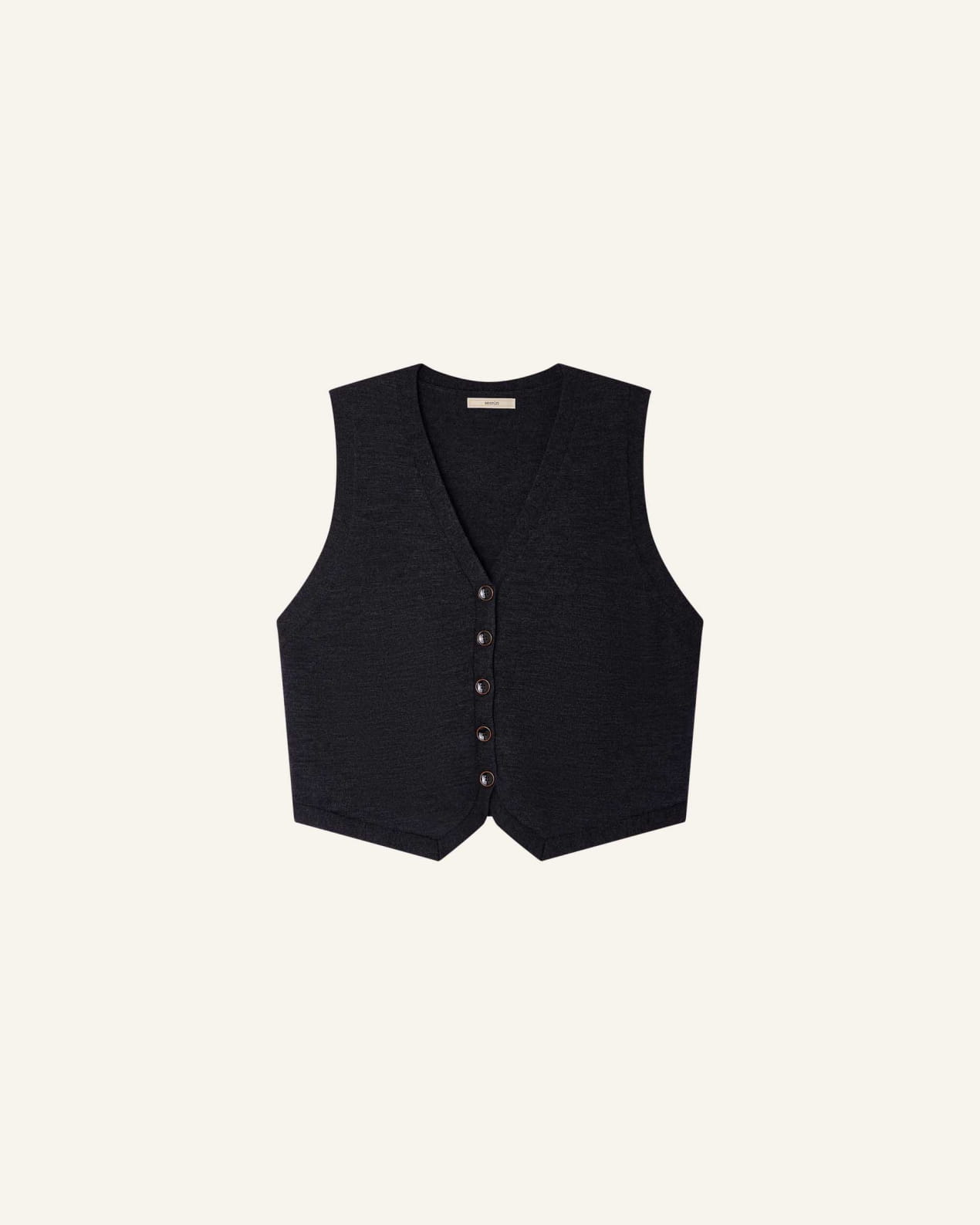 Sleeveless cardigan in a fine gauge Merino wool jersey knit.