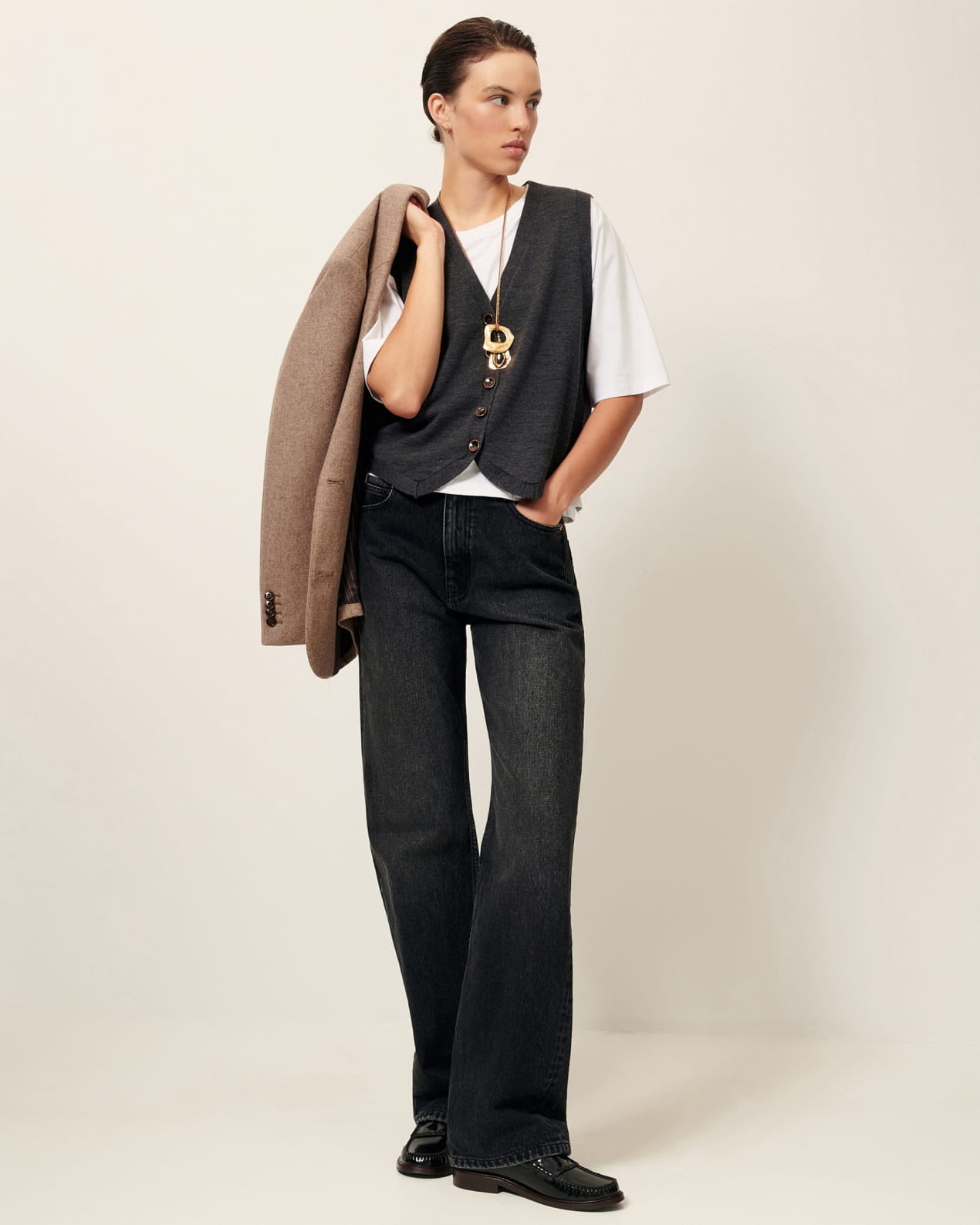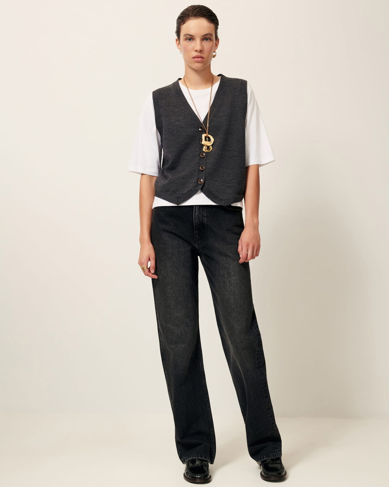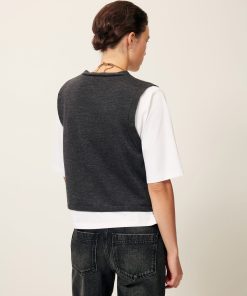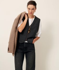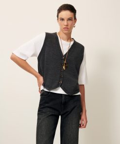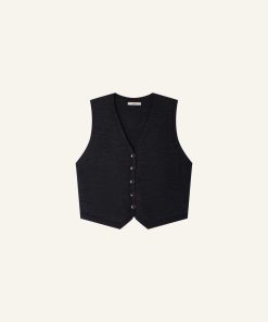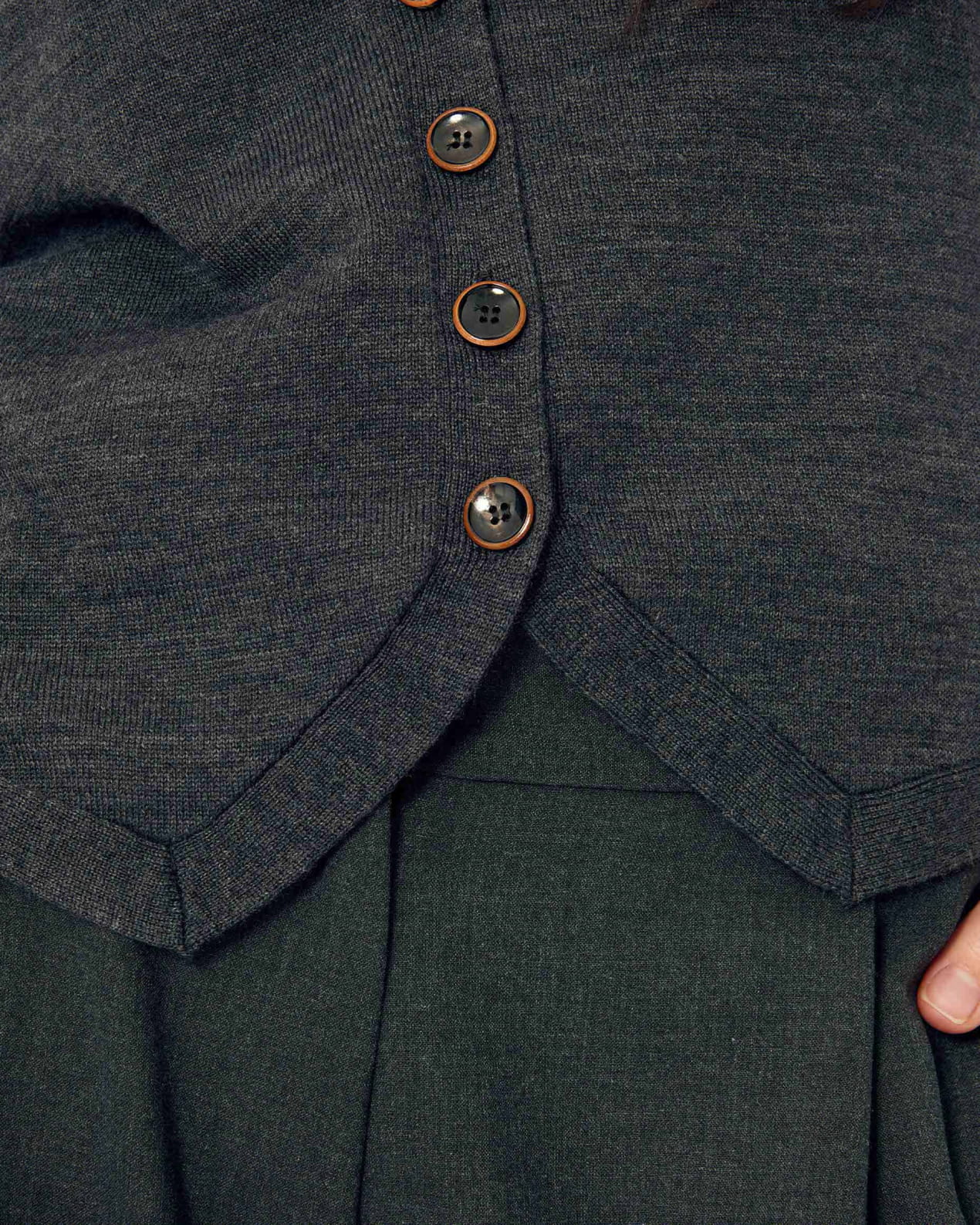 Sleeveless cardigan in a fine gauge Merino wool jersey knit.