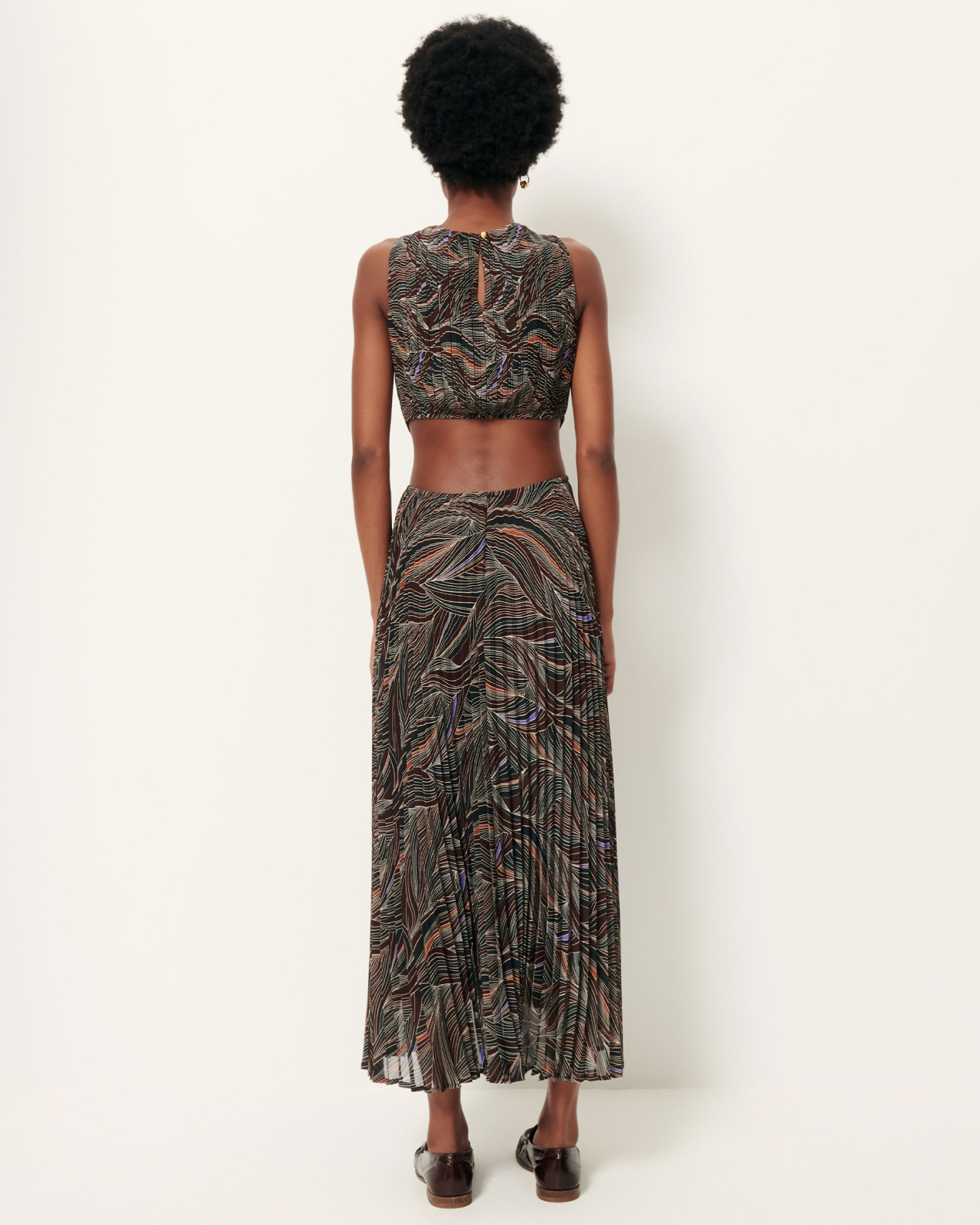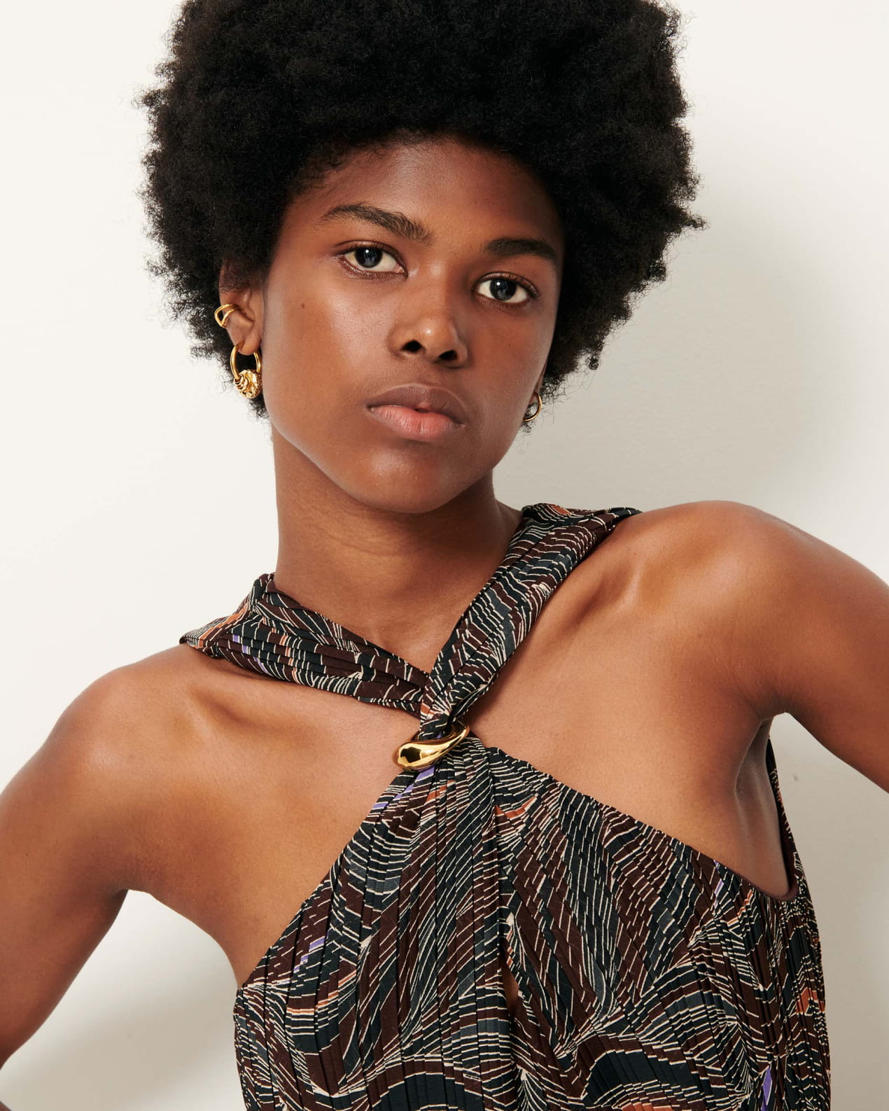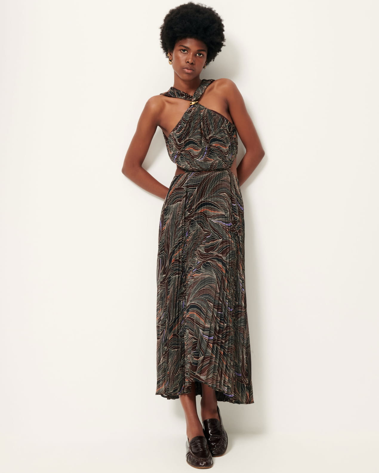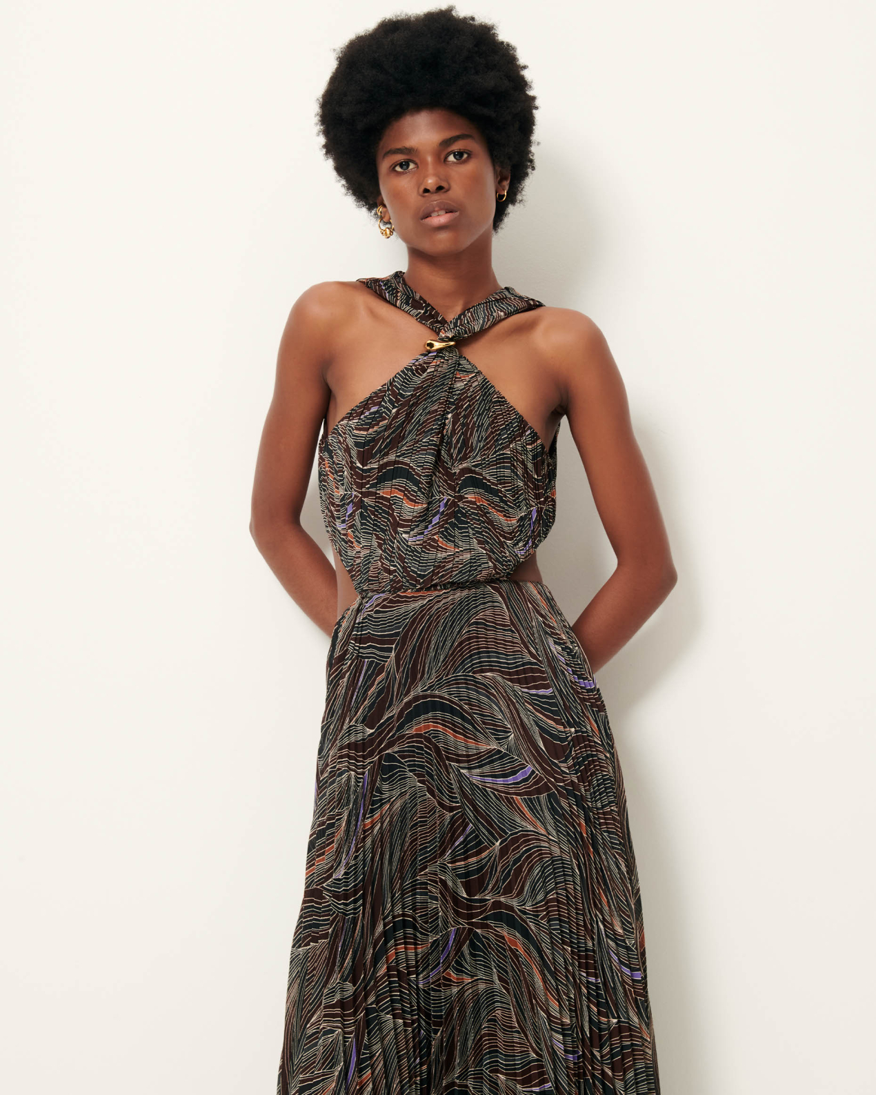 Long dress with scarf-style crossed straps in pleated, crinkled chiffon print, exclusive Sessùn pattern. Removable jewel brooch, exclusive to Sessùn.