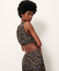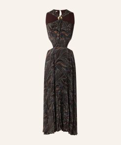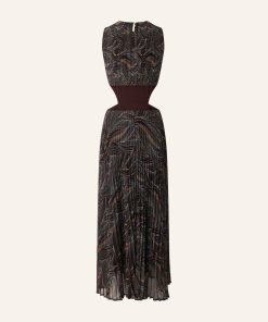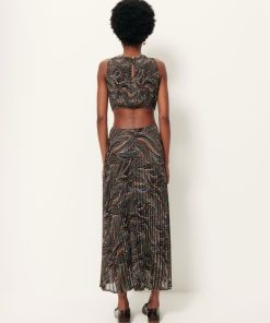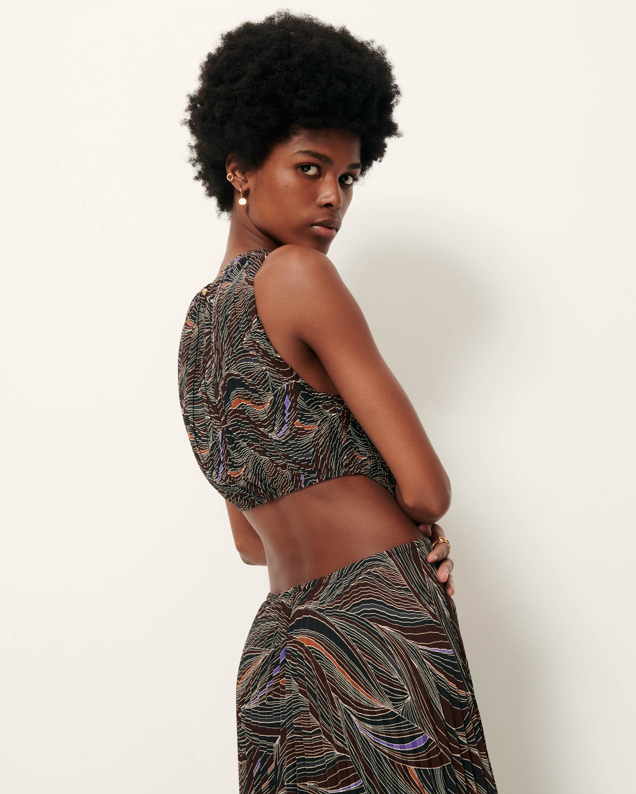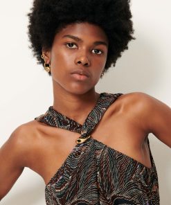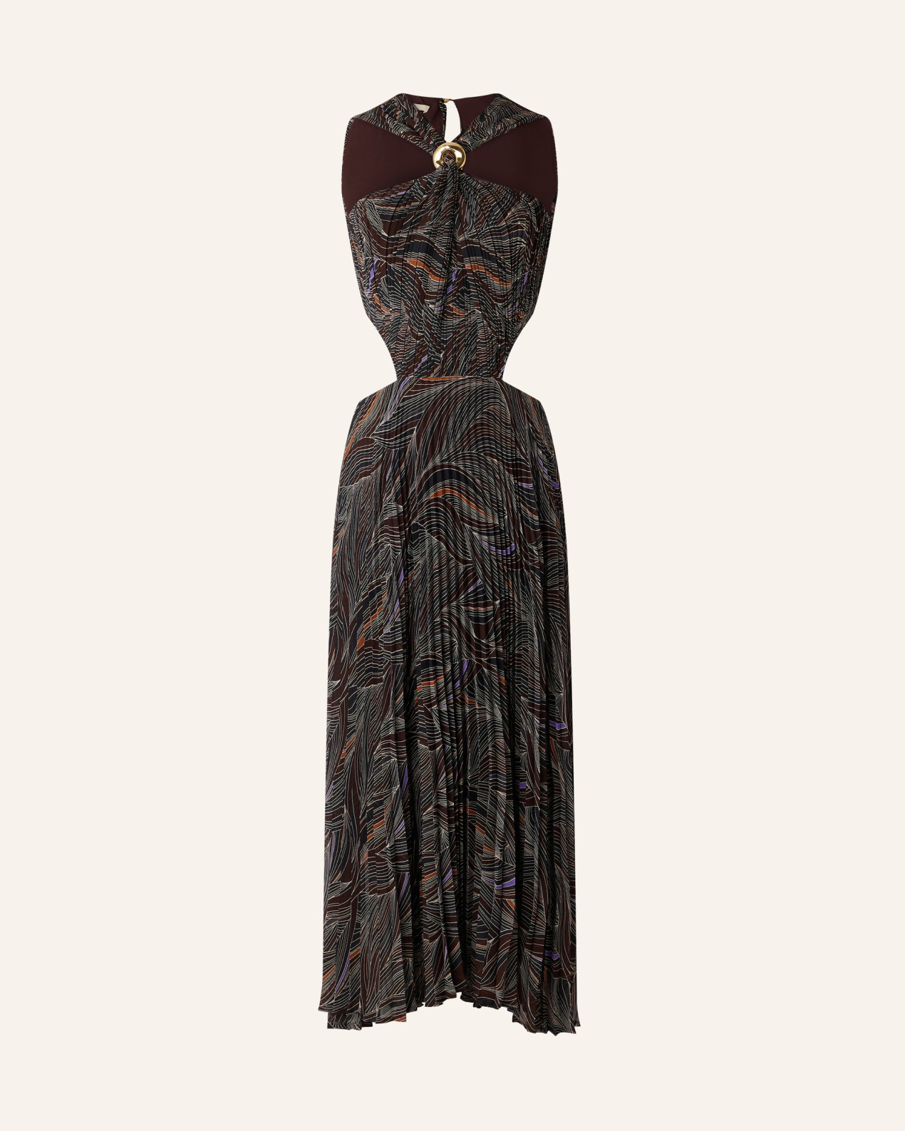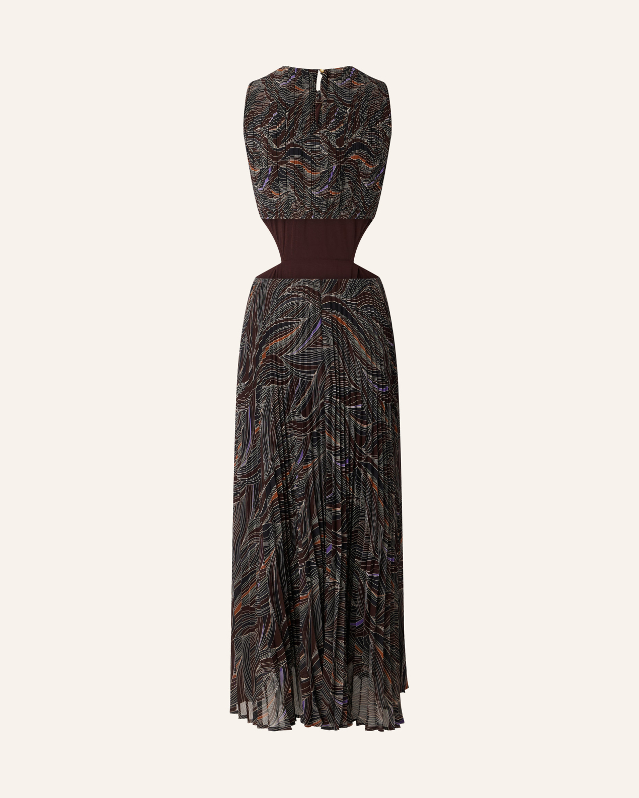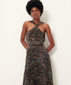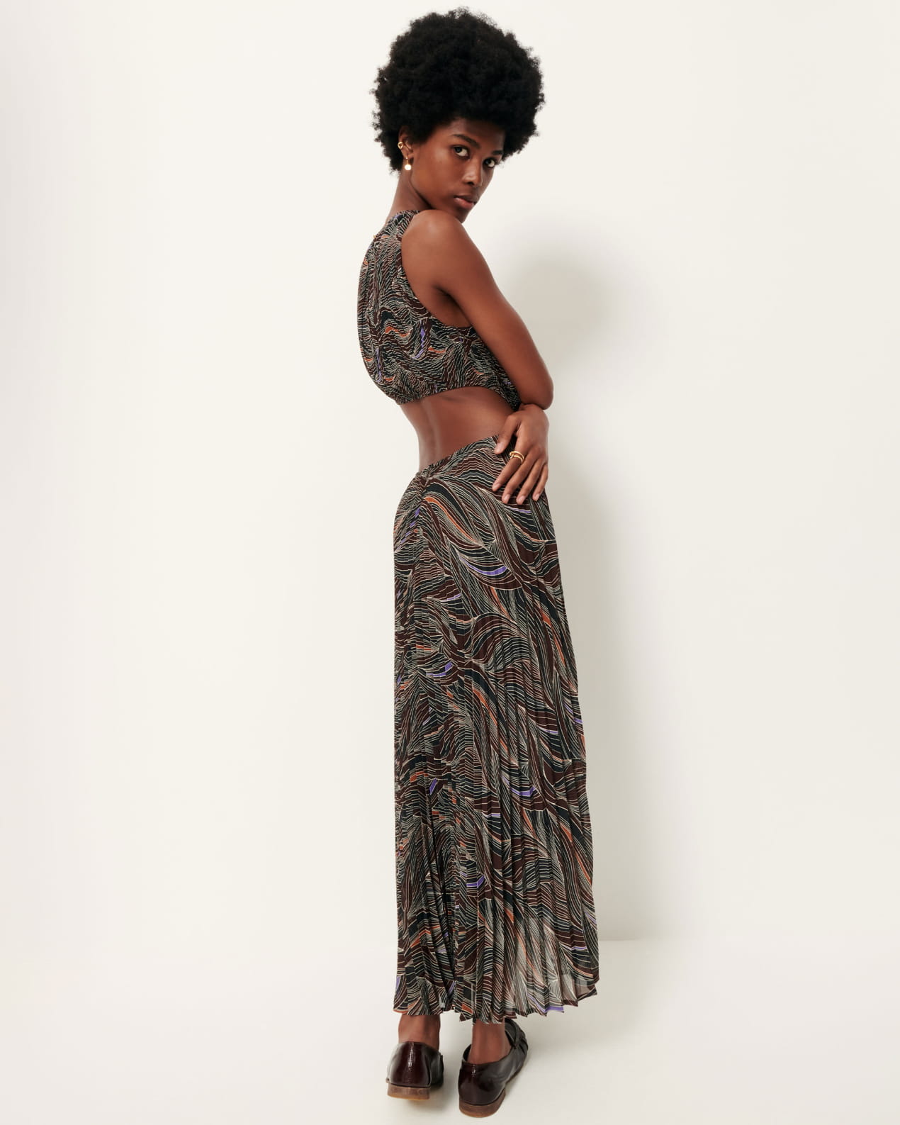 Long dress with scarf-style crossed straps in pleated, crinkled chiffon print, exclusive Sessùn pattern. Removable jewel brooch, exclusive to Sessùn.