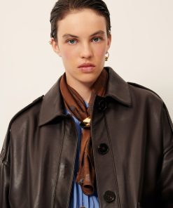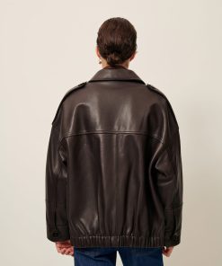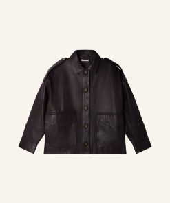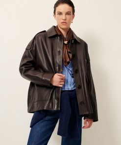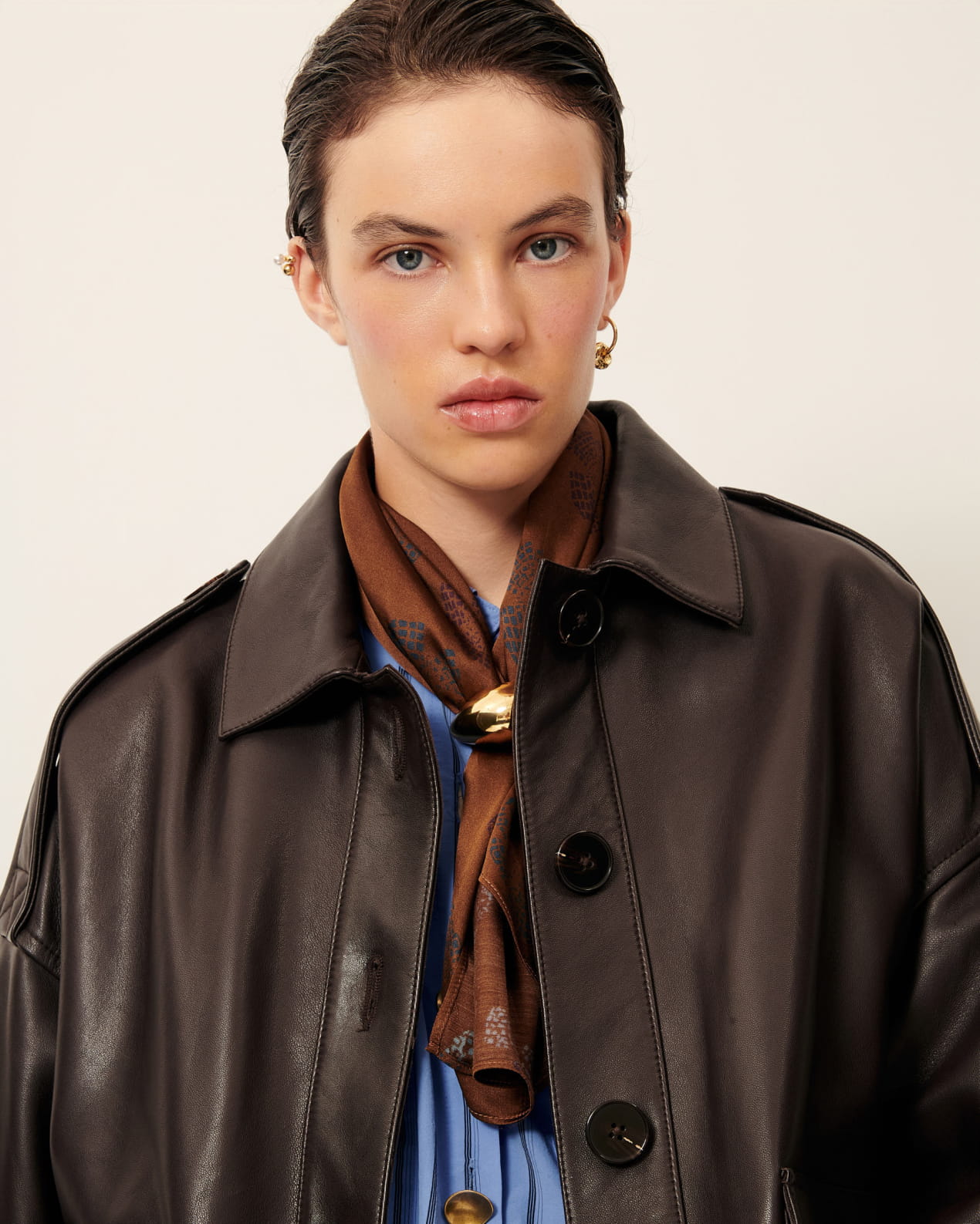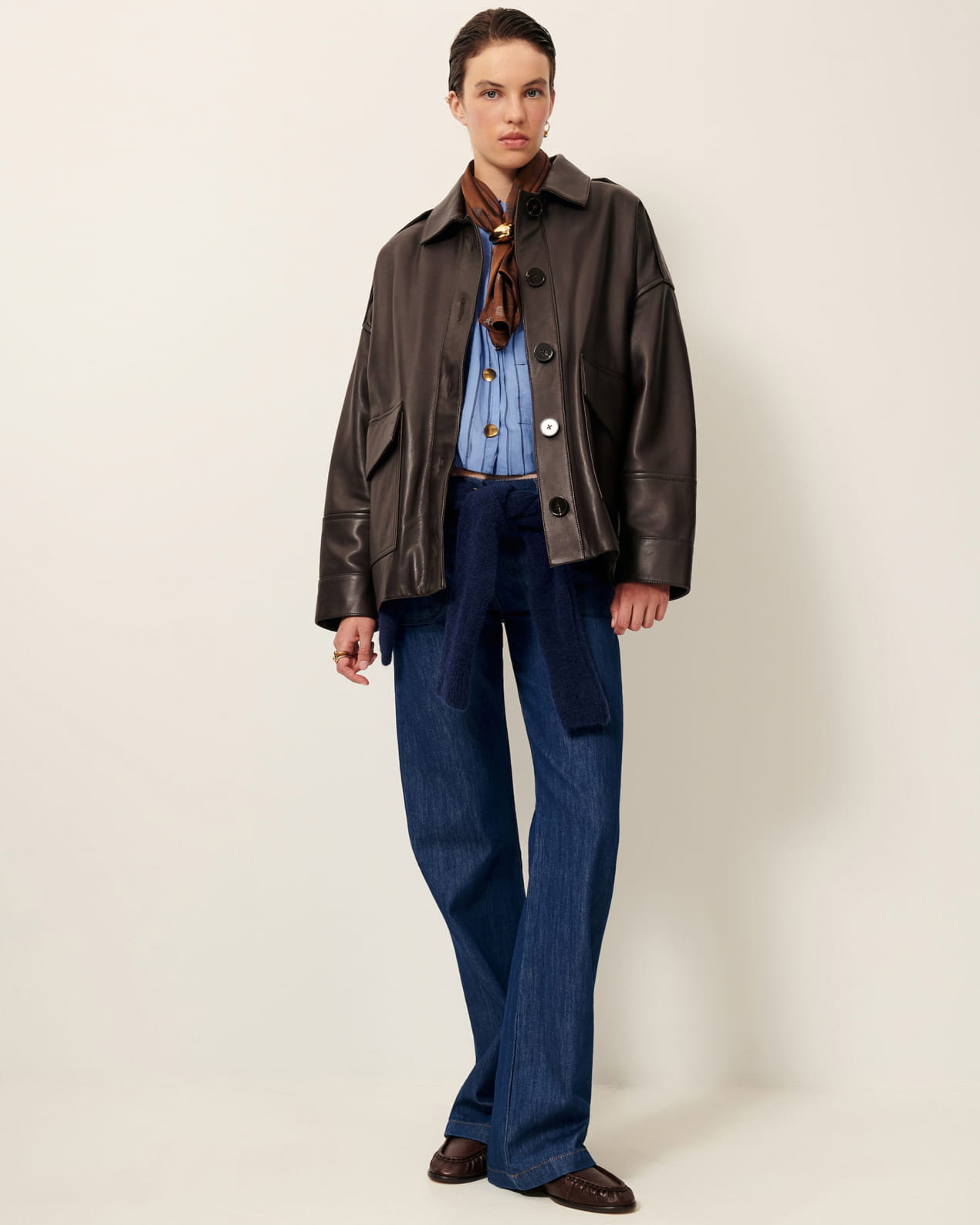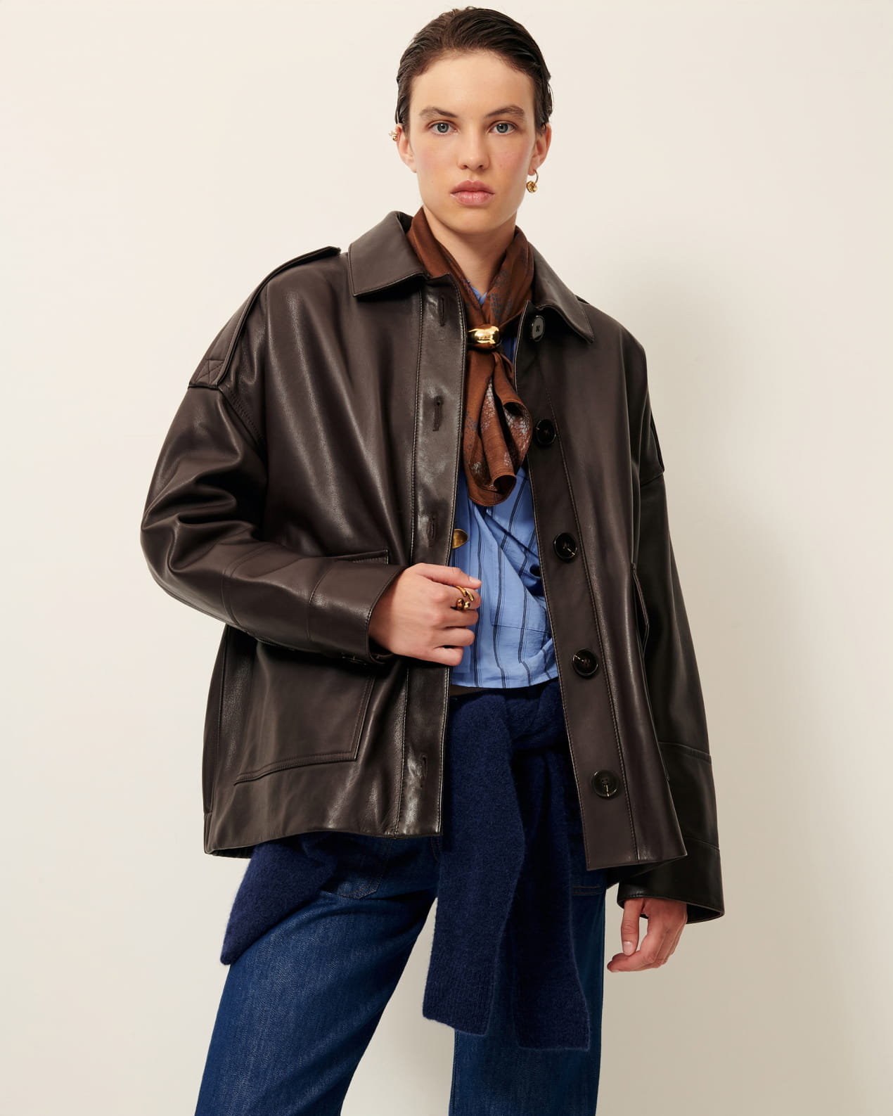 Short jacket with an elasticated back, patch pockets and button tabs on the shoulders in lamb leather.
