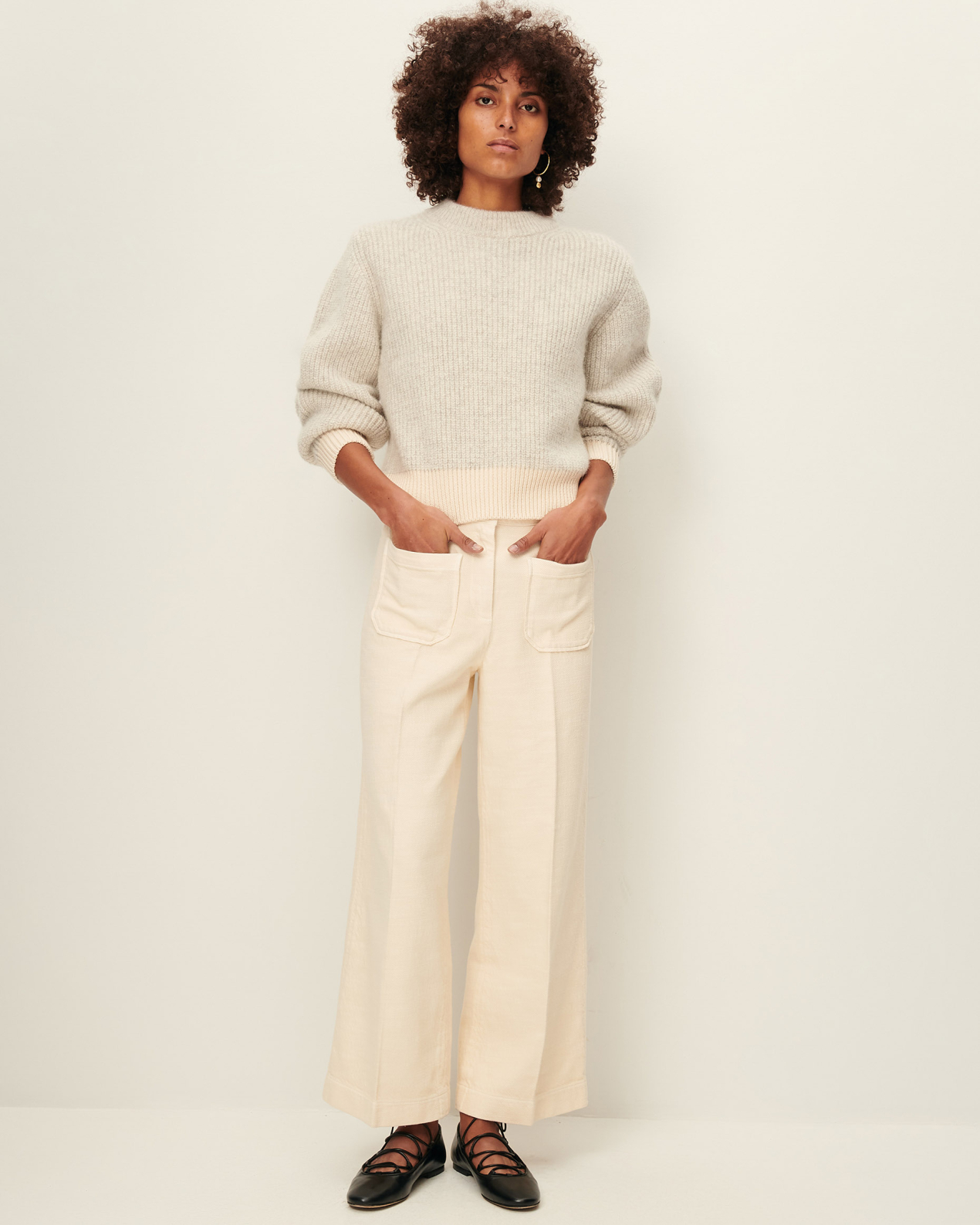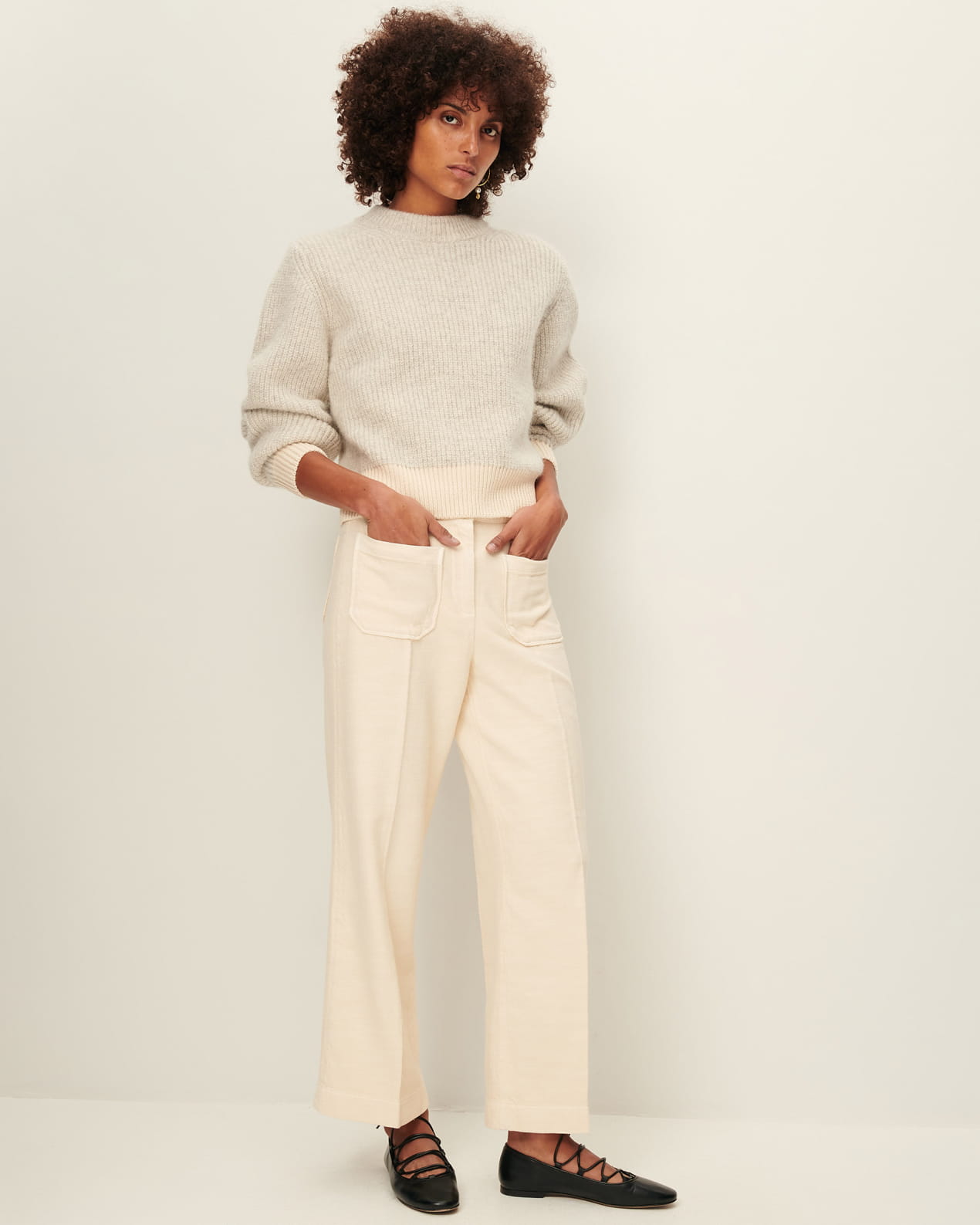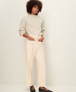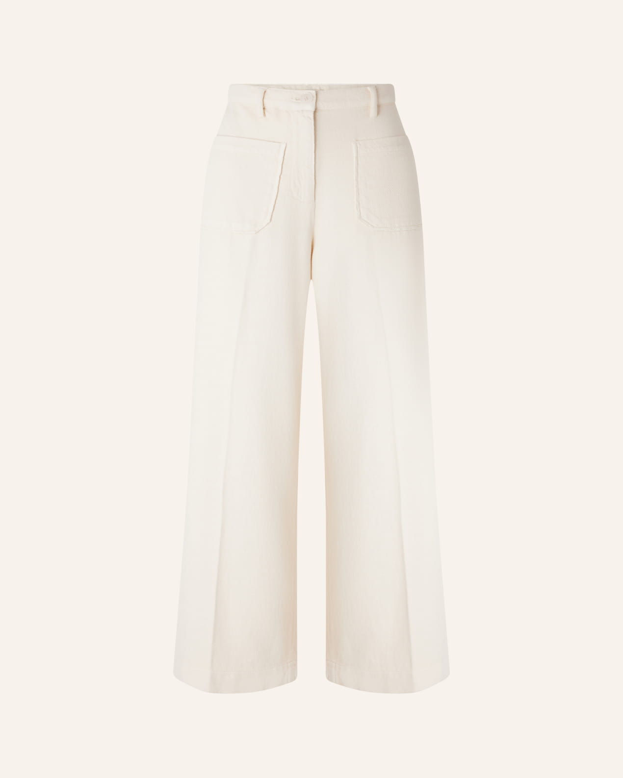 Straight 7/8-length trousers with sharp pleats and front and back patch pockets, in organic cotton tricotine twill, woven in Spain.