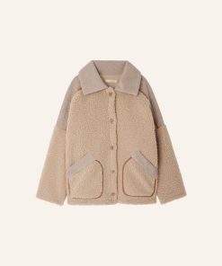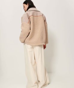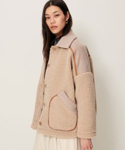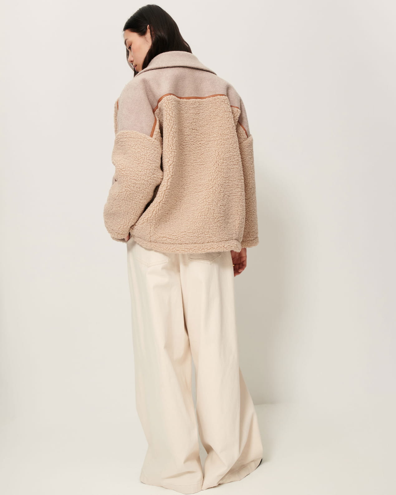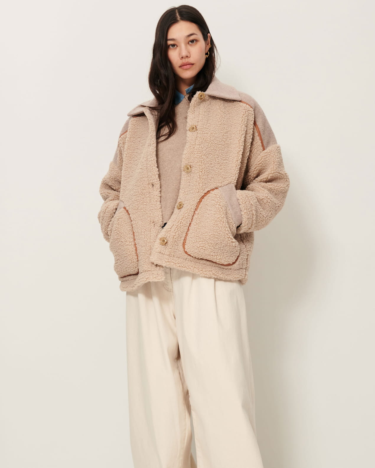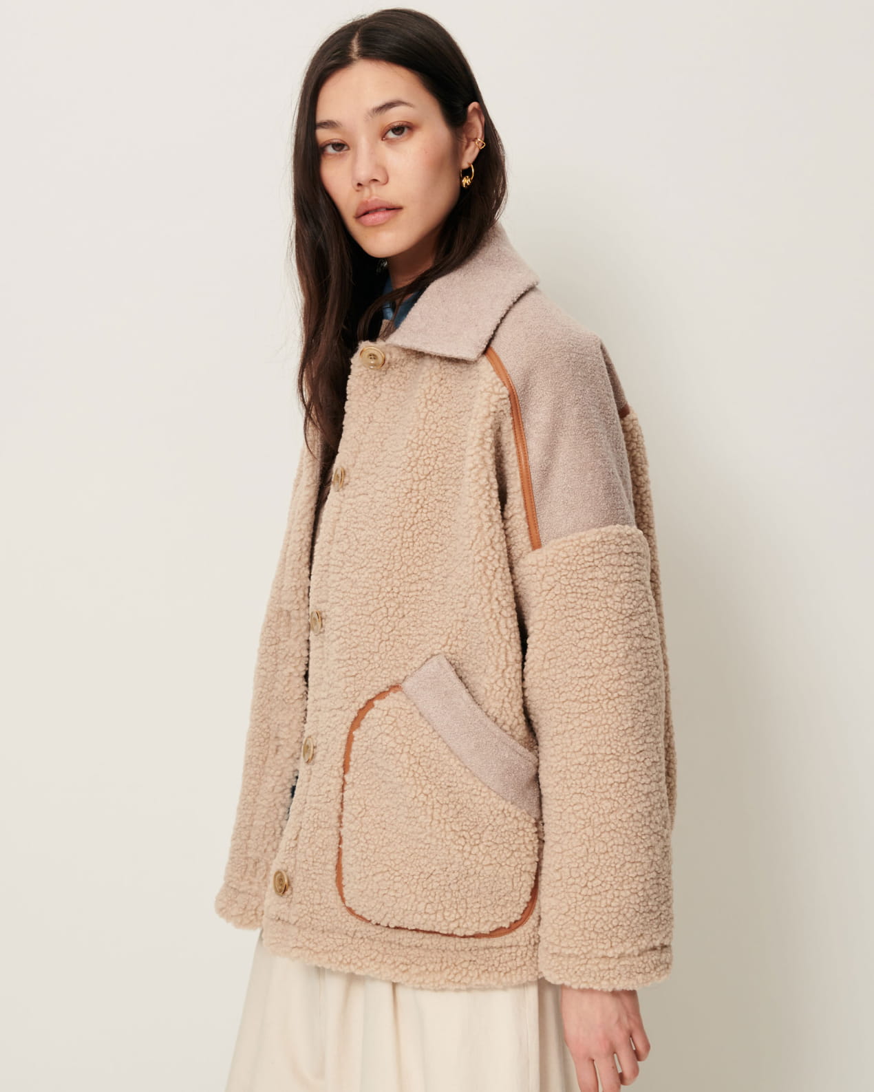 Loose-fitting buttoned jacket featuring patch pockets in a faux sheepskin-style looped yarn weave, with double-weave looped yarn insets, and faux leather trim.