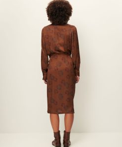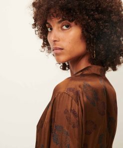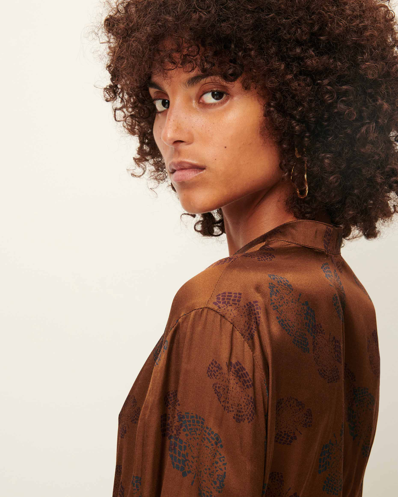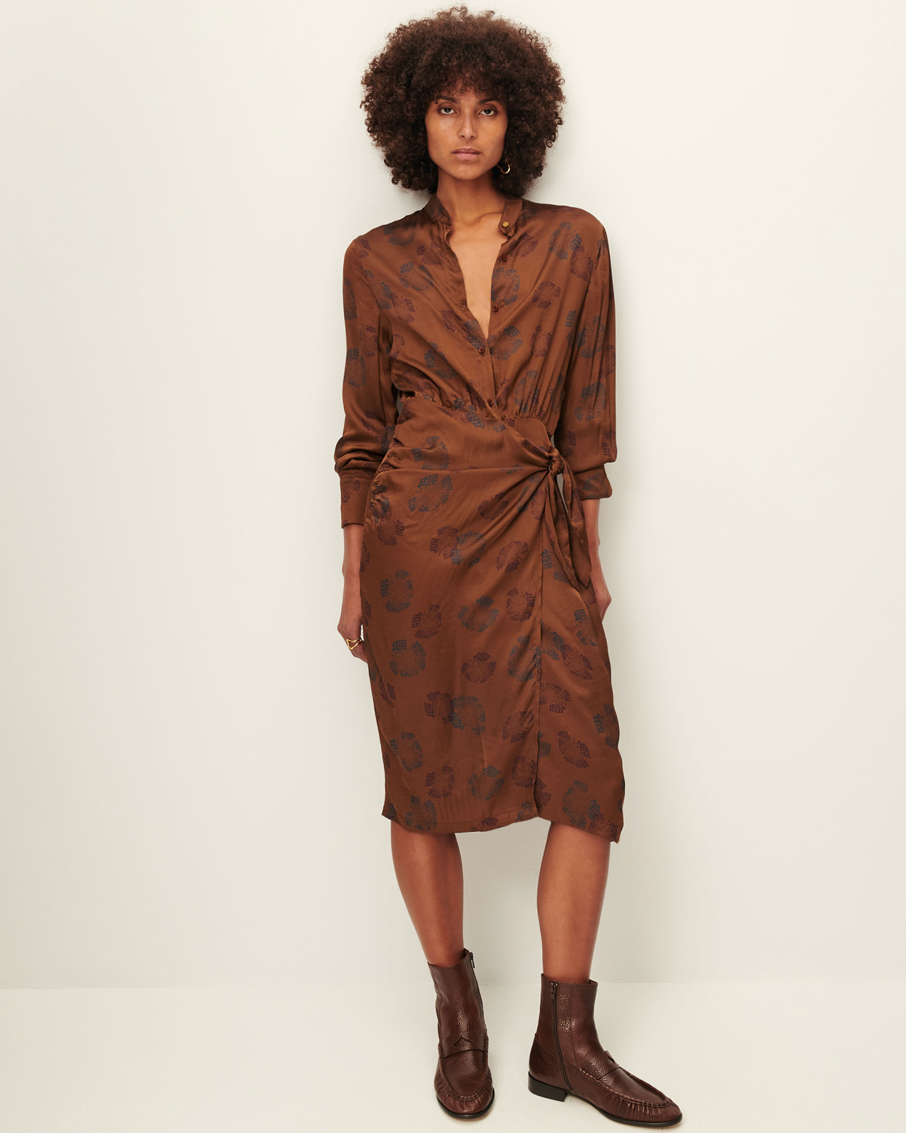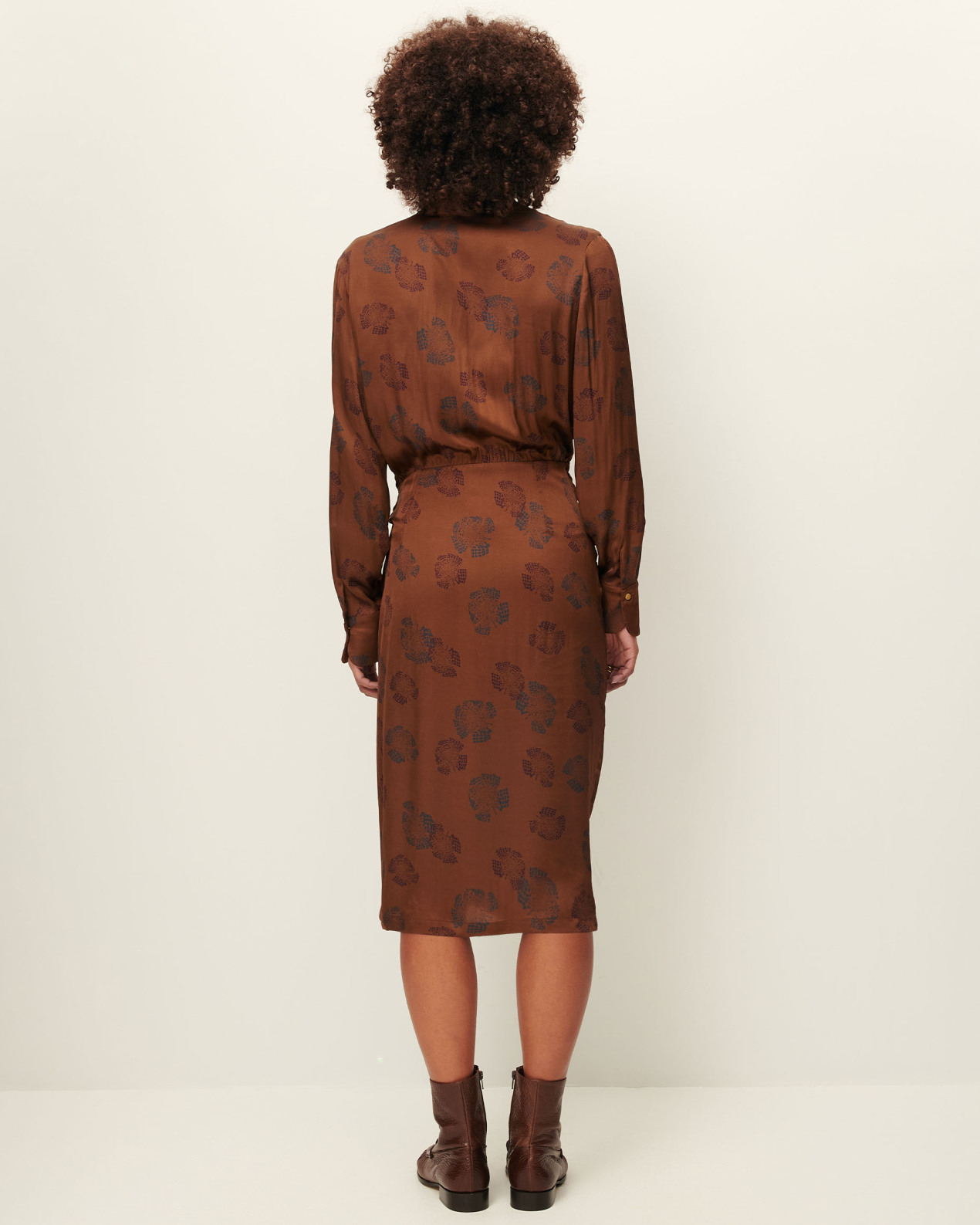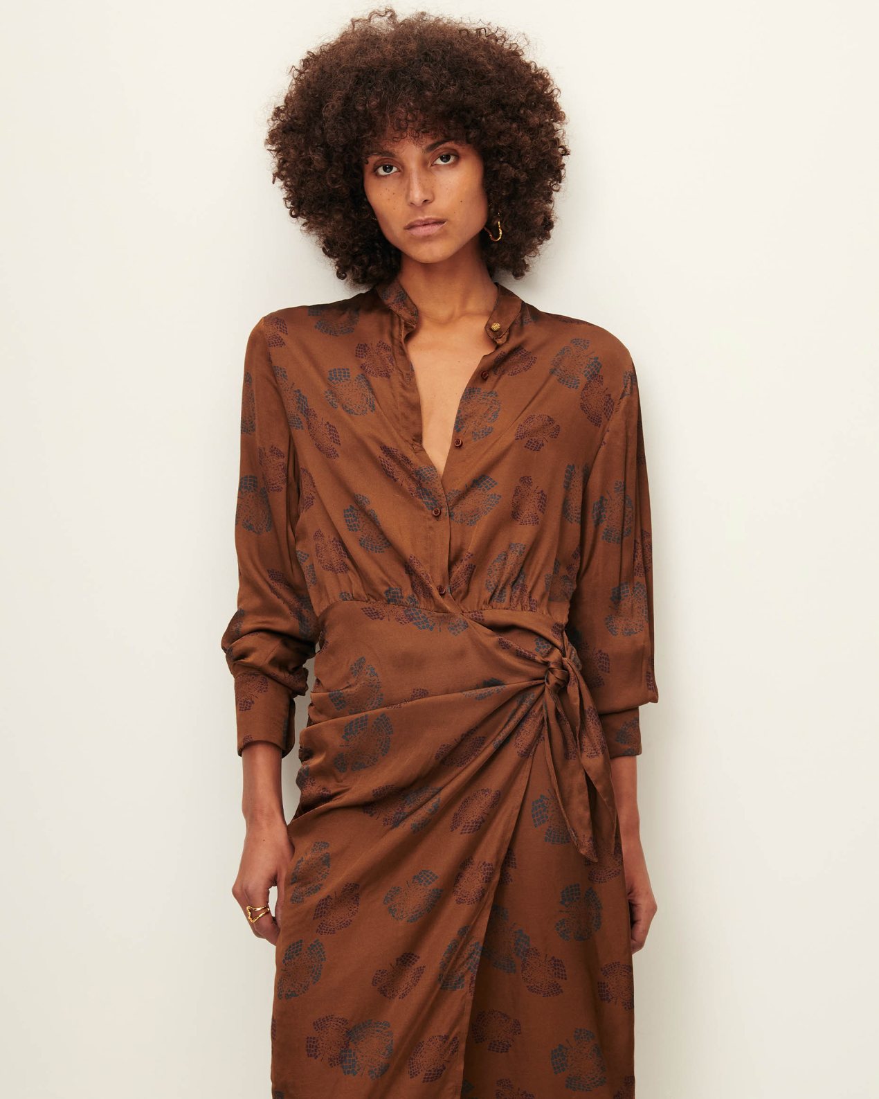 Mid-length wrap shirt dress in fluid viscose satin, printed in Italy, exclusive Sessùn pattern.
