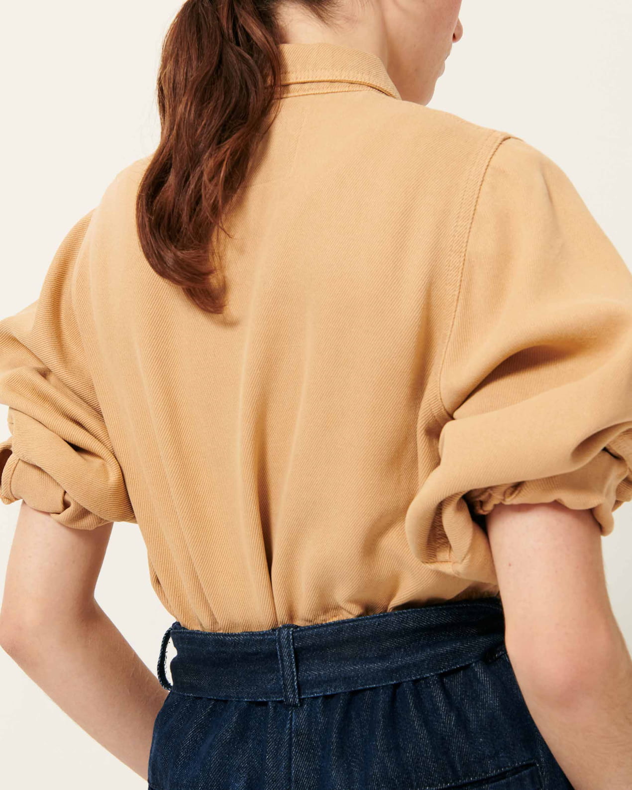 Overshirt with balloon sleeves made from soft, garment-dyed Tencel drill, woven in Spain.