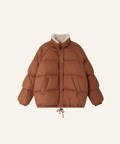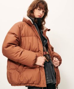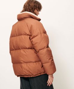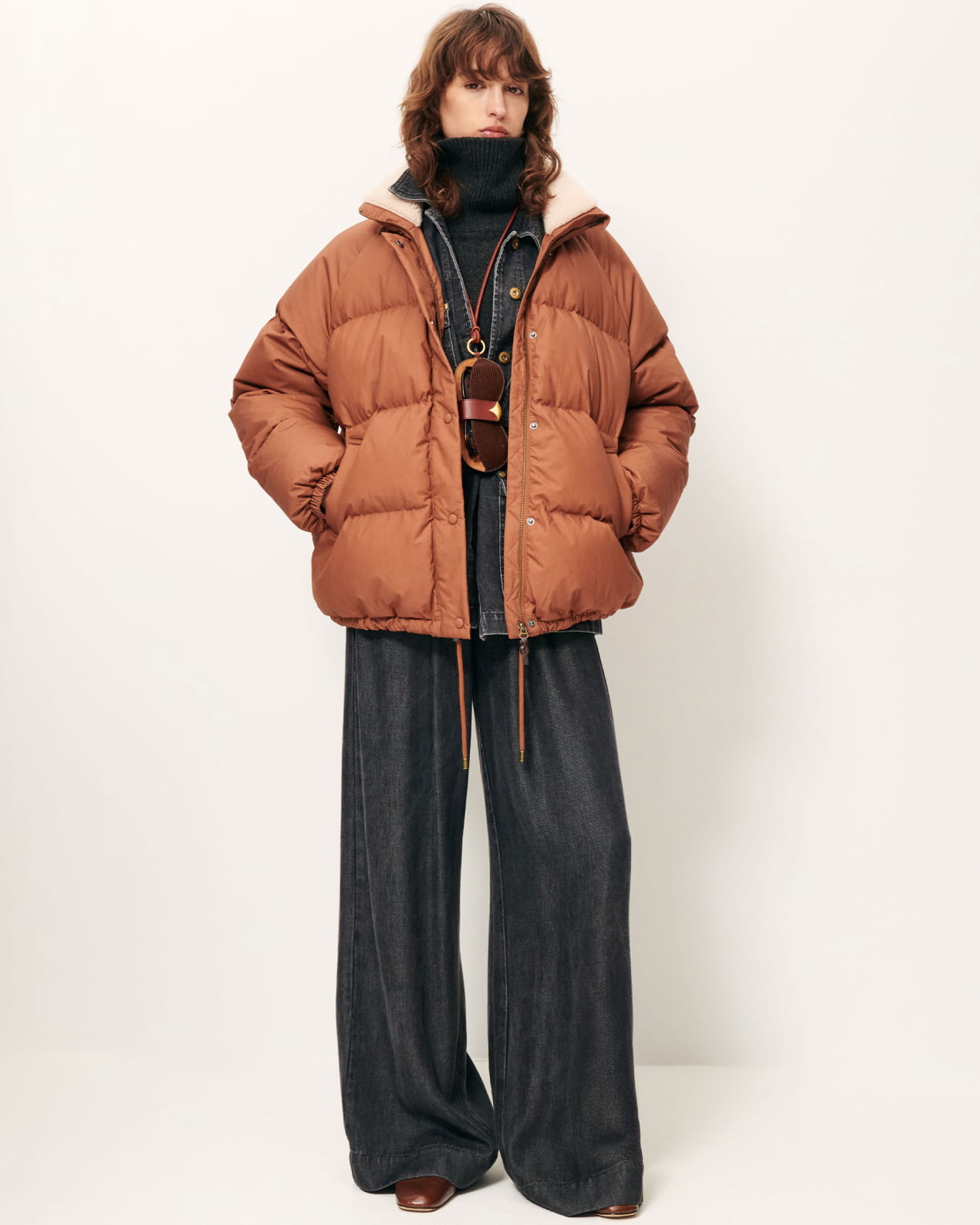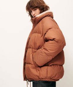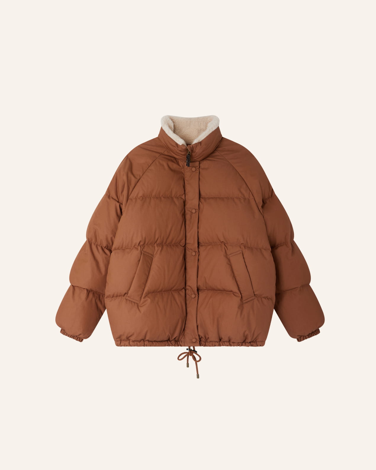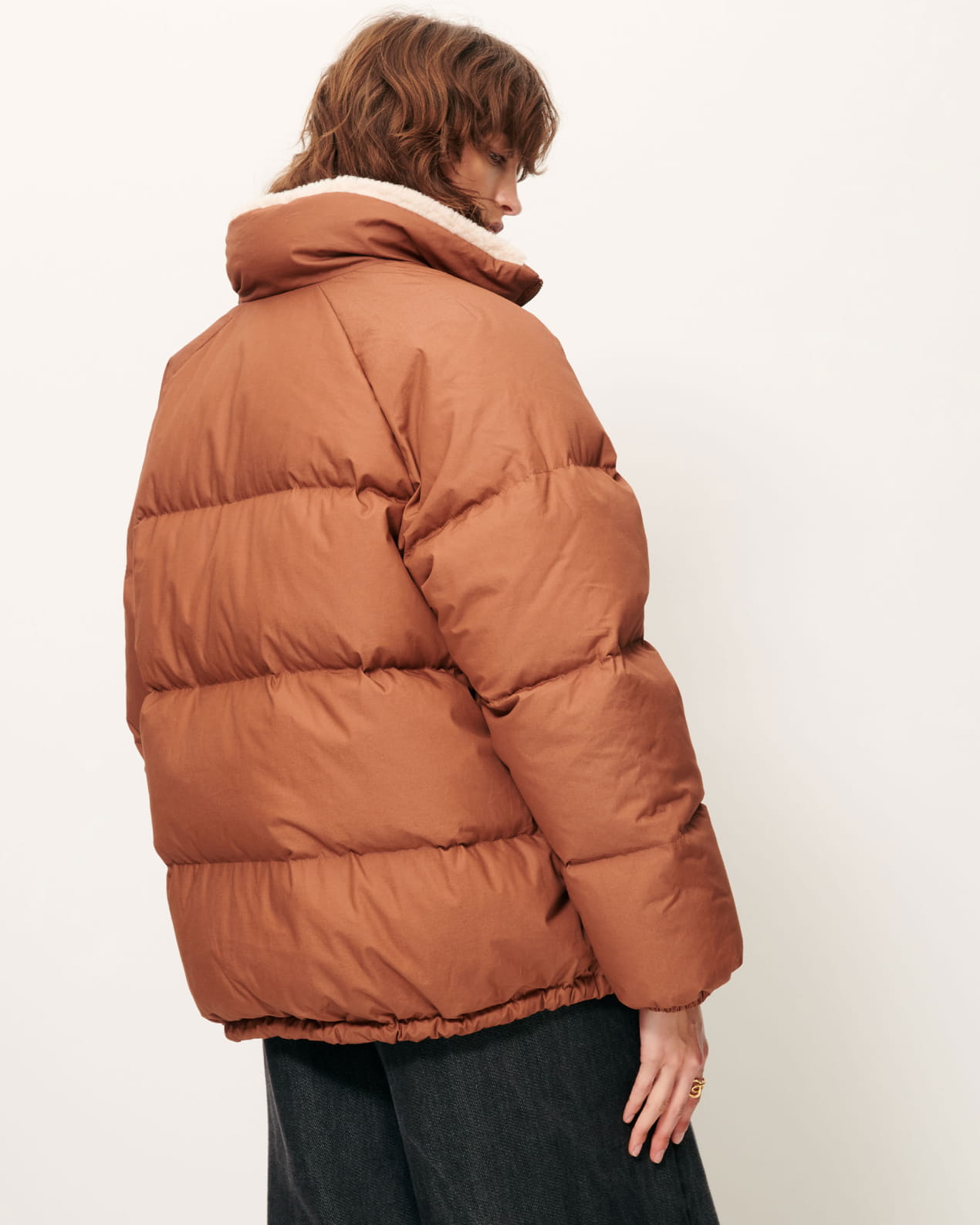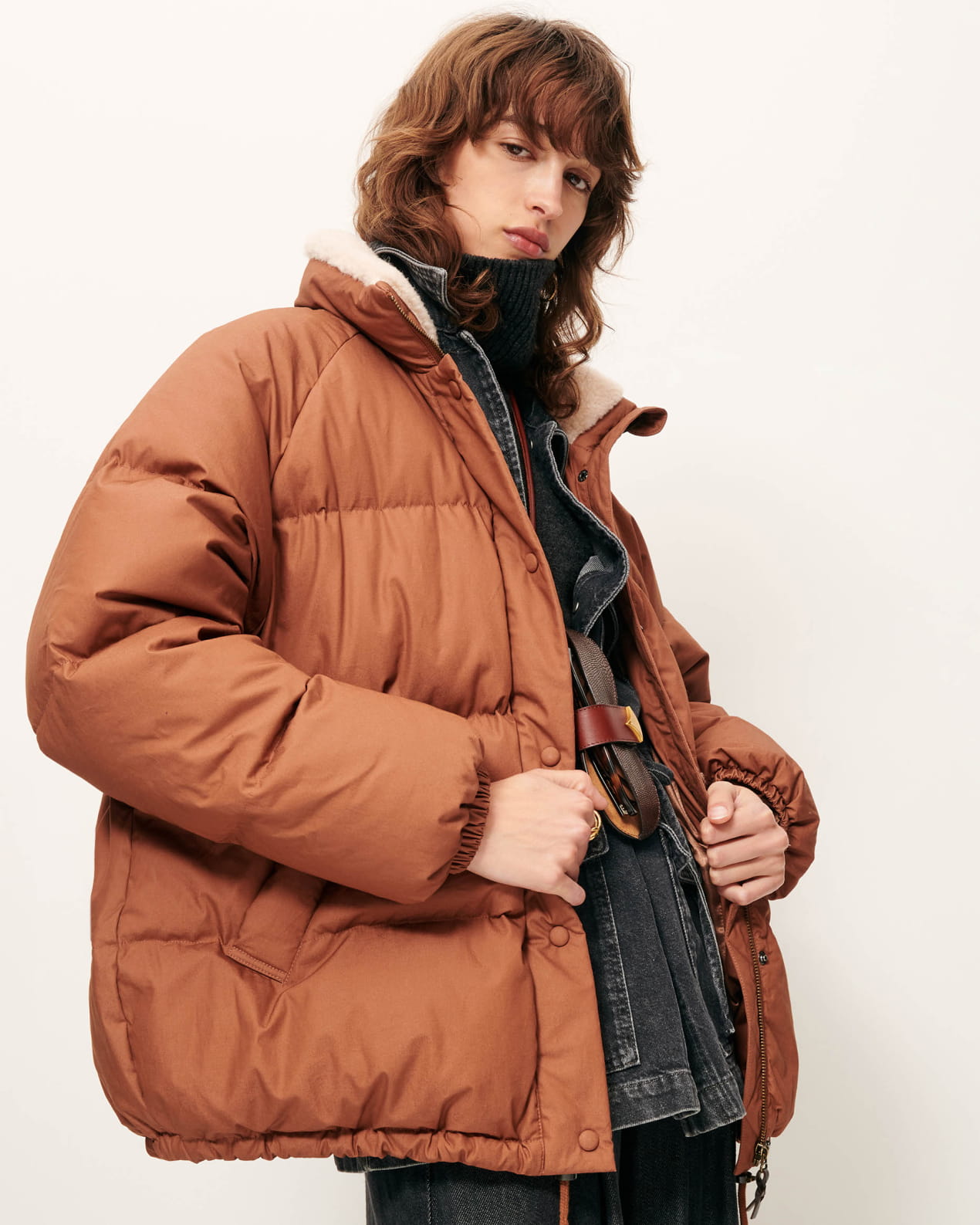 Oversized puffer jacket with a high collar lined with faux sheepskin in compact, padded, shower-resistant cotton filled with down and feathers of certified natural origin.
