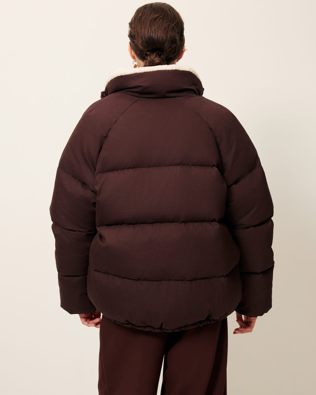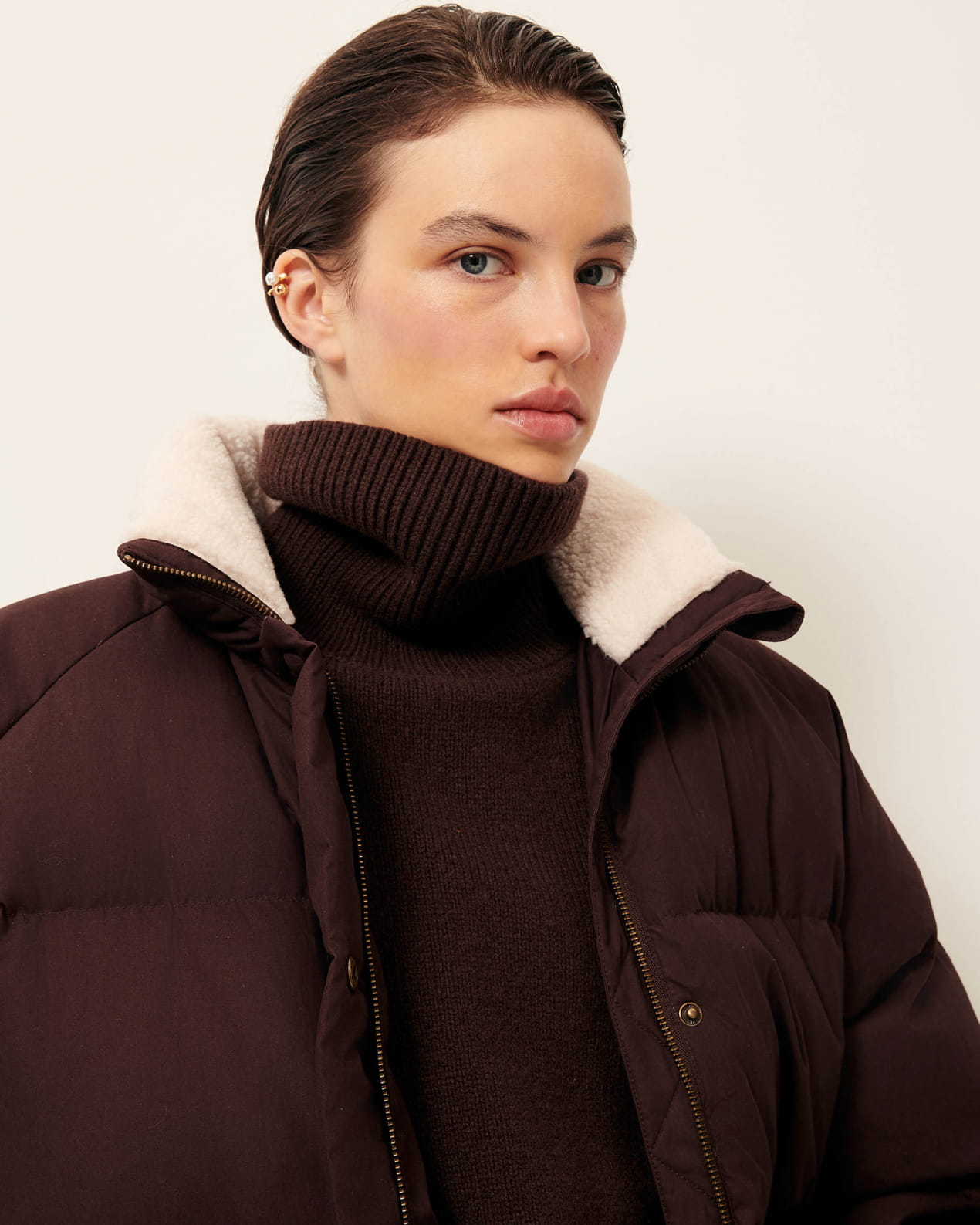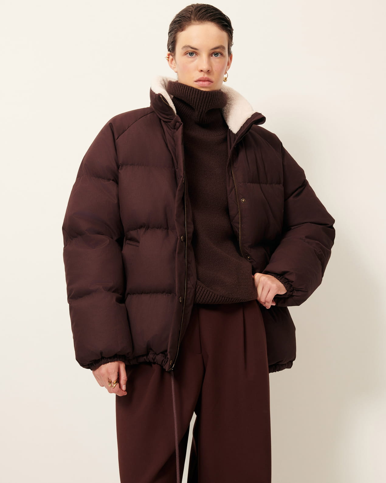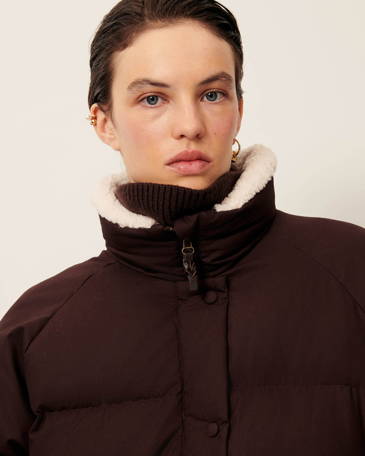 Oversized padded jacket with a high collar in imitation sheepskin in a showerproof compact cotton fabric padded with feather and down of certified natural origin.