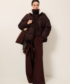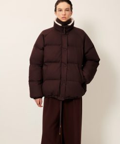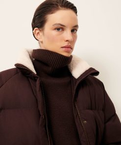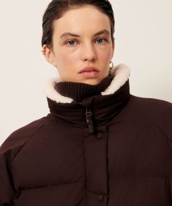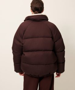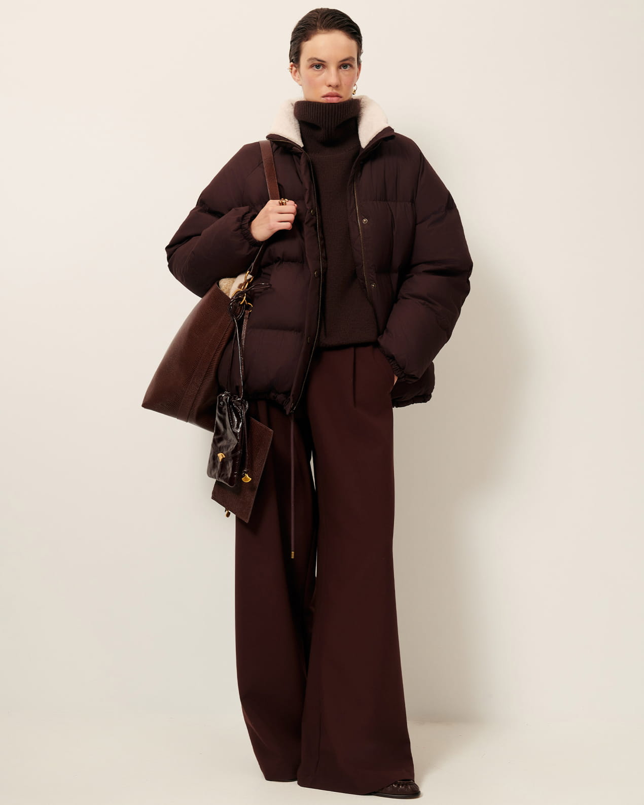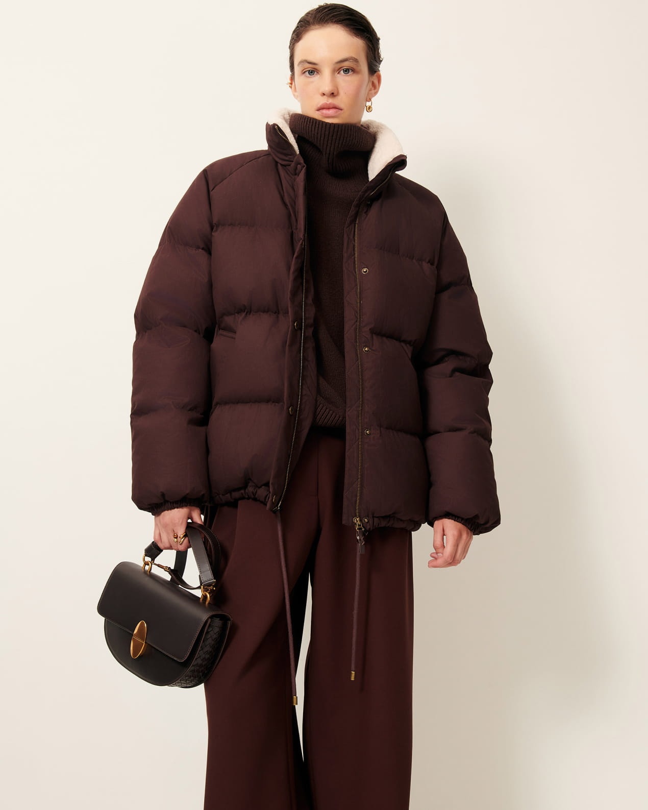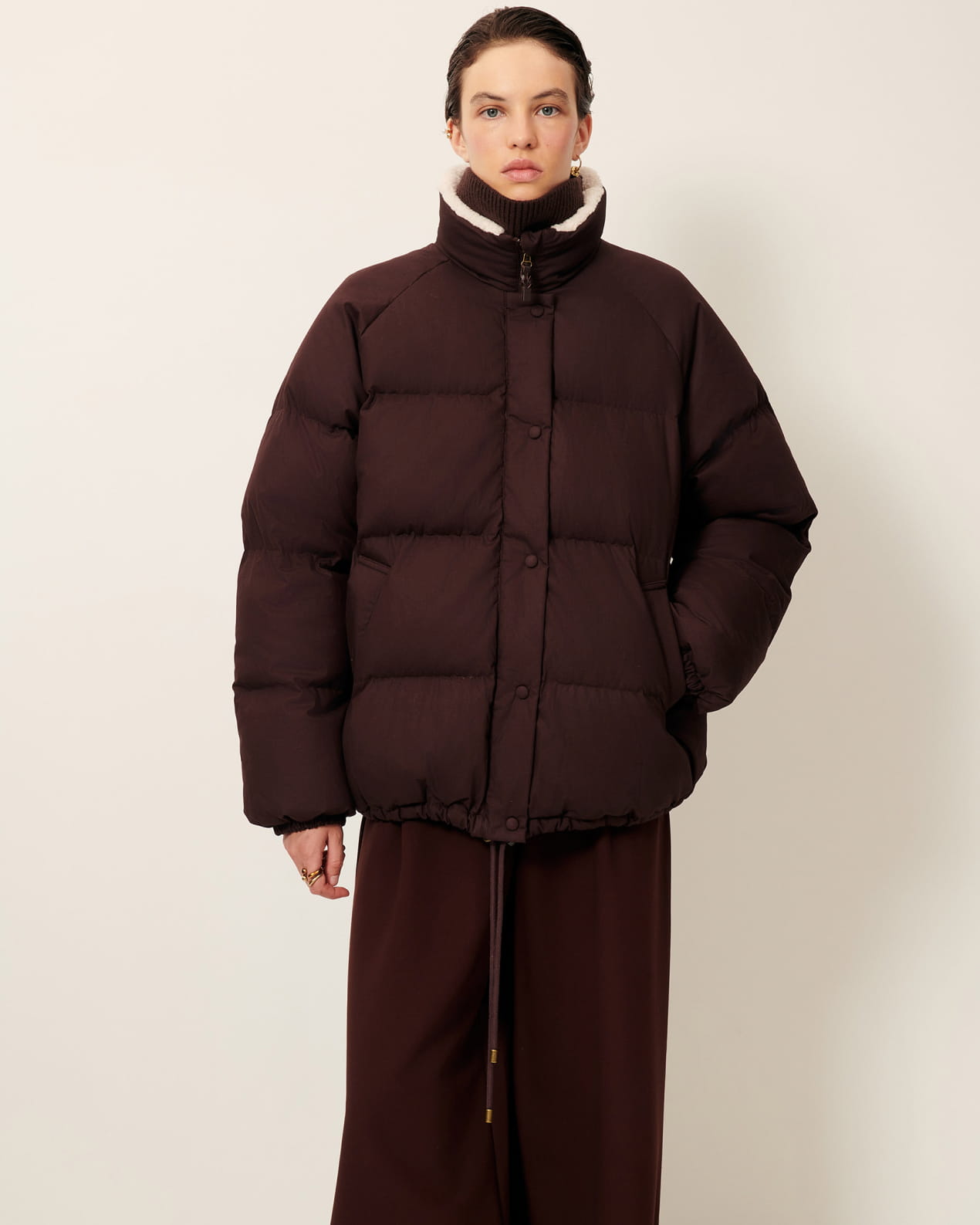 Oversized padded jacket with a high collar in imitation sheepskin in a showerproof compact cotton fabric padded with feather and down of certified natural origin.