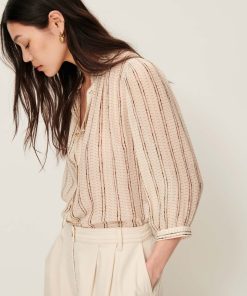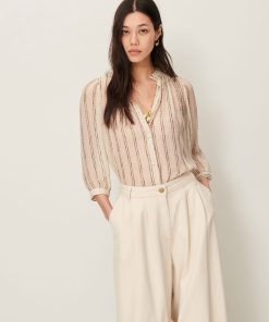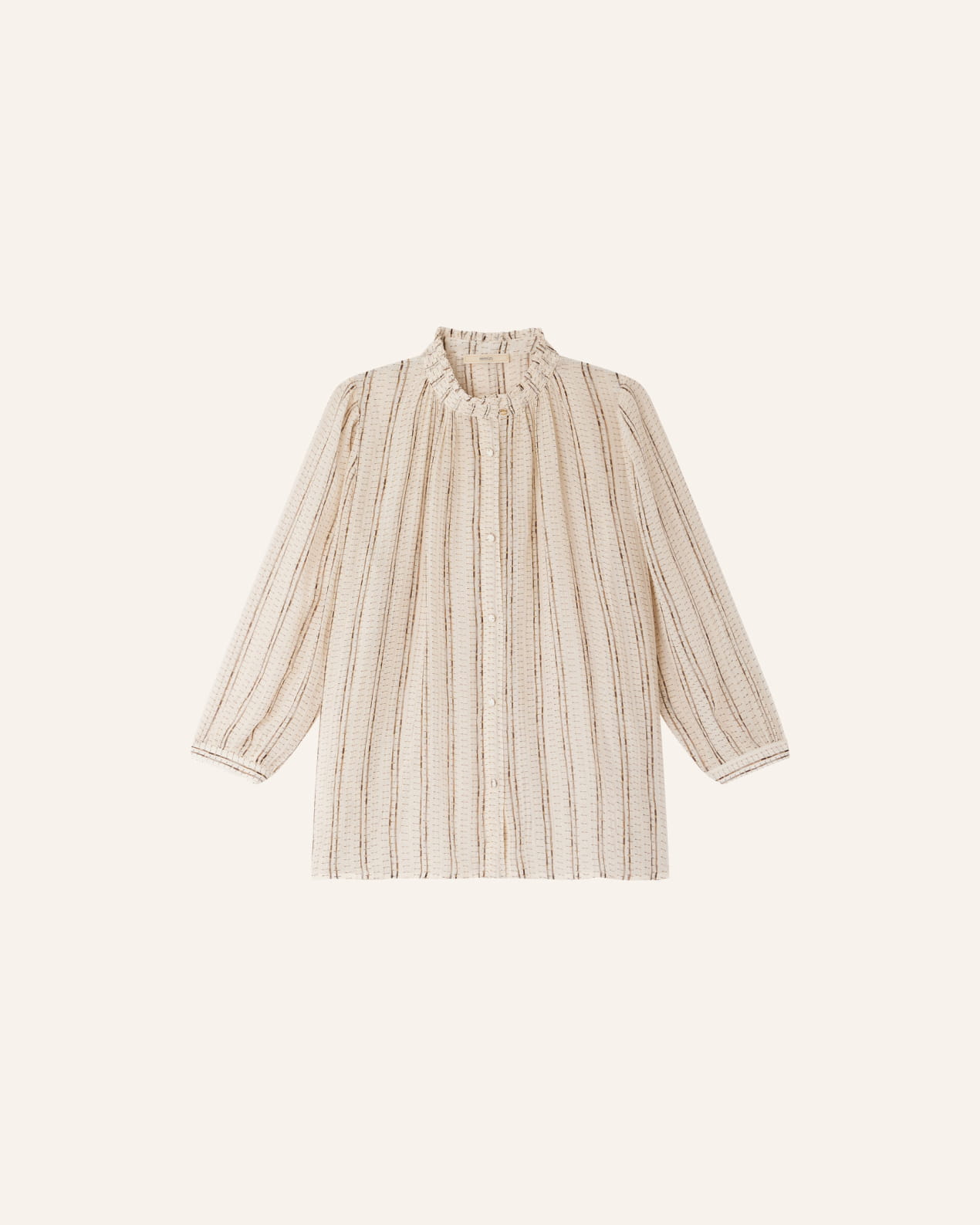 Blouse with a ruffle collar in a viscose silk chiffon crepe print, with fine metallic stripes, exclusive Sessùn pattern.