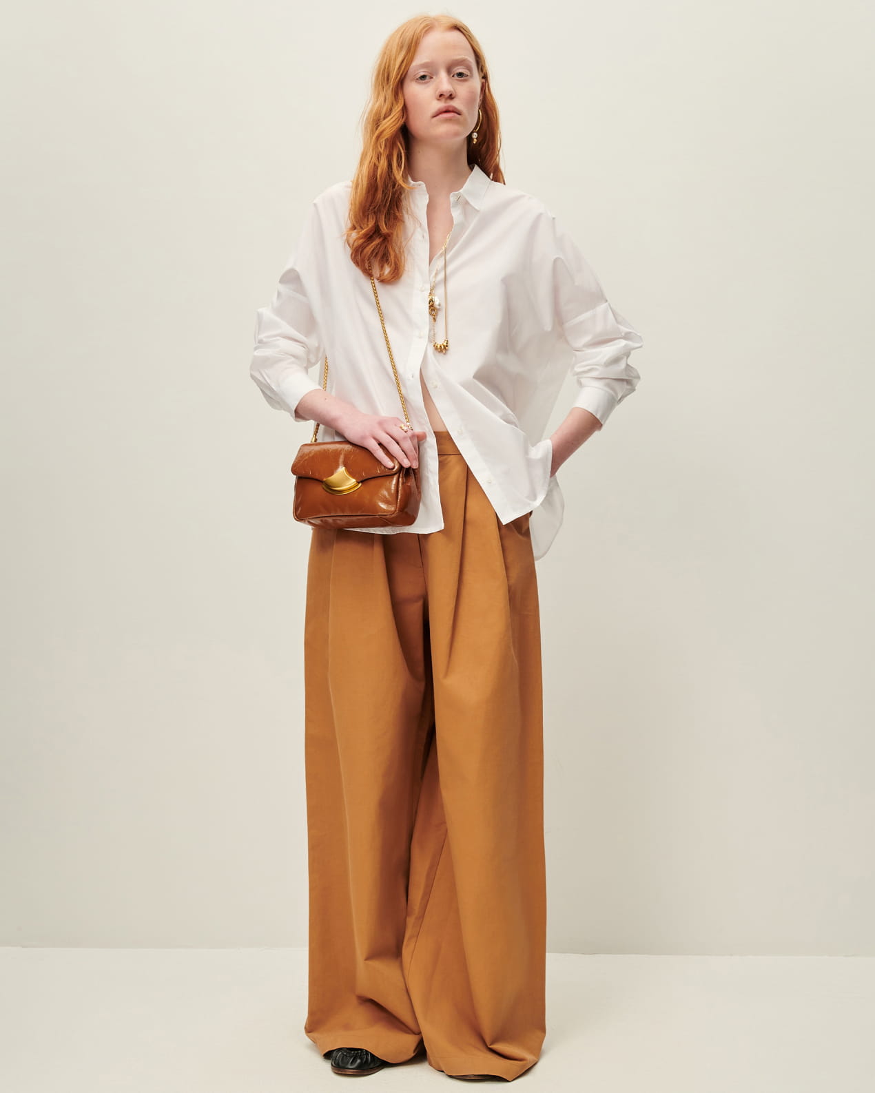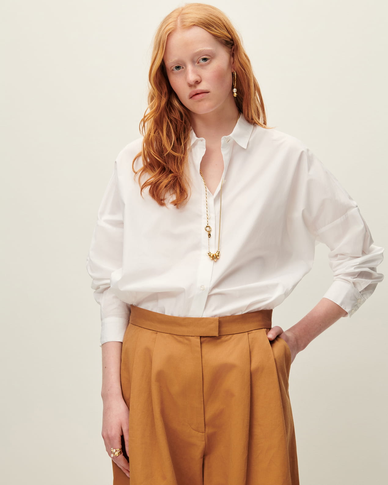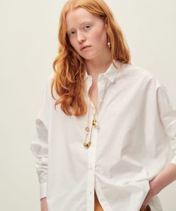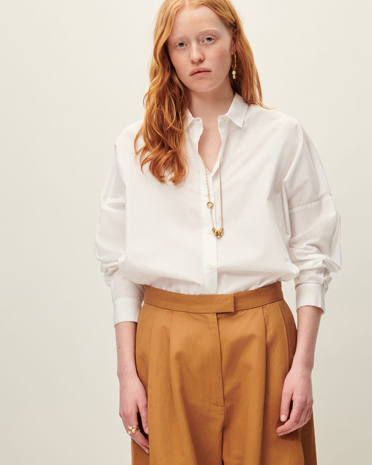 Loose-fitting shirt with drop shoulders in compact organic cotton poplin, woven in Italy.