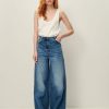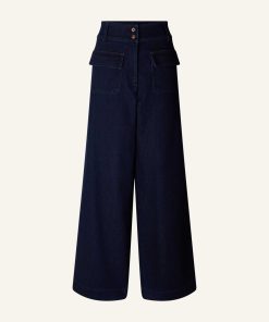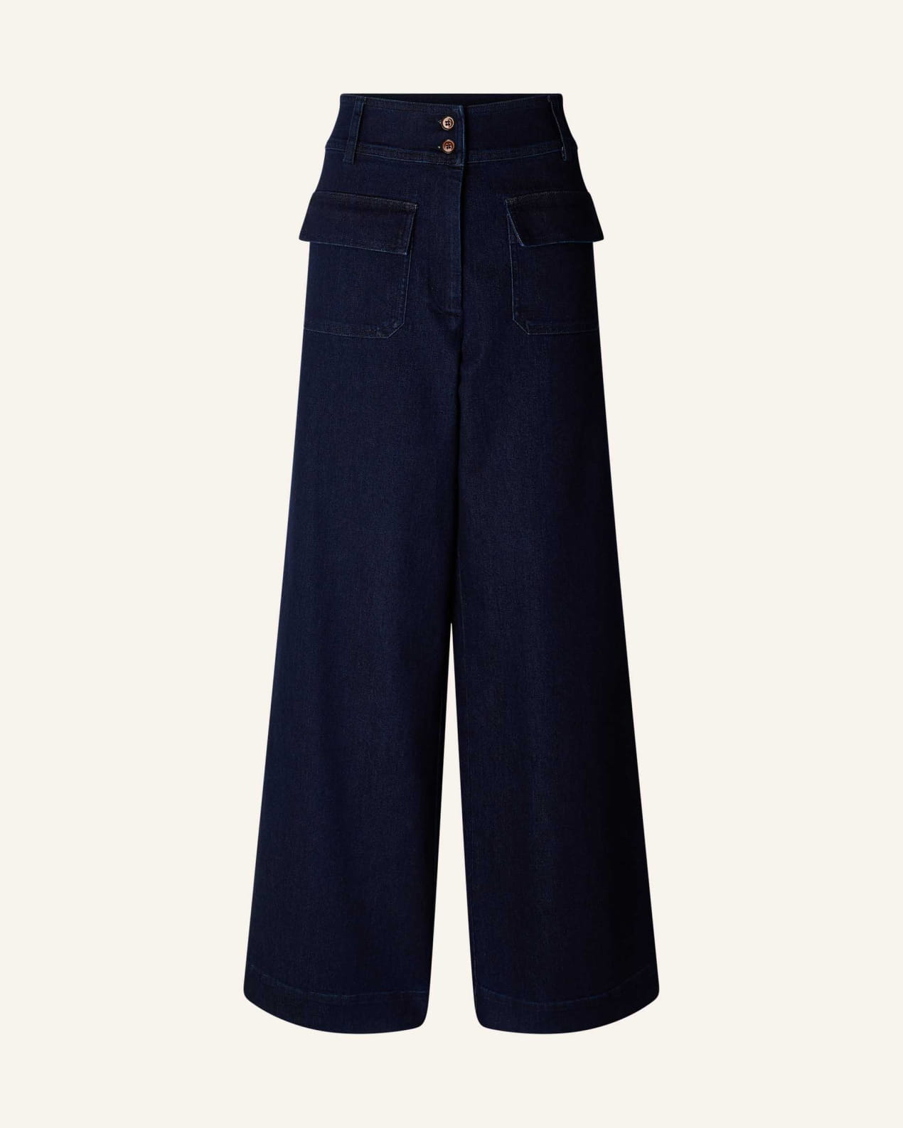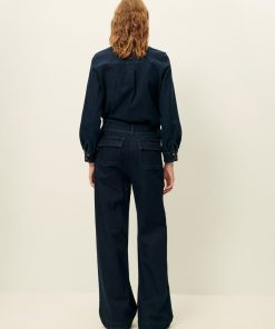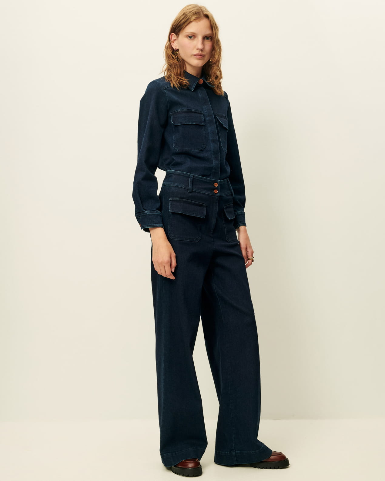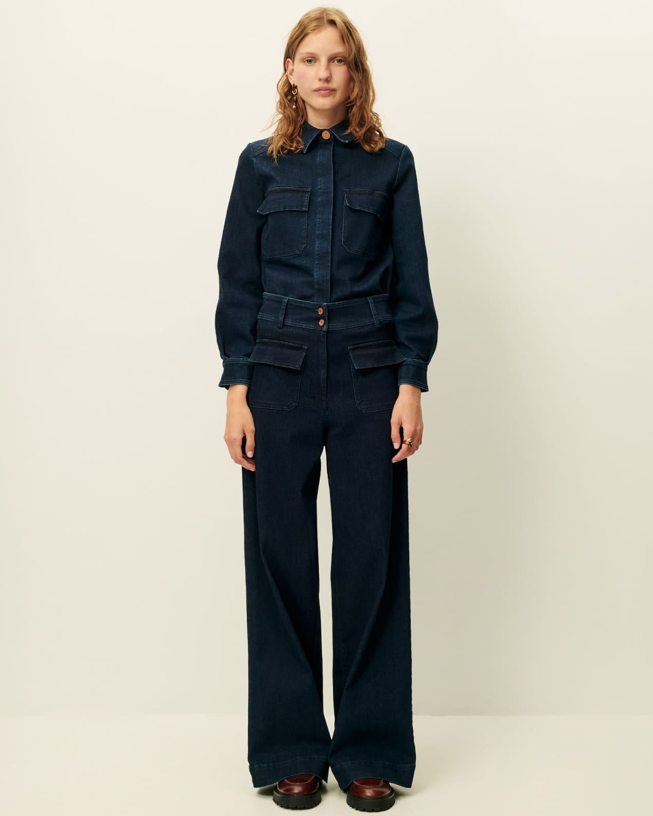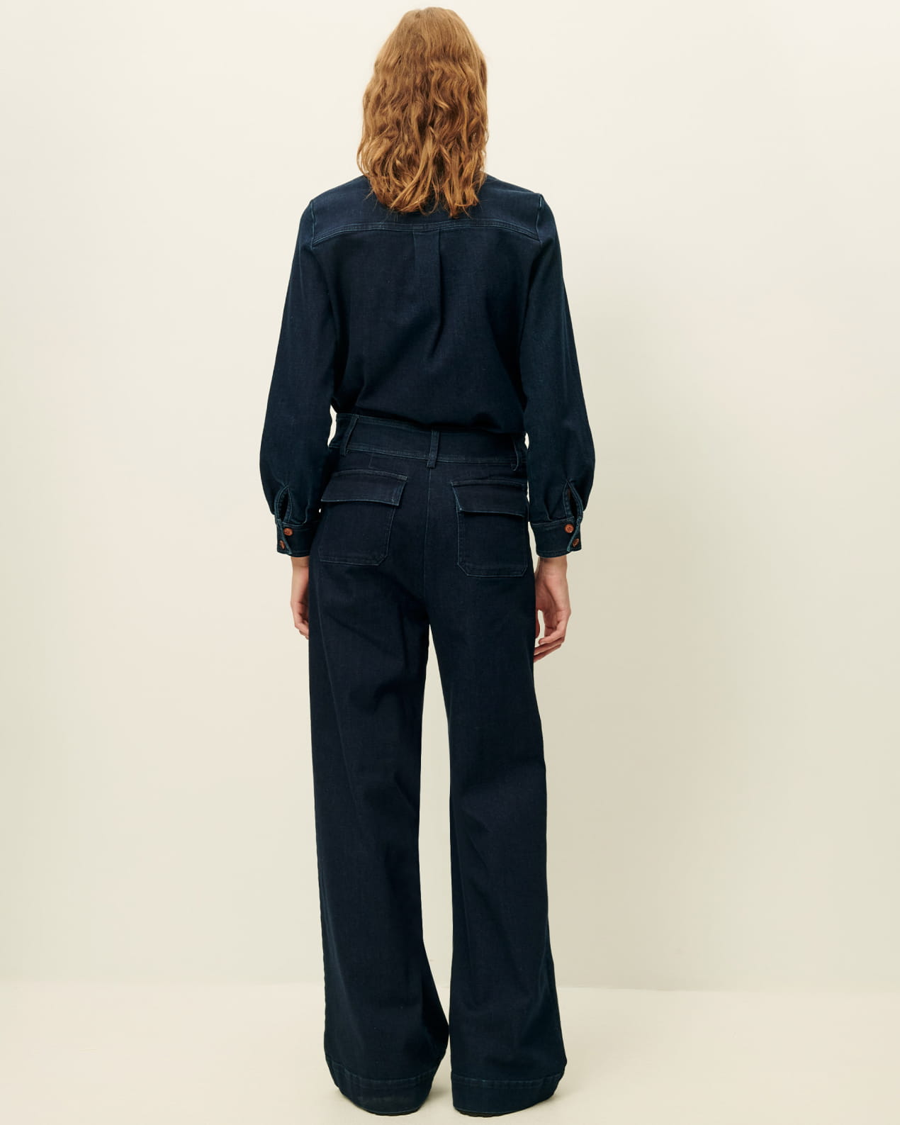 Flared pants in rinced denim twill made with indigo dyed yarns, woven in Portugal.