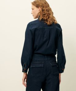 This garment is made from fabric containing indigo-dyed threads. This specific method reveals the unique details of each material, creating variations in color and irregularities, making each piece unique.