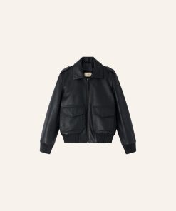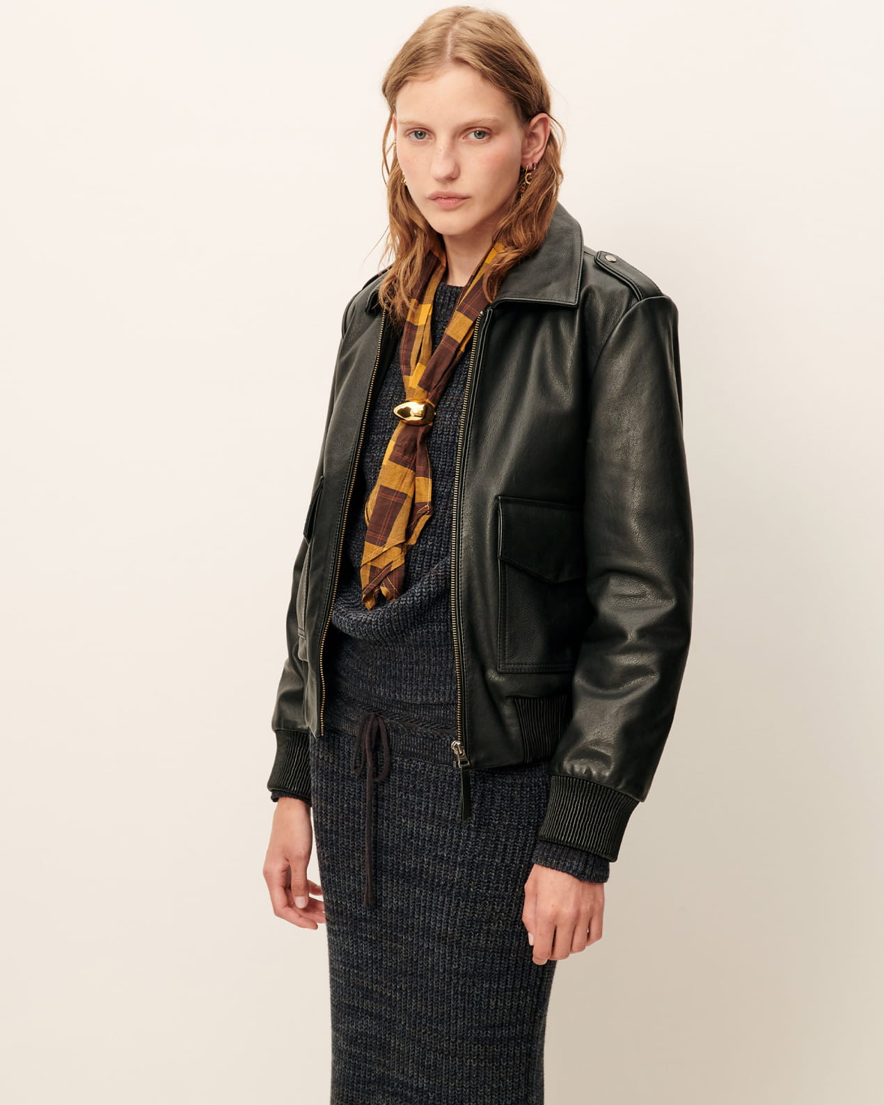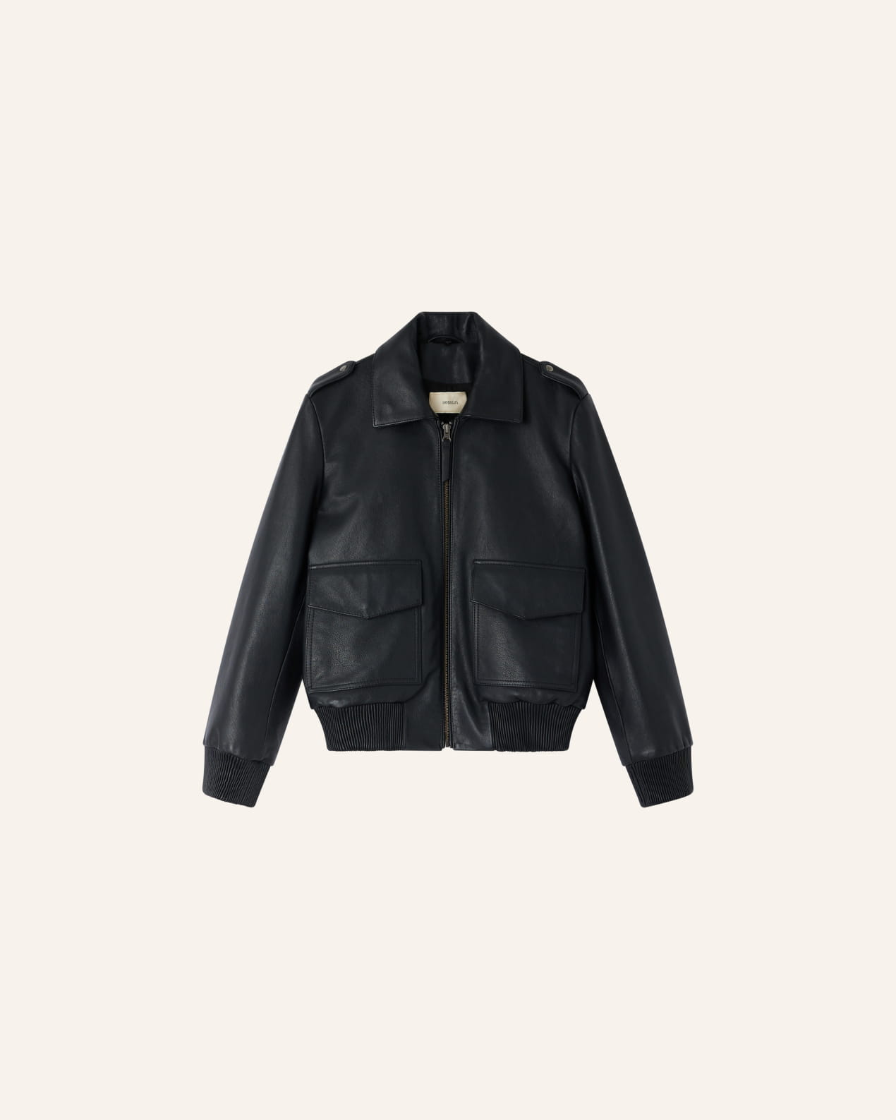 Short, fitted, elasticated blouson with patch pockets and shoulder tabs in lamb leather.