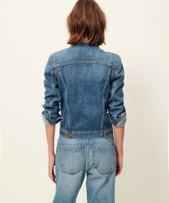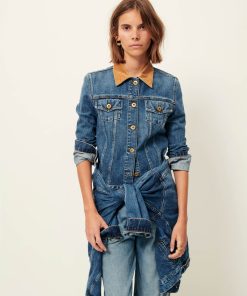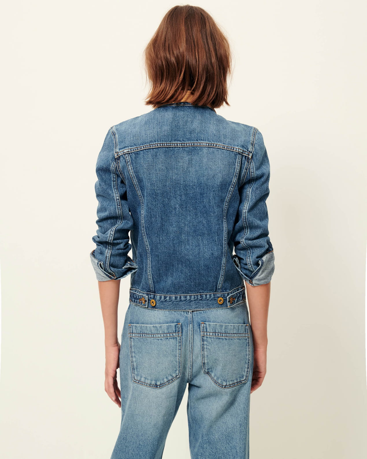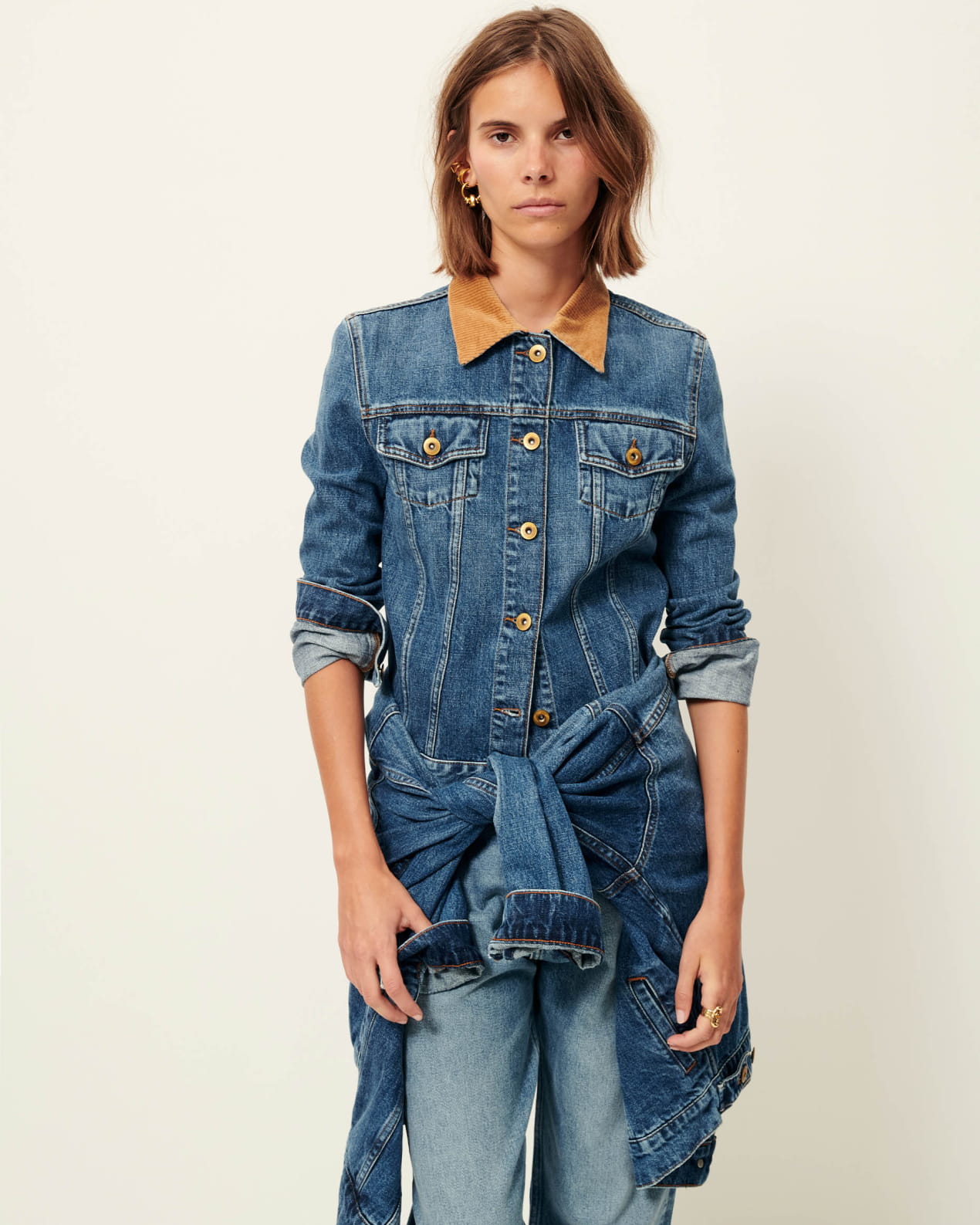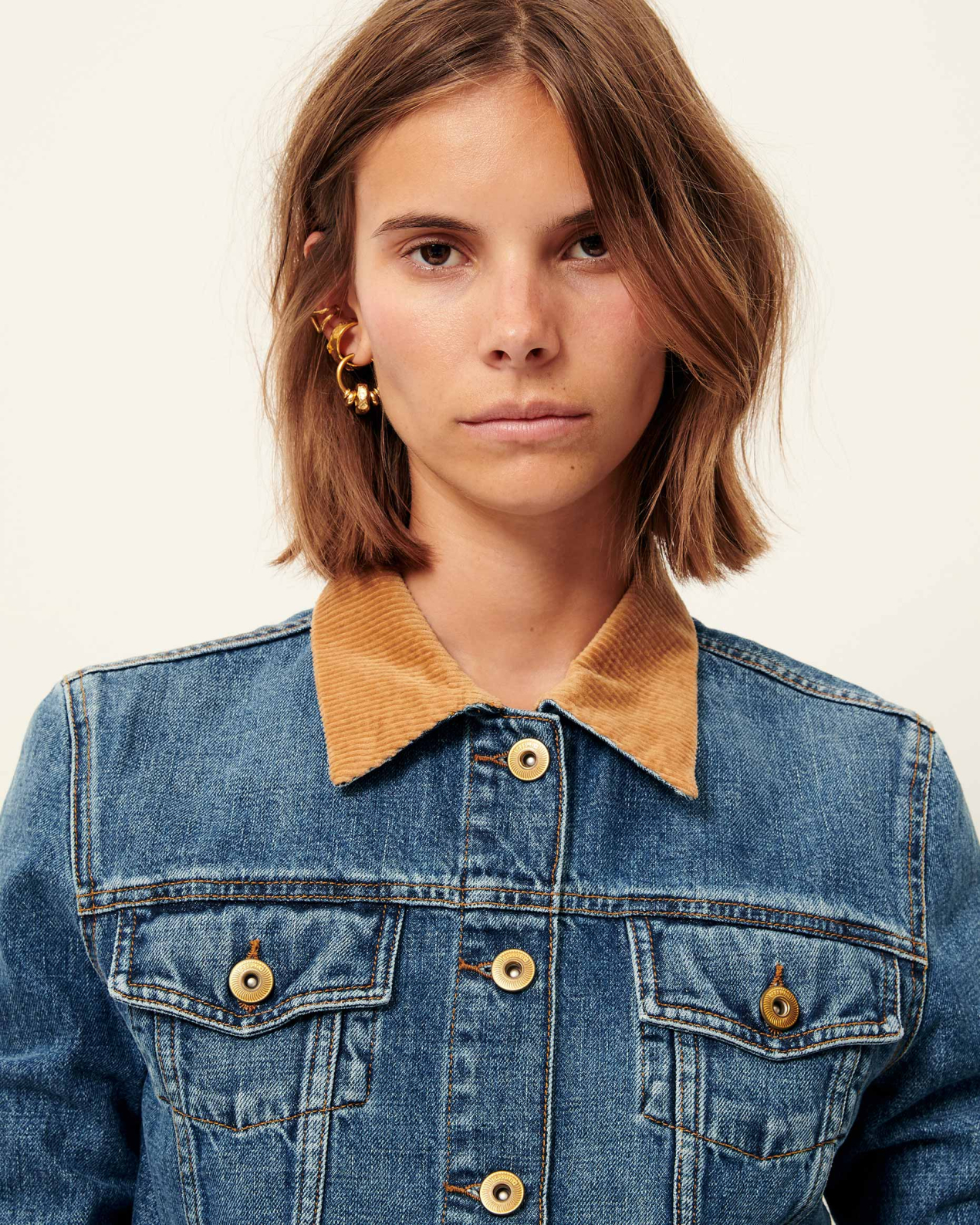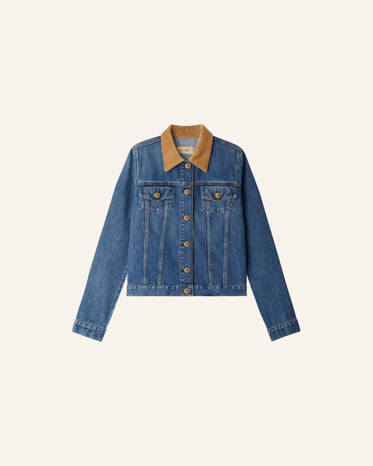 Cropped fitted jacket in faded denim with a contrasting corduroy collar.