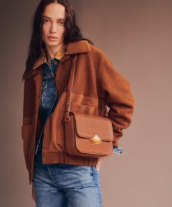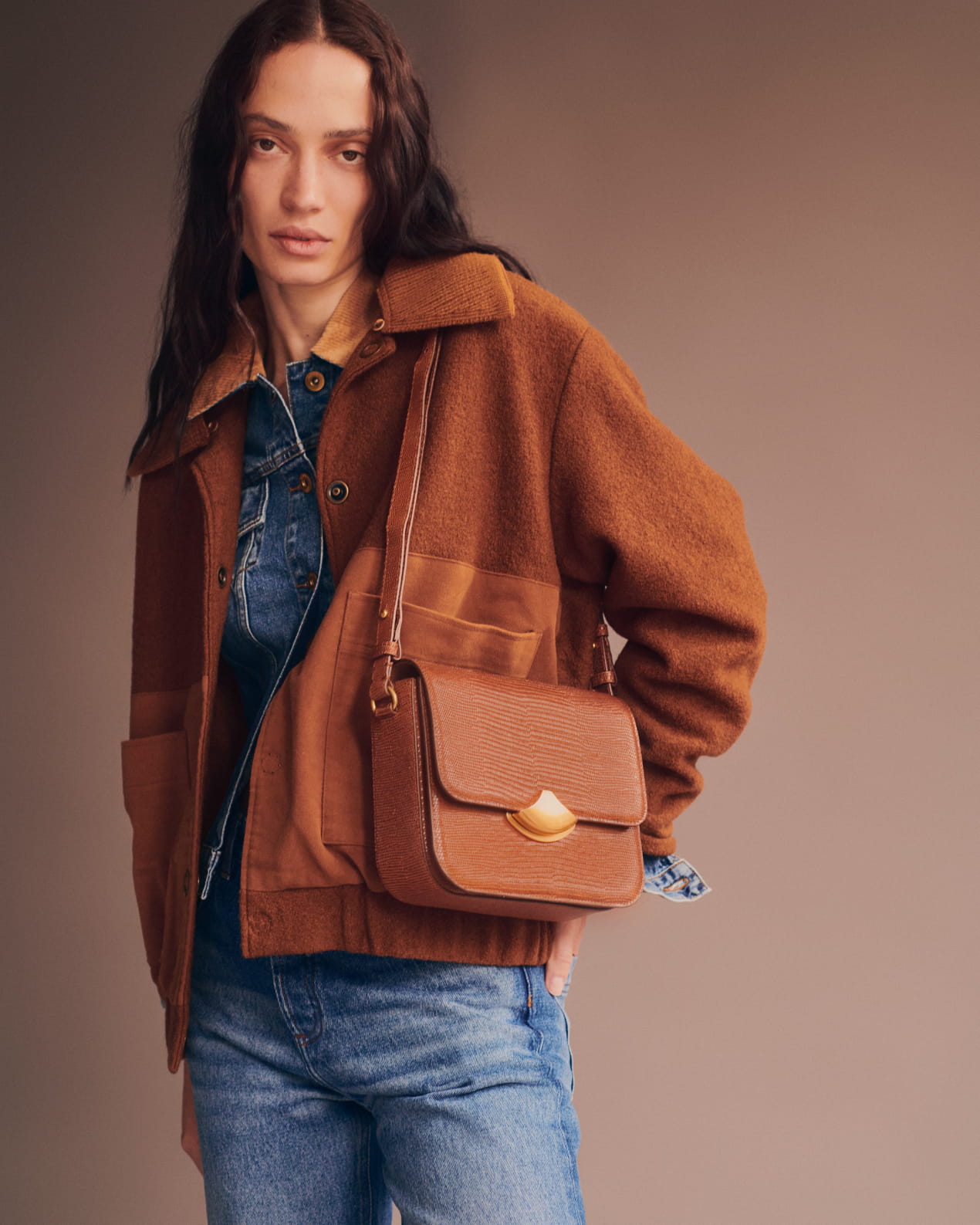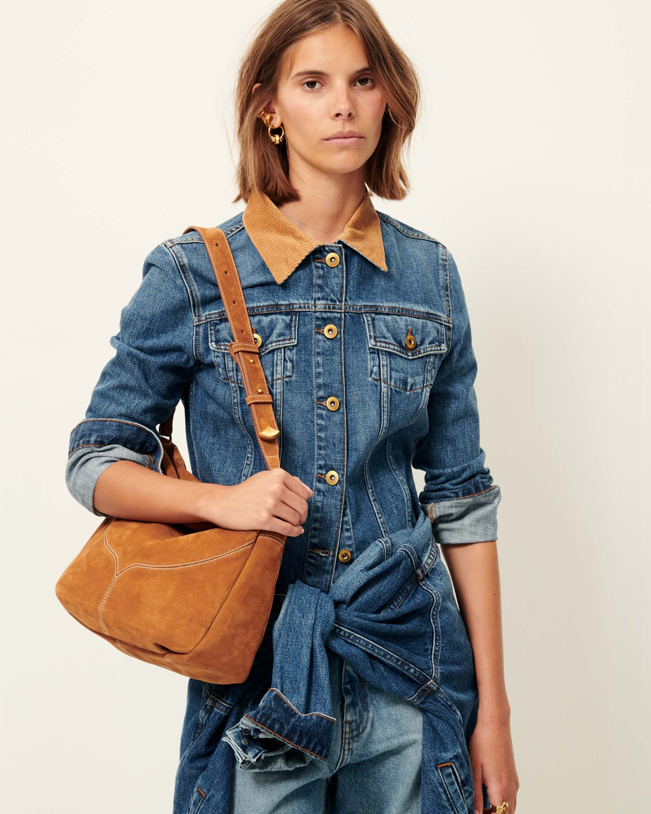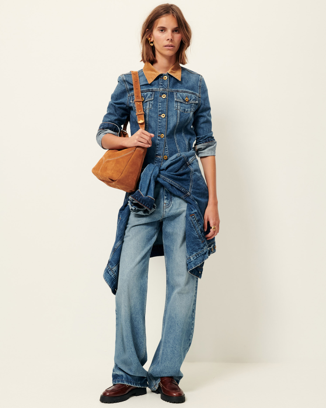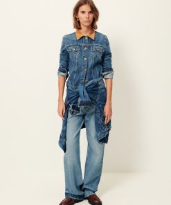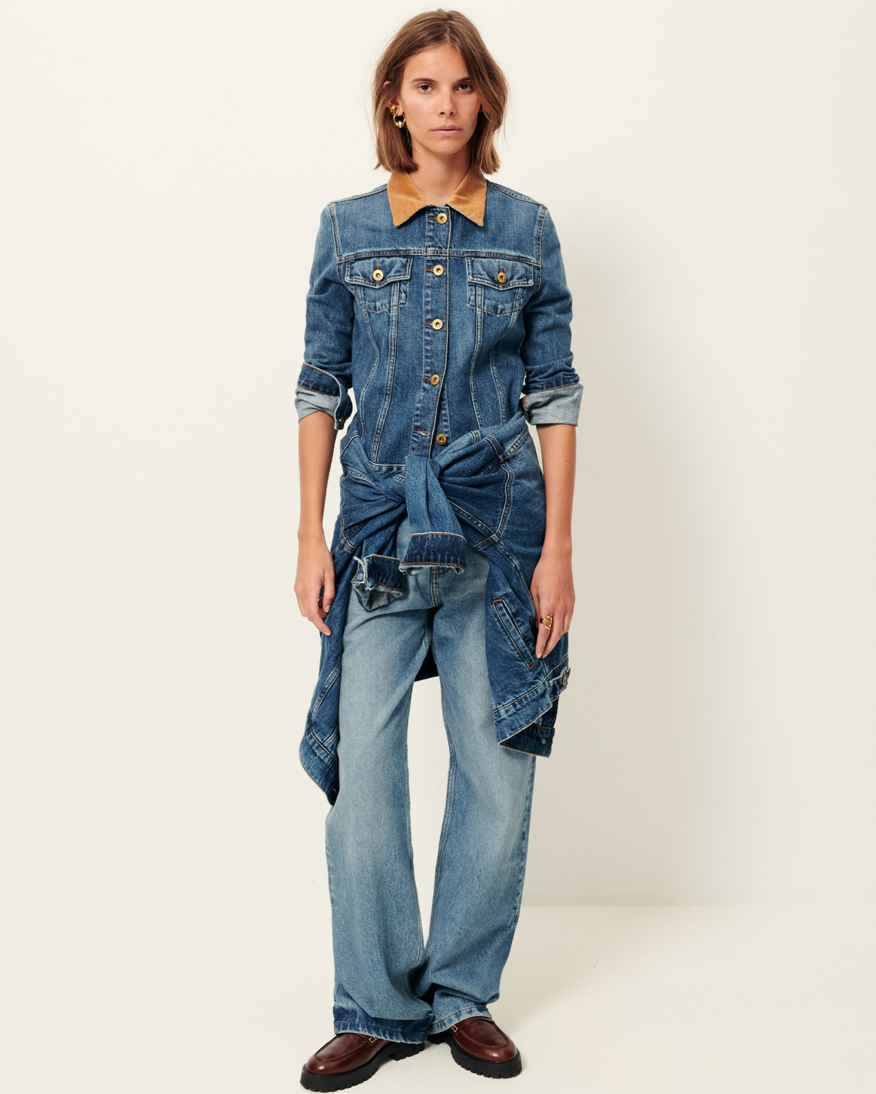 Cropped fitted jacket in faded denim with a contrasting corduroy collar.