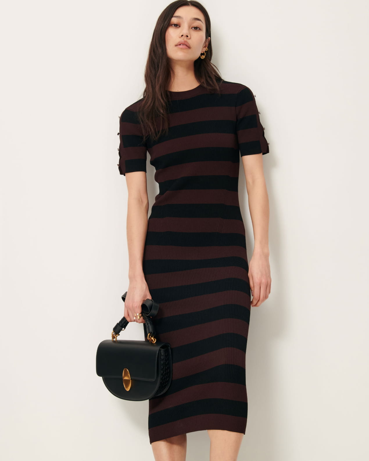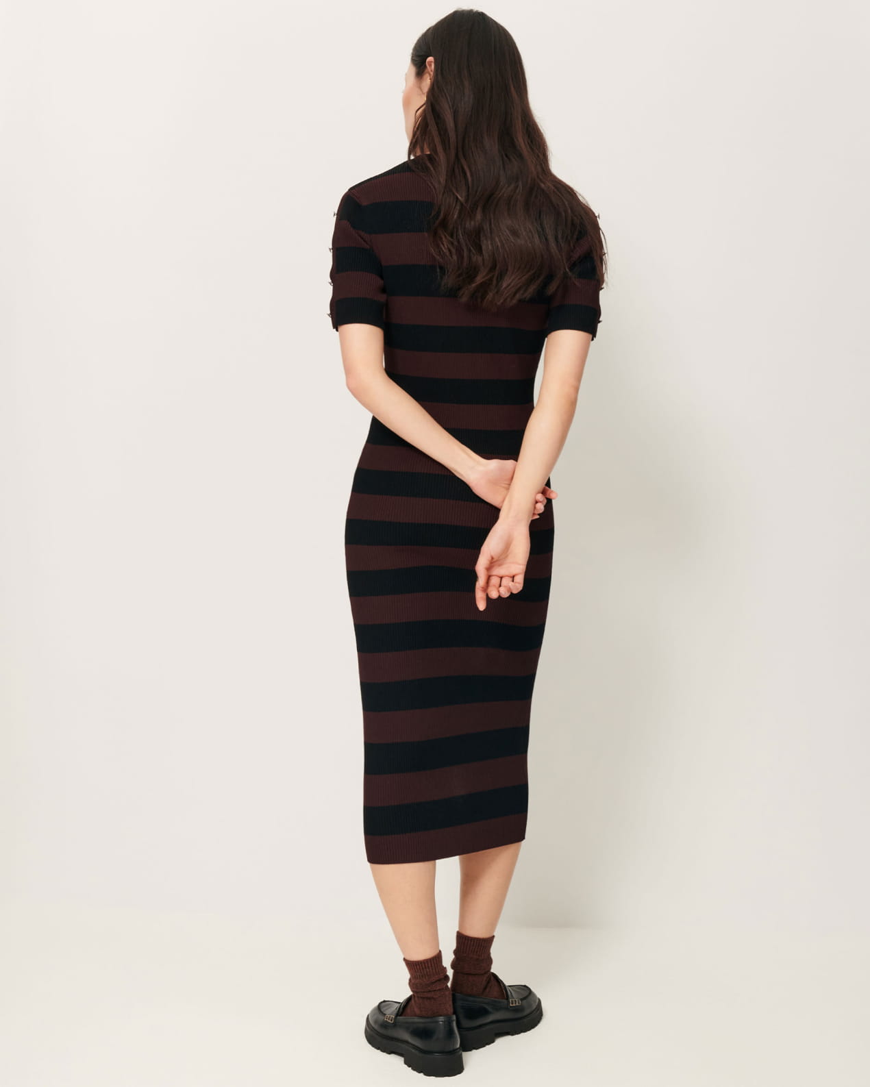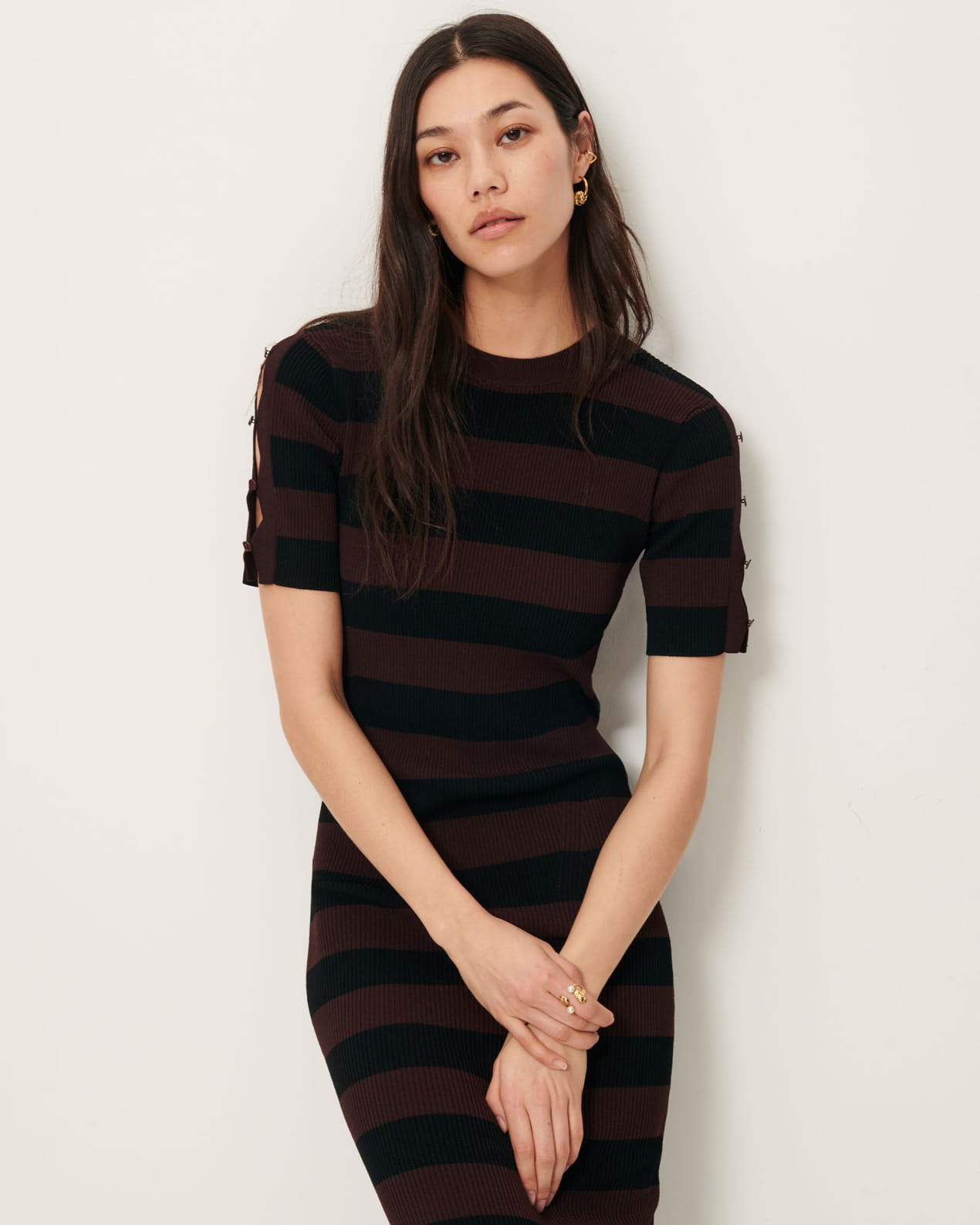 Striped close-fitting midi dress in fine-gauge knit with sleeve cutouts and jewel buttons.