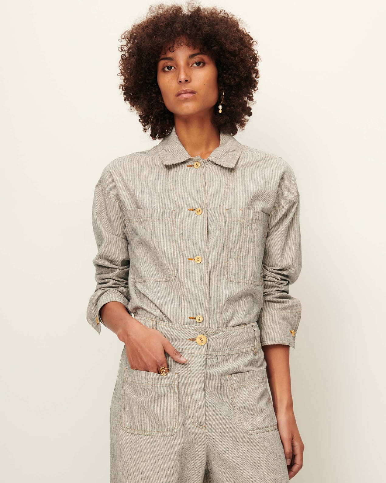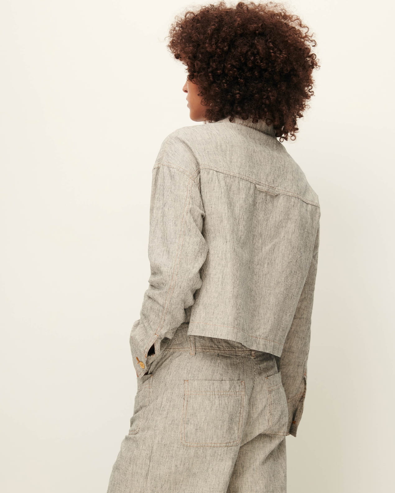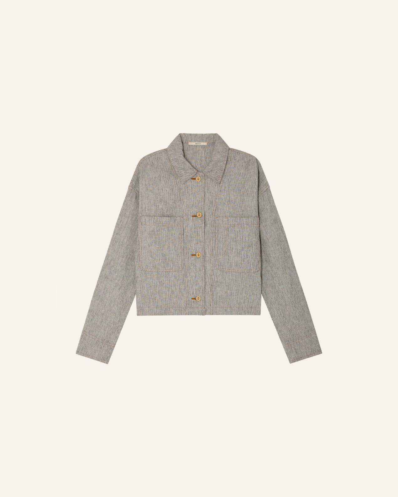 Overshirt with patch pockets in two-tone striped textured slub-yarn cotton-linen fabric, woven in Spain.