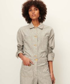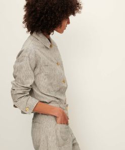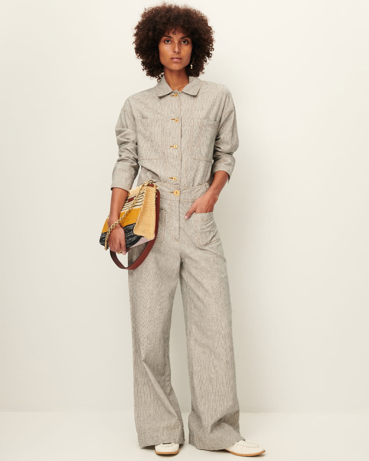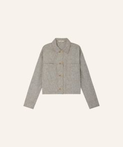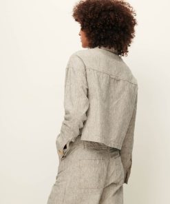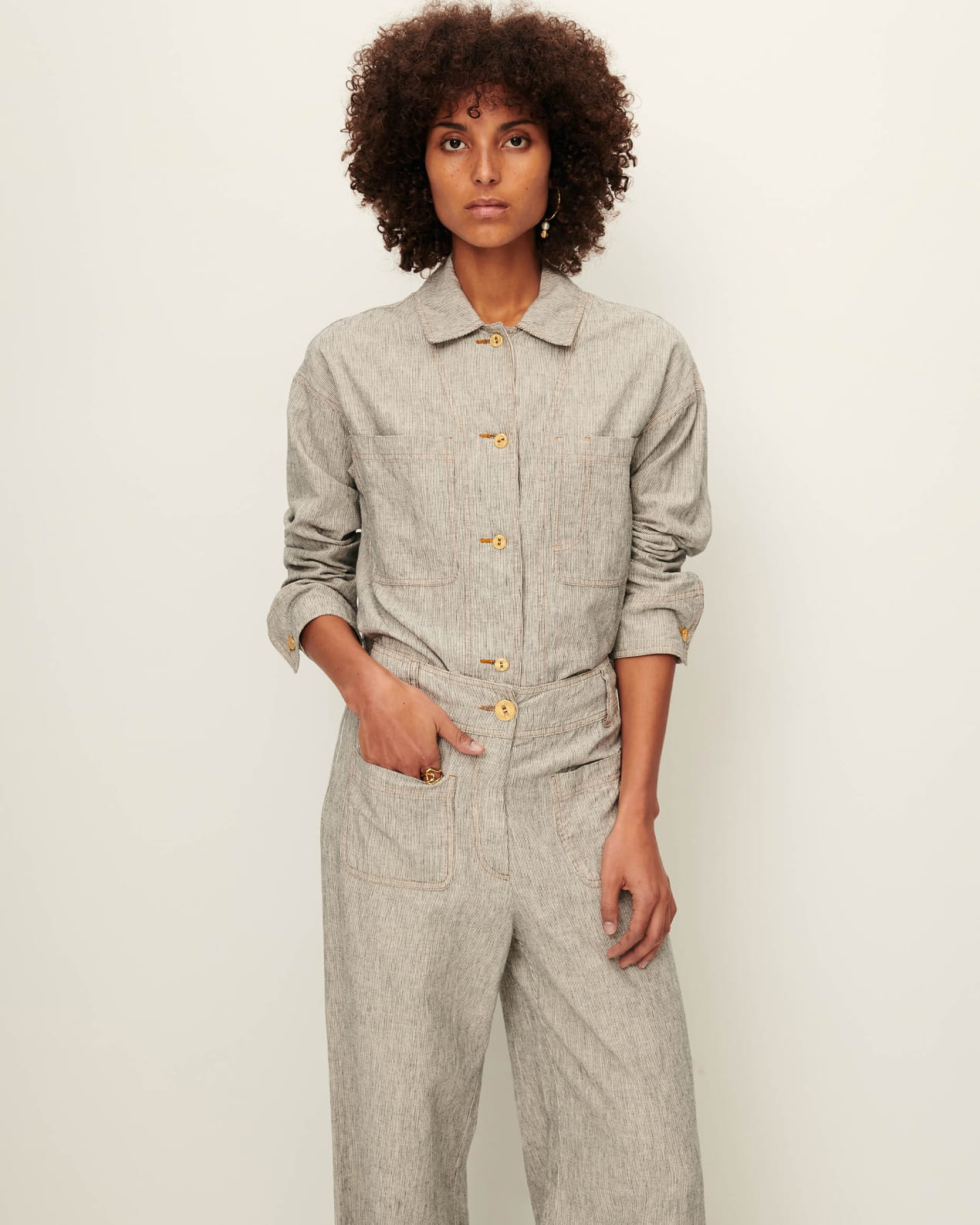 Overshirt with patch pockets in two-tone striped textured slub-yarn cotton-linen fabric, woven in Spain.