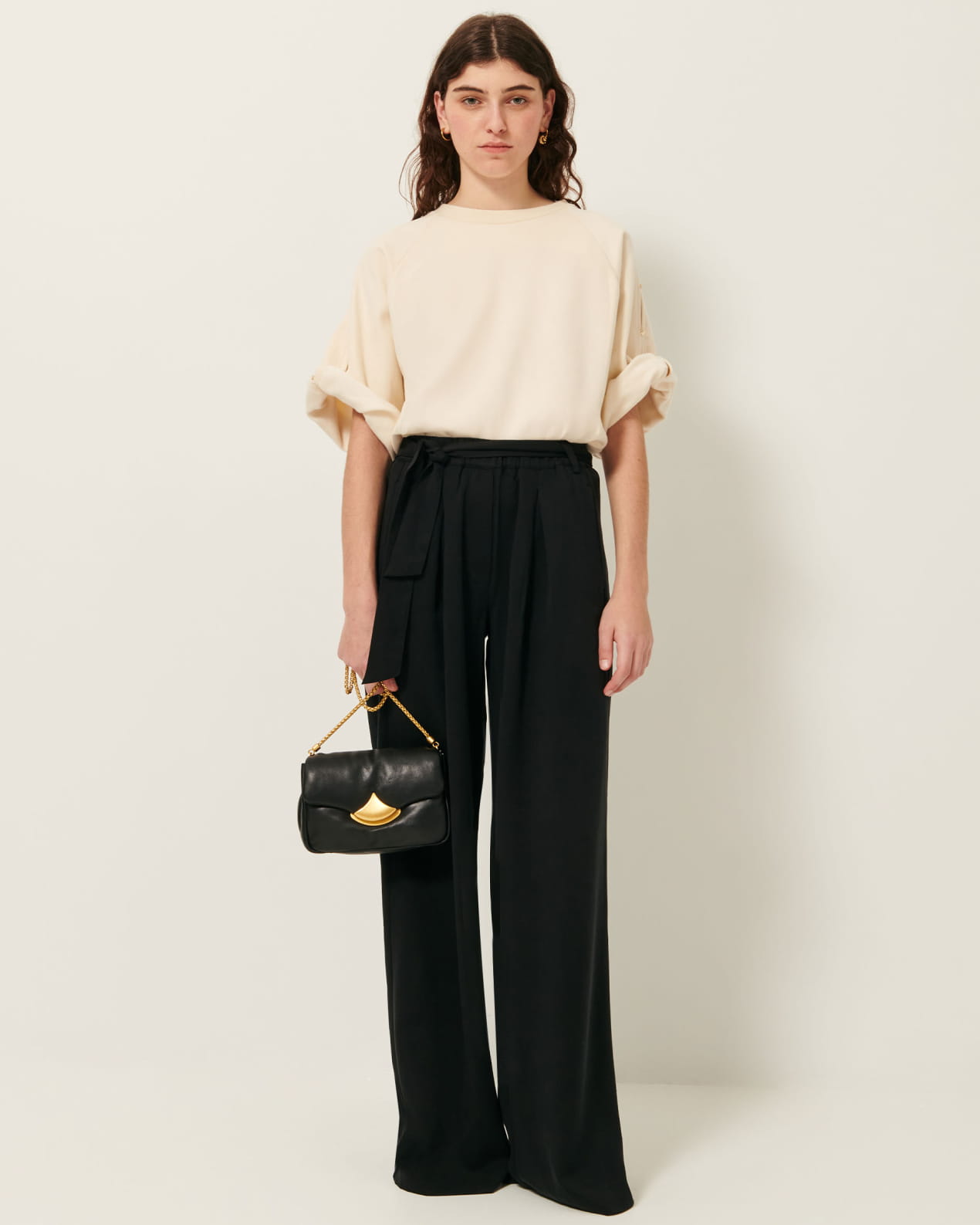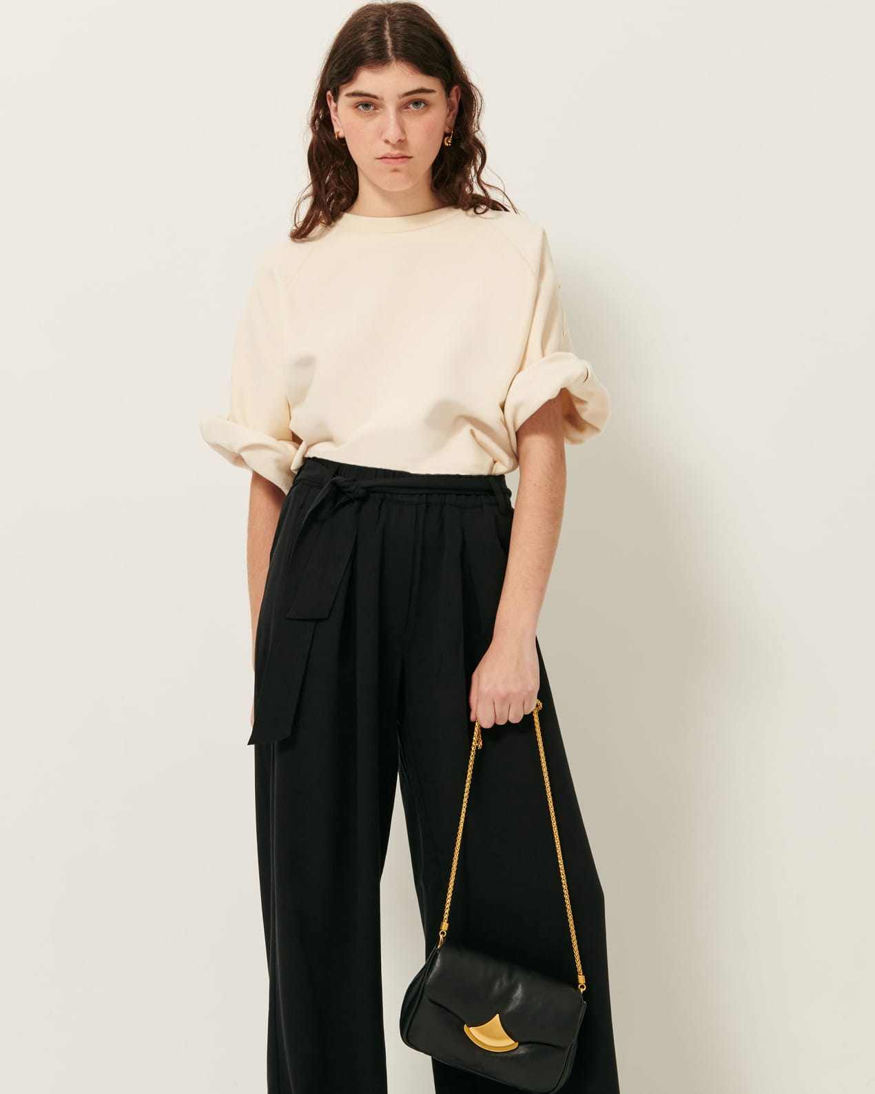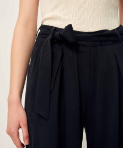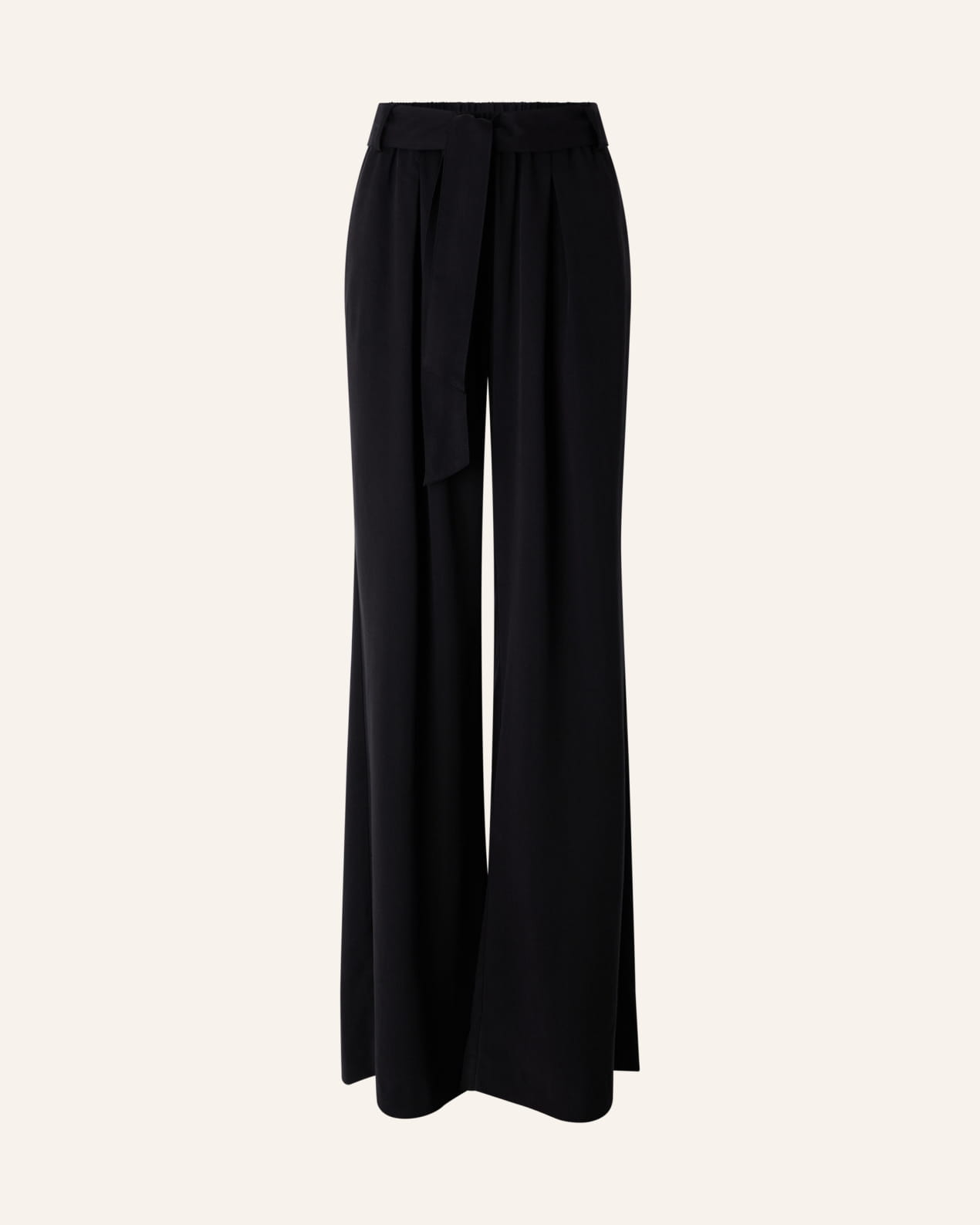 High-rise, elasticated waist pants with a removable tie belt in a lightweight, fluid, satin-finish gabardine fabric.