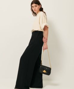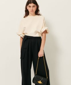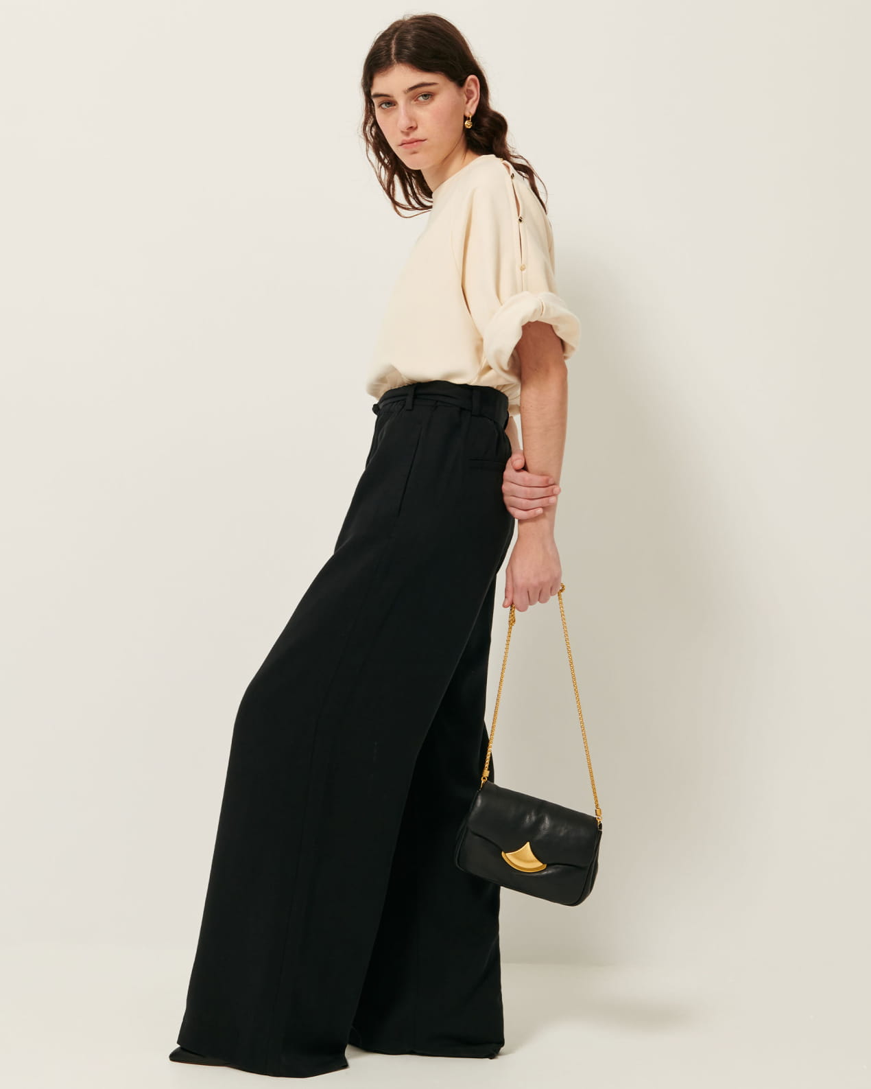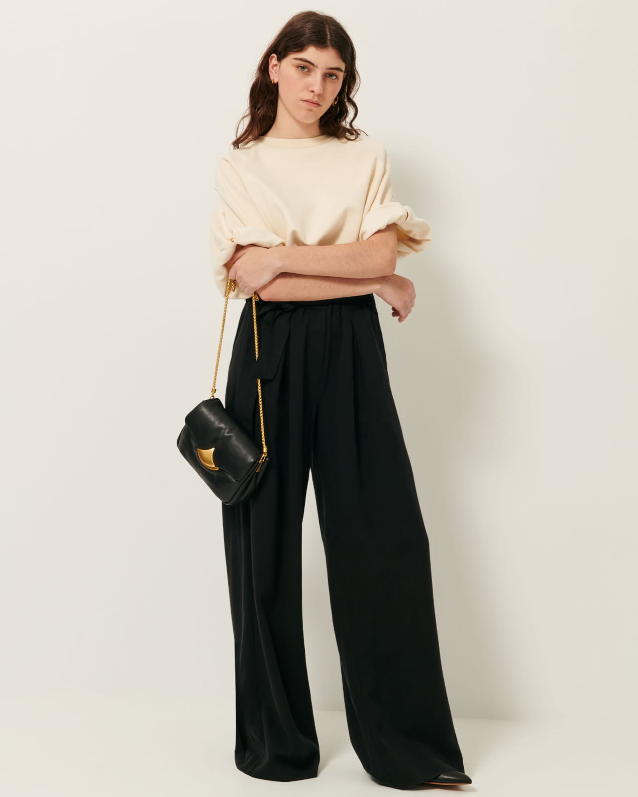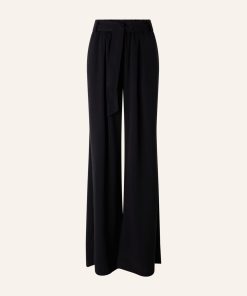 High-rise, elasticated waist pants with a removable tie belt in a lightweight, fluid, satin-finish gabardine fabric.