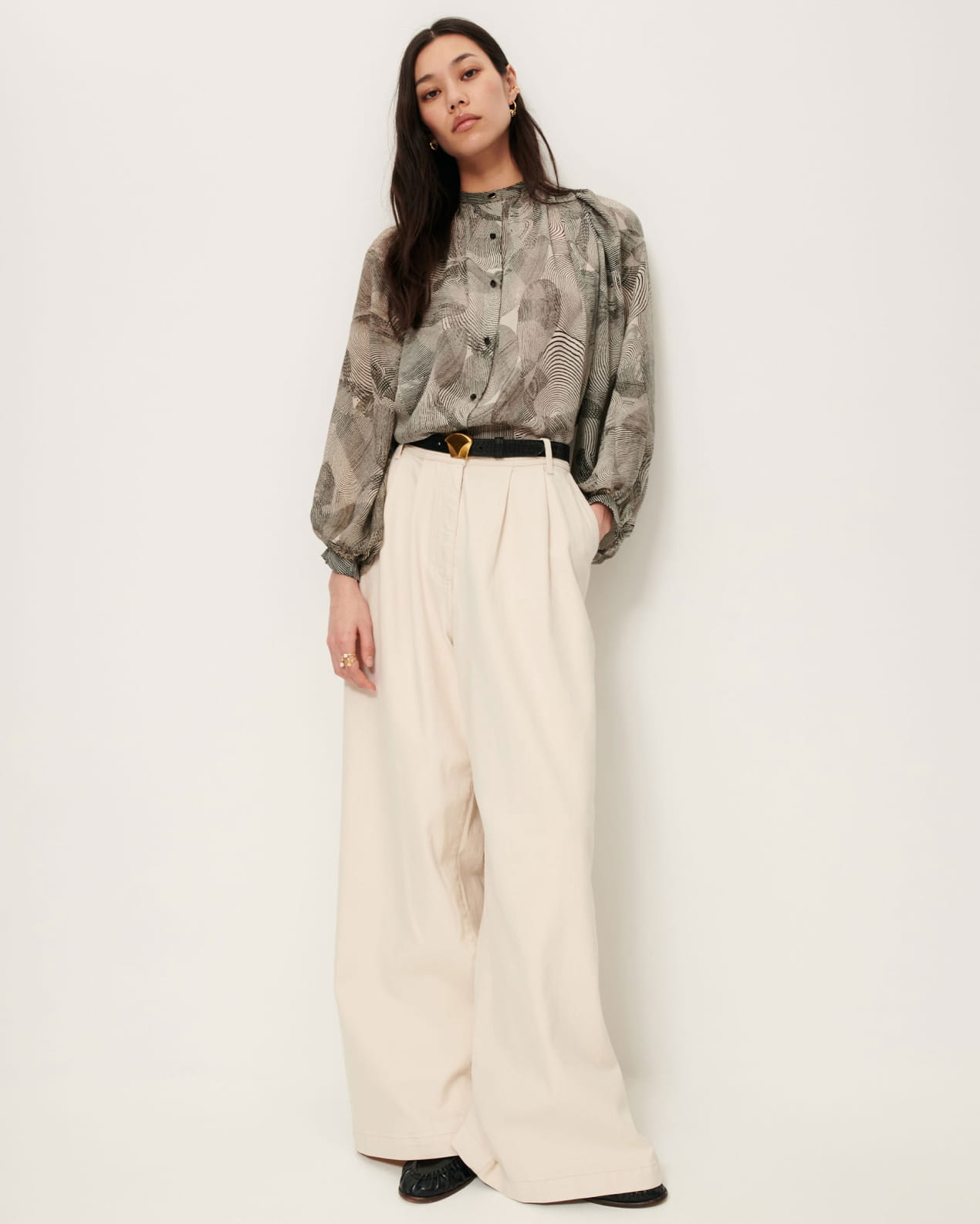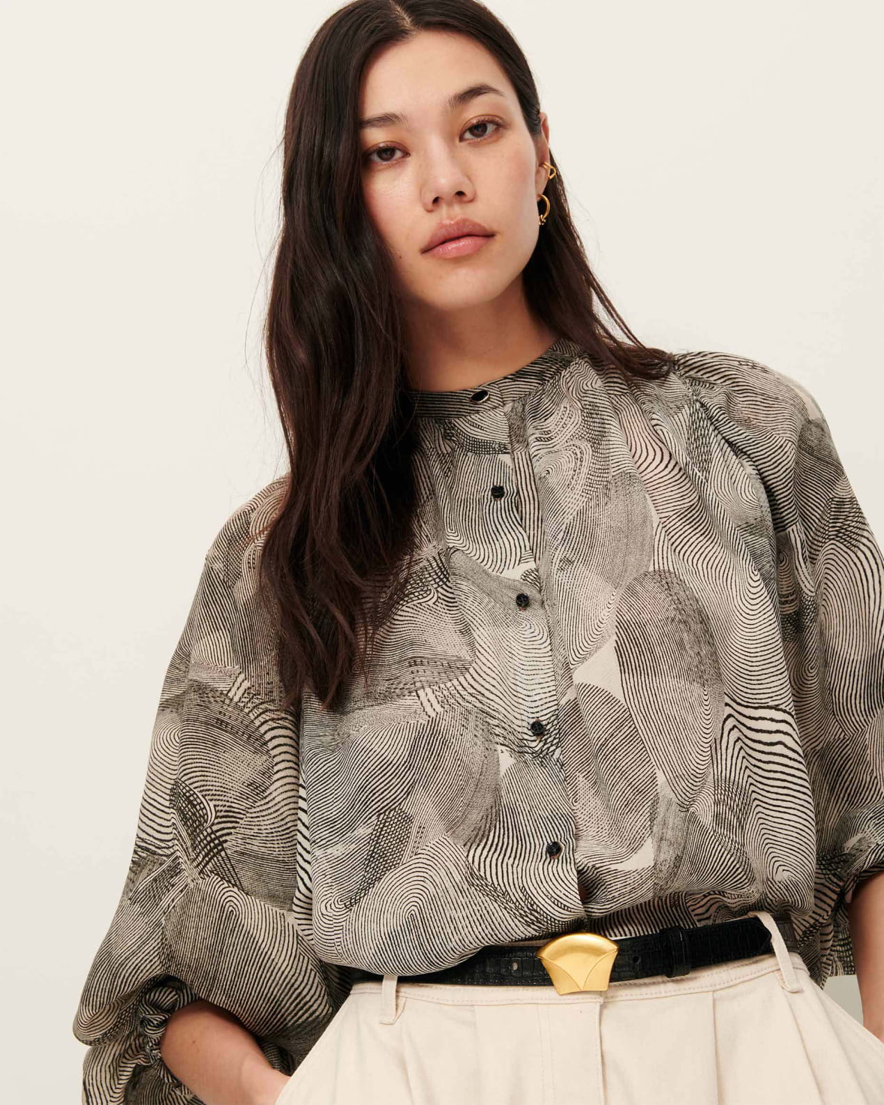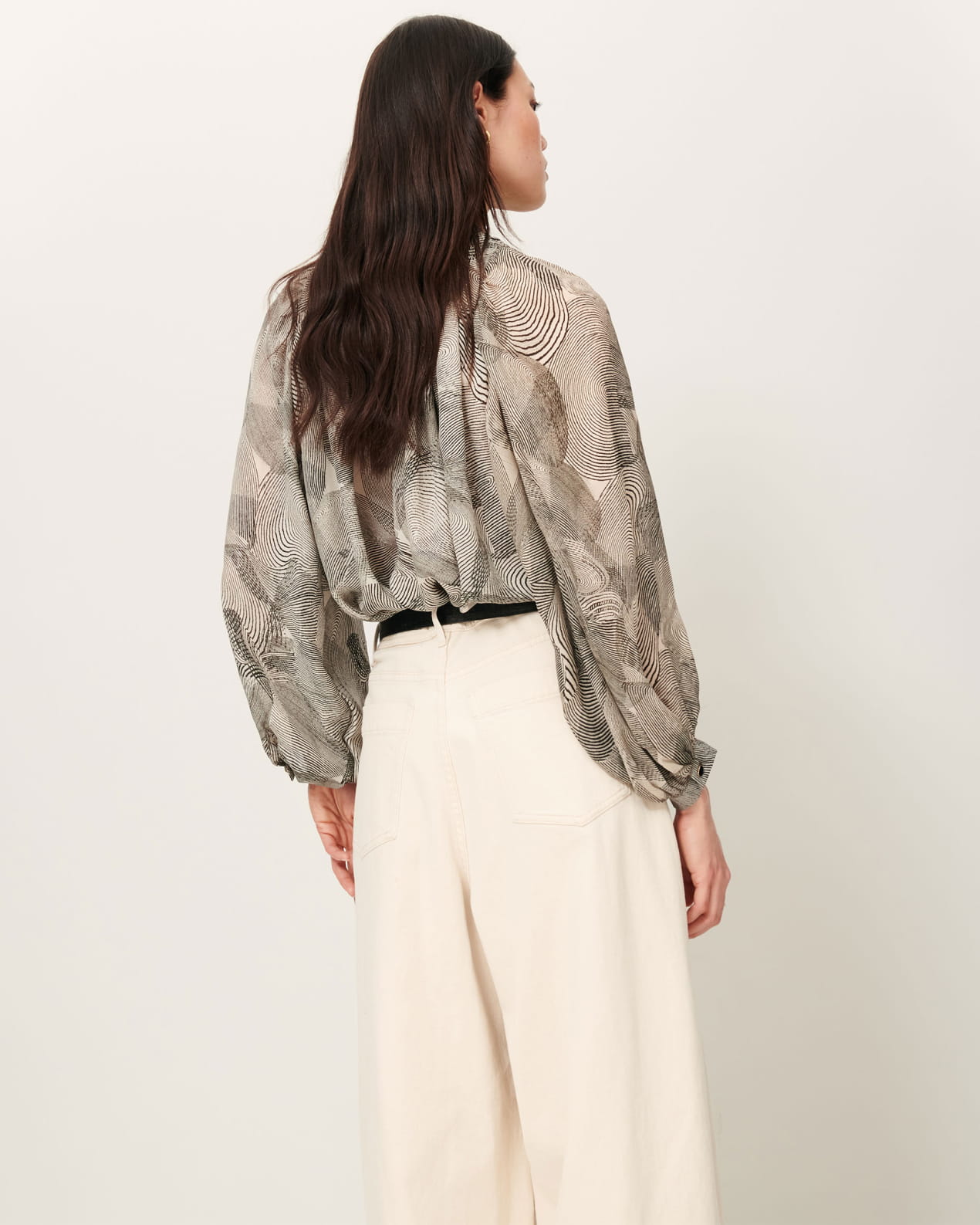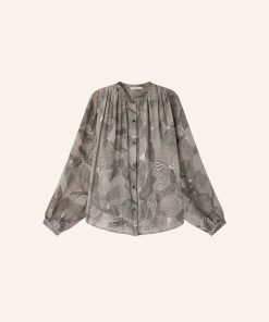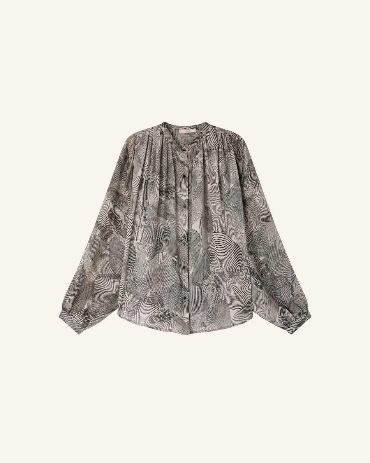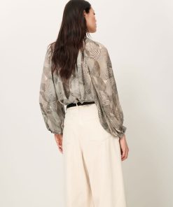 Long-sleeve blouse with gathering details in silk chiffon, printed in Italy, exclusive Sessùn pattern.