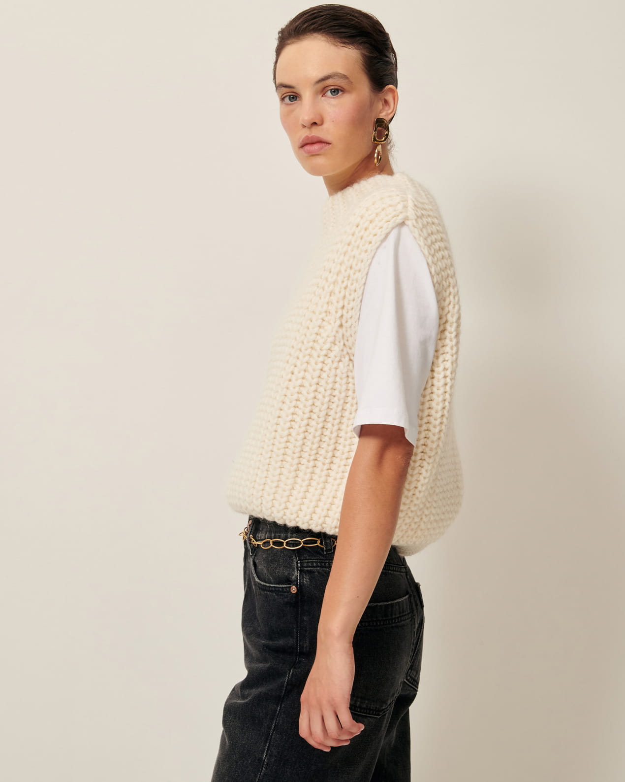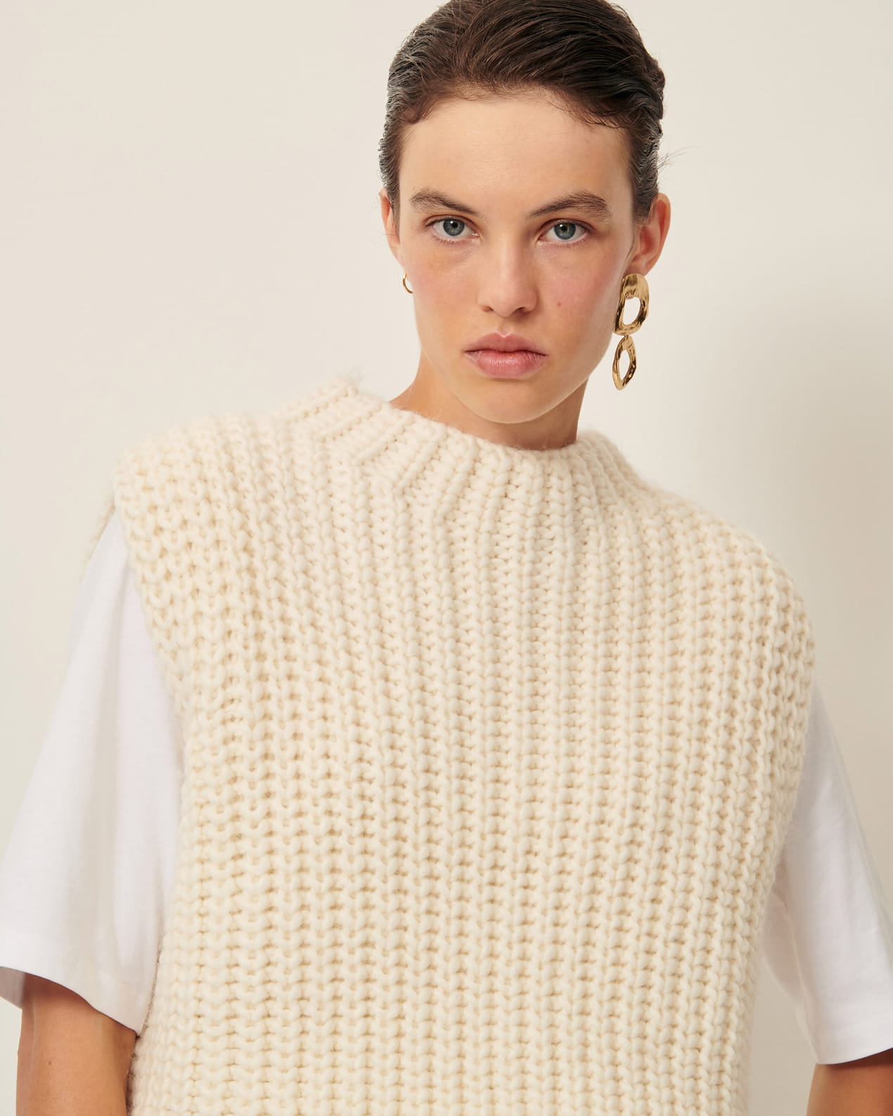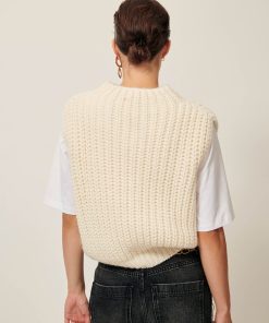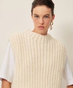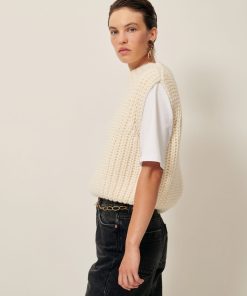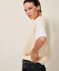 Loose-fitting sleeveless jumper in a wide gauge half cardigan rib knit, knitted in Italy.