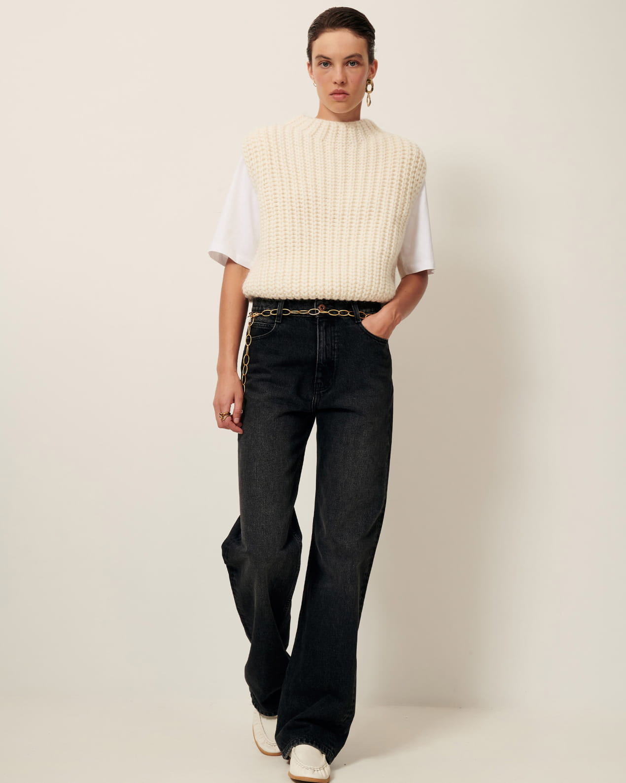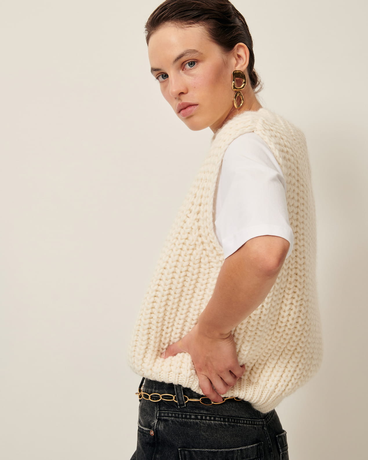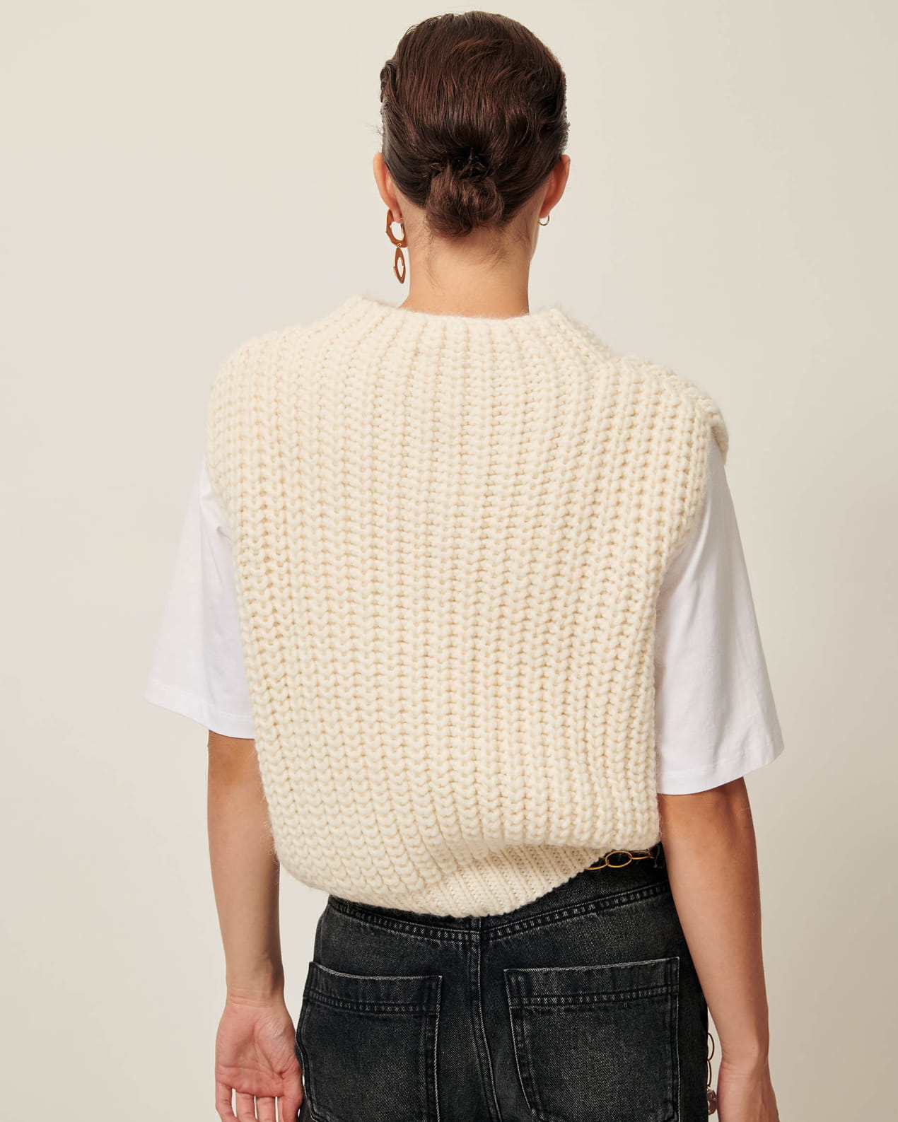 Loose-fitting sleeveless jumper in a wide gauge half cardigan rib knit, knitted in Italy.