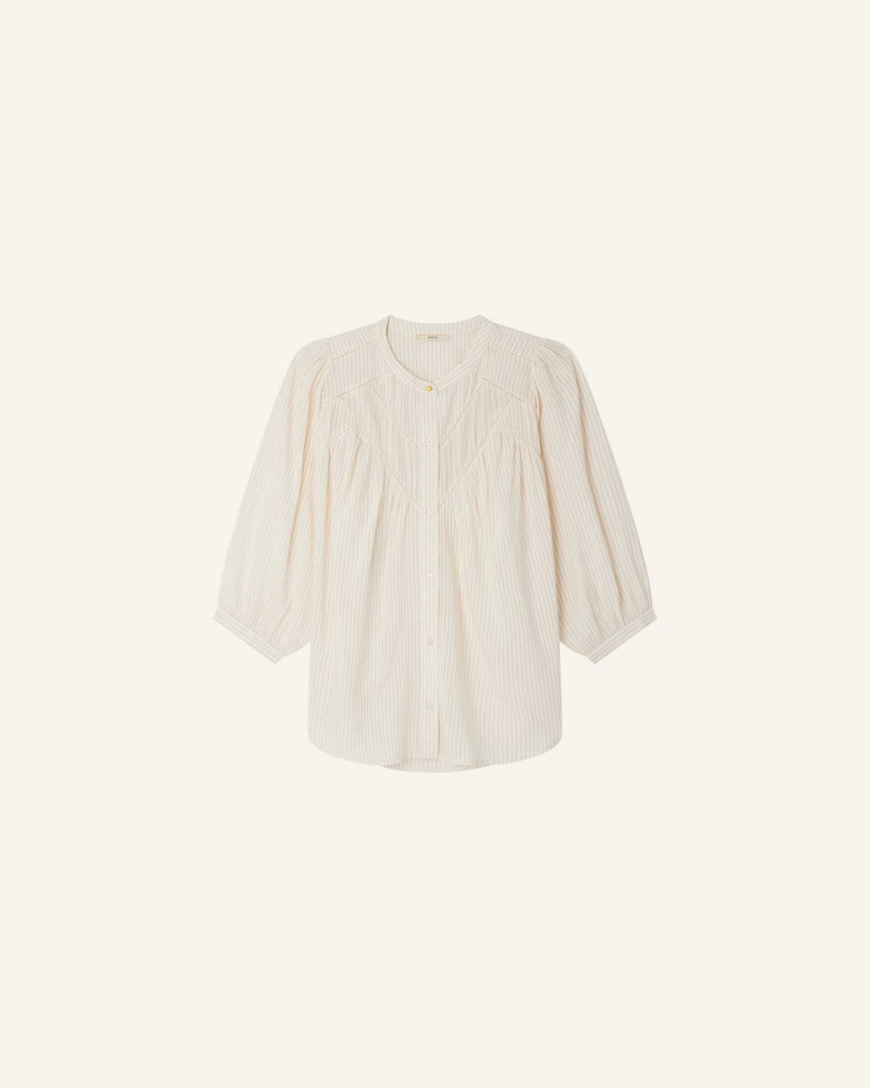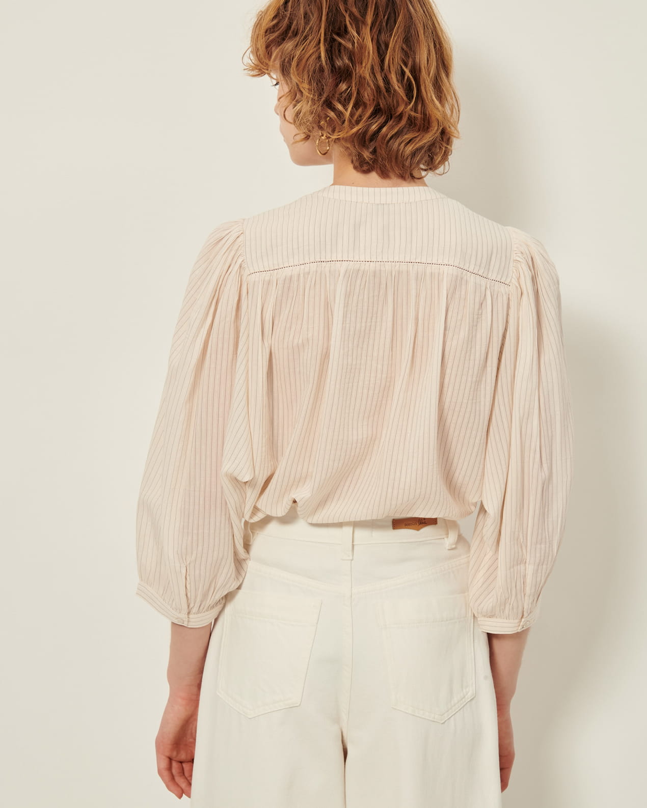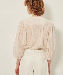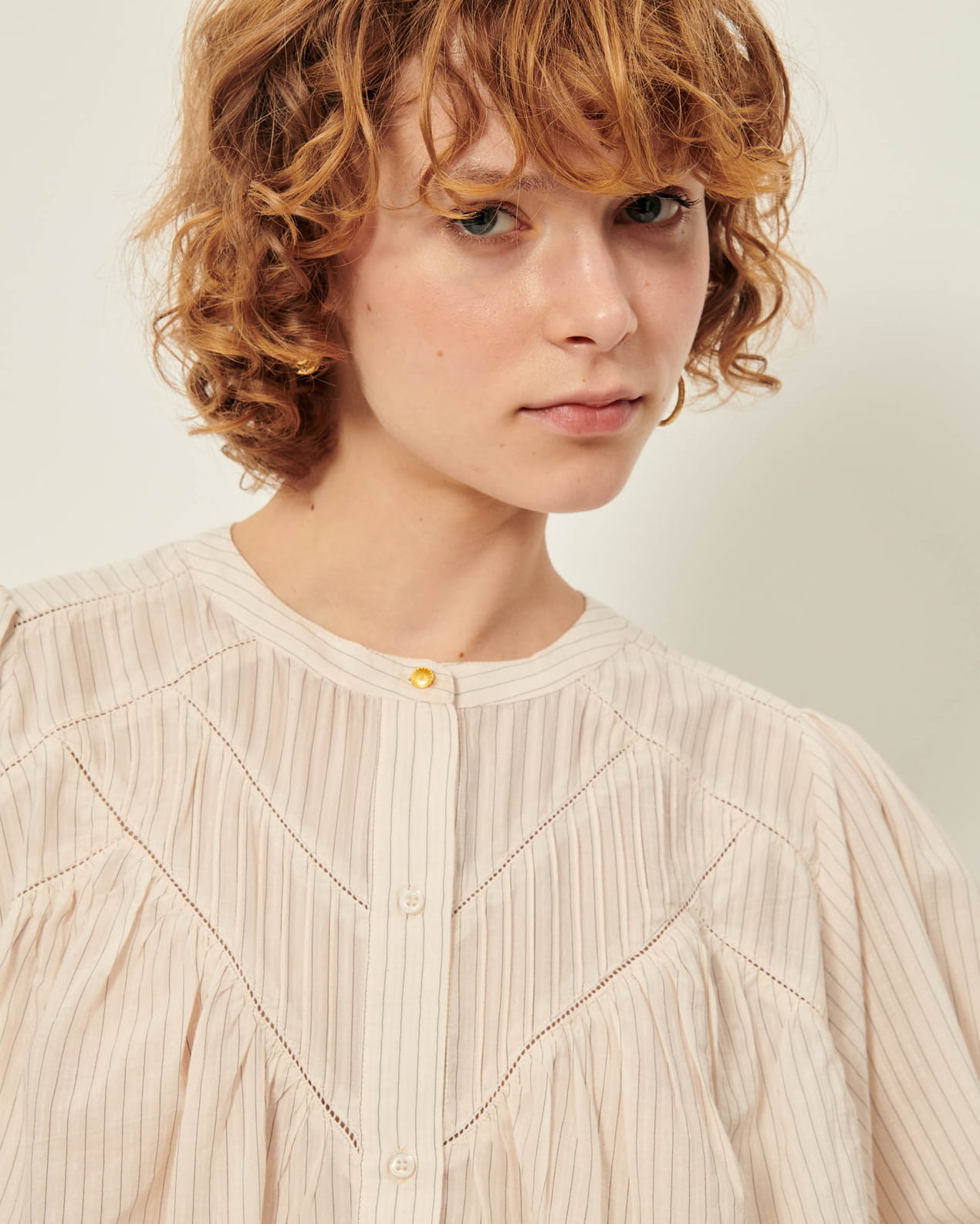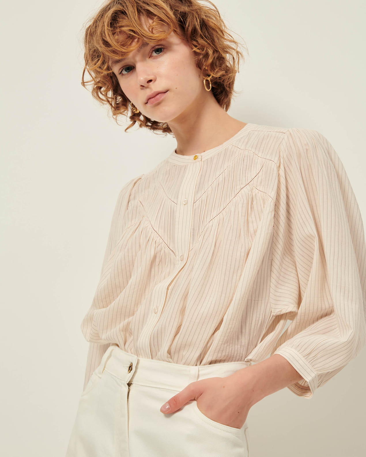 Balloon sleeved blouse with ladder openwork and mini knife pleats in a textured jacquard lawn fabric with fine contrasting stripes.