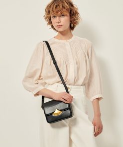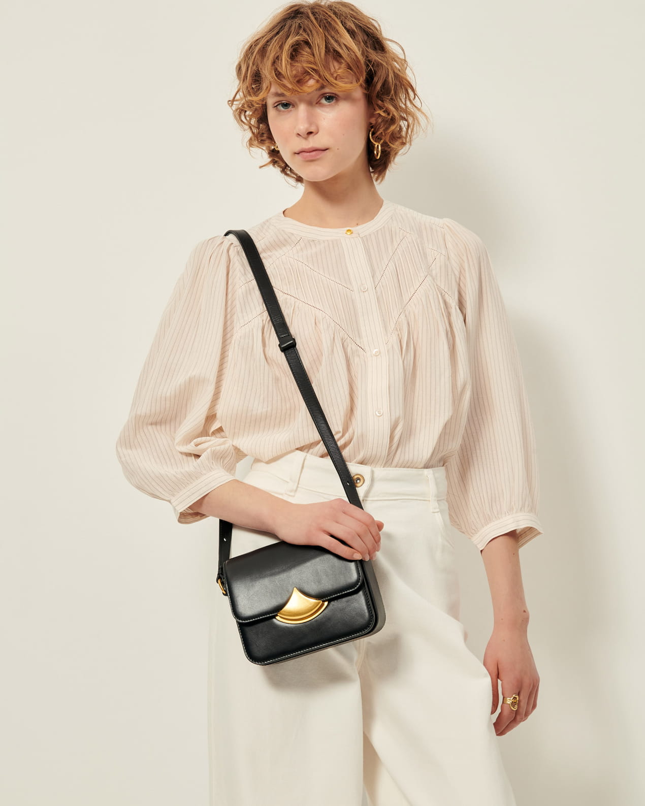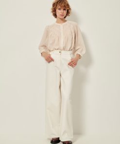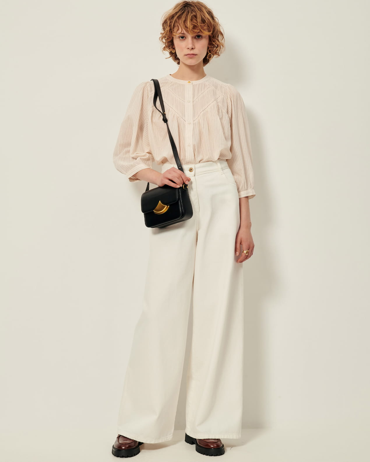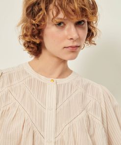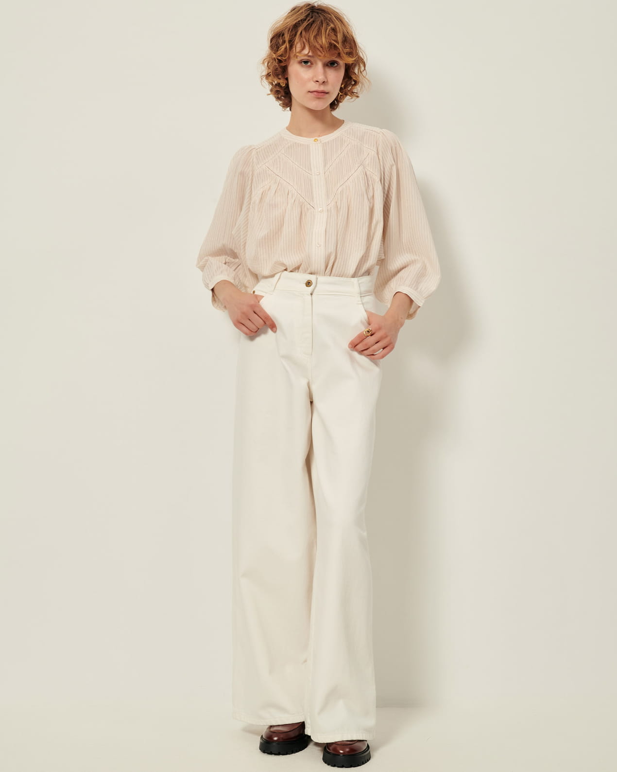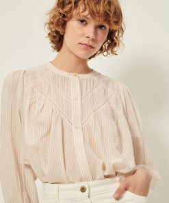 Balloon sleeved blouse with ladder openwork and mini knife pleats in a textured jacquard lawn fabric with fine contrasting stripes.