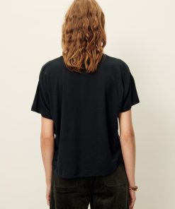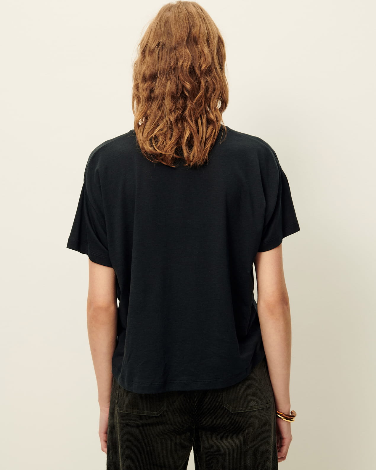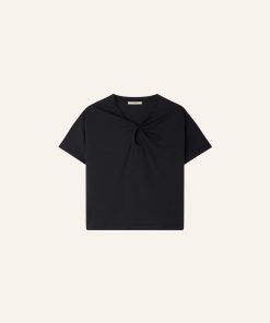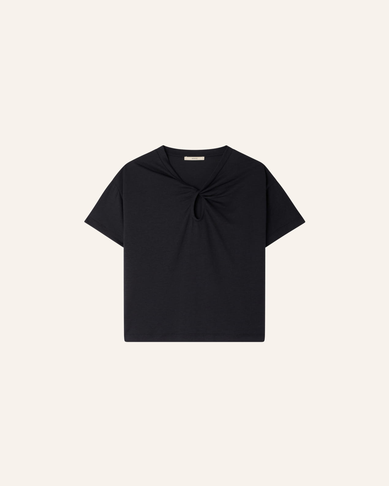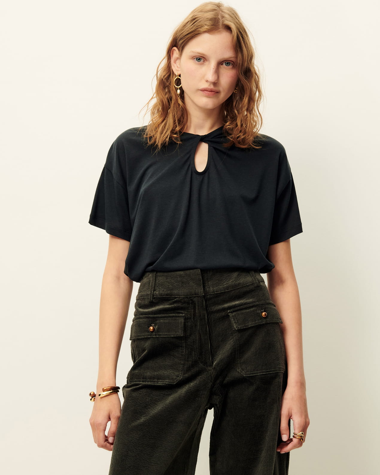 Loose-fitting short-sleeve T-shirt in fluid jersey fabric with a teardrop cutout twist at the front neckline, made in Portugal.