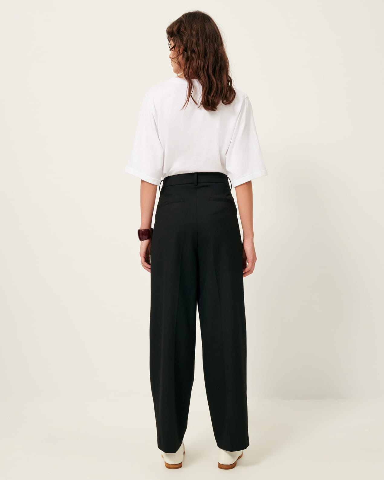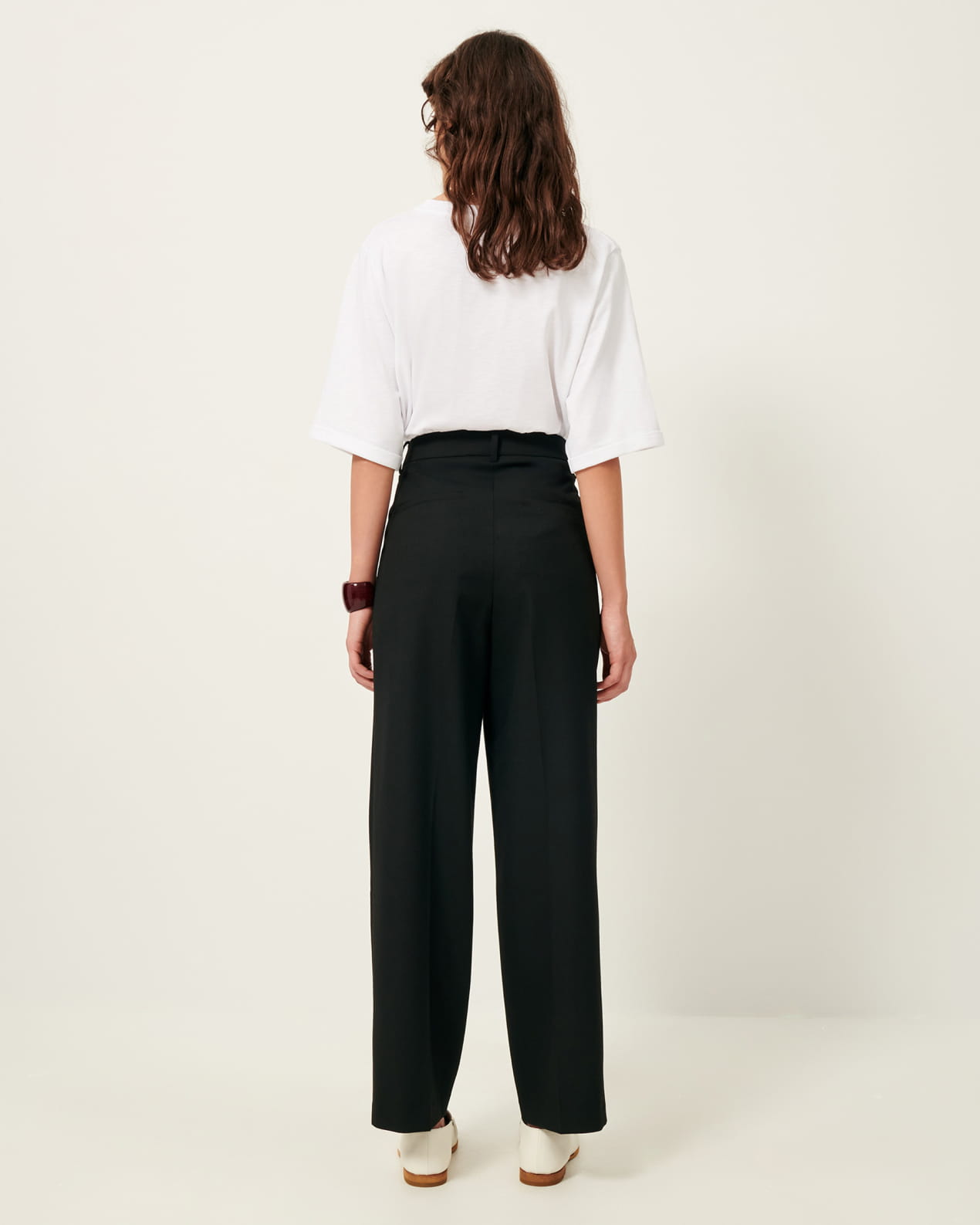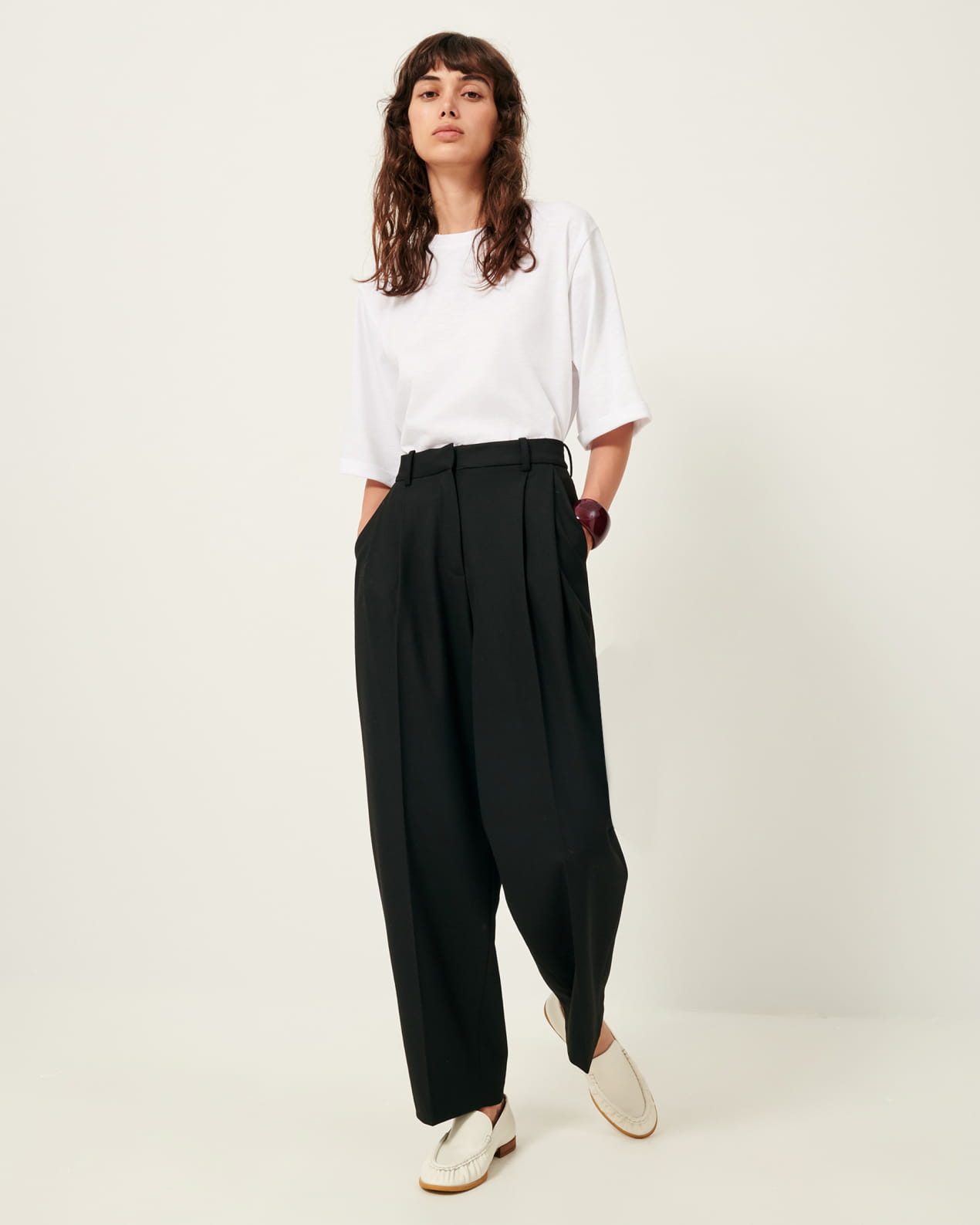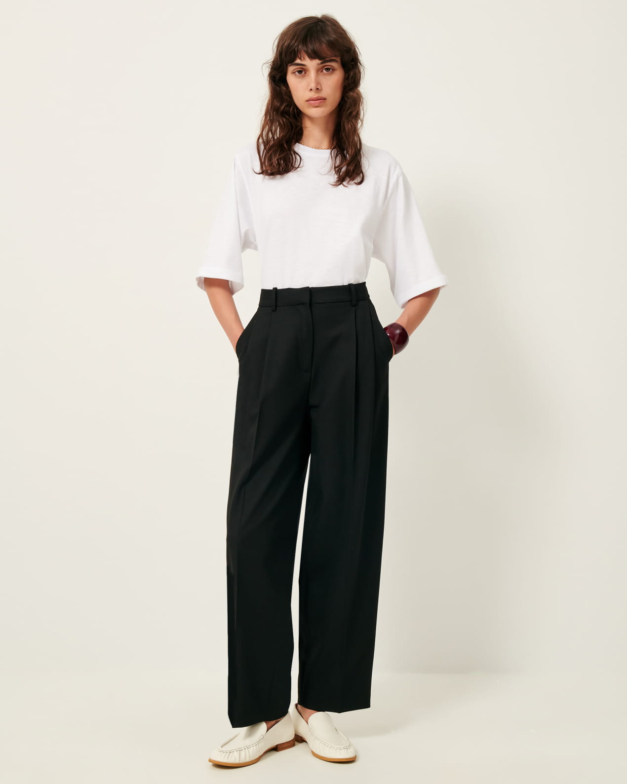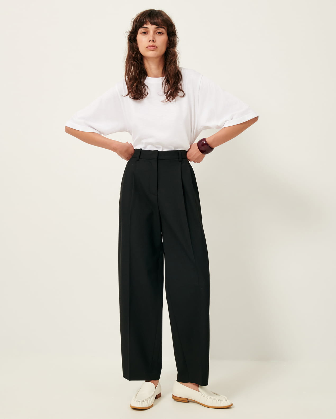 Tailored, wide-leg pleated pants in a soft gabardine fabric.