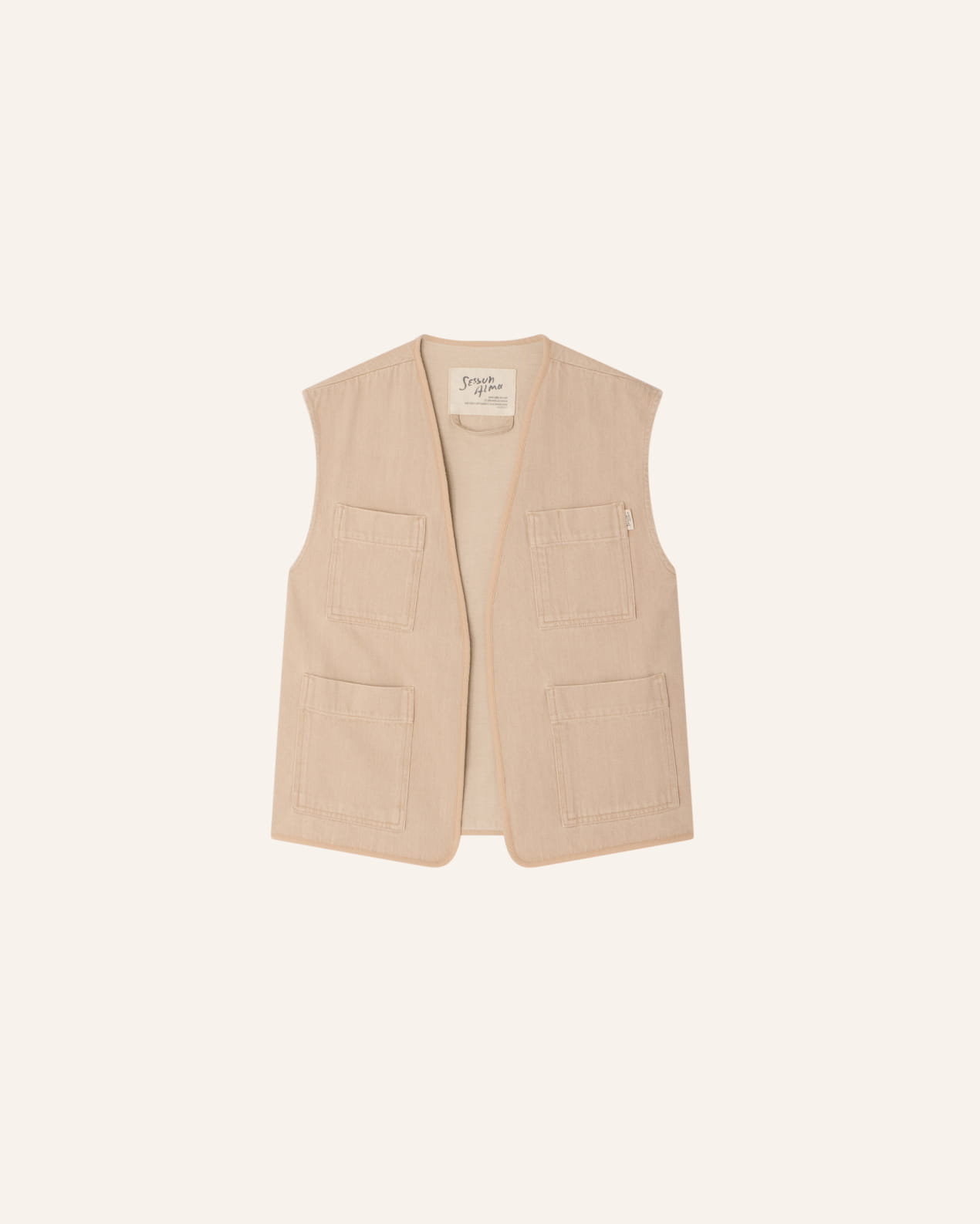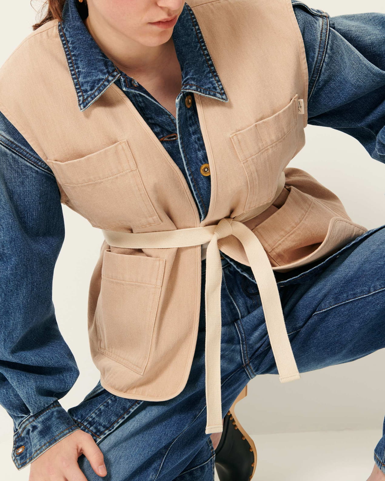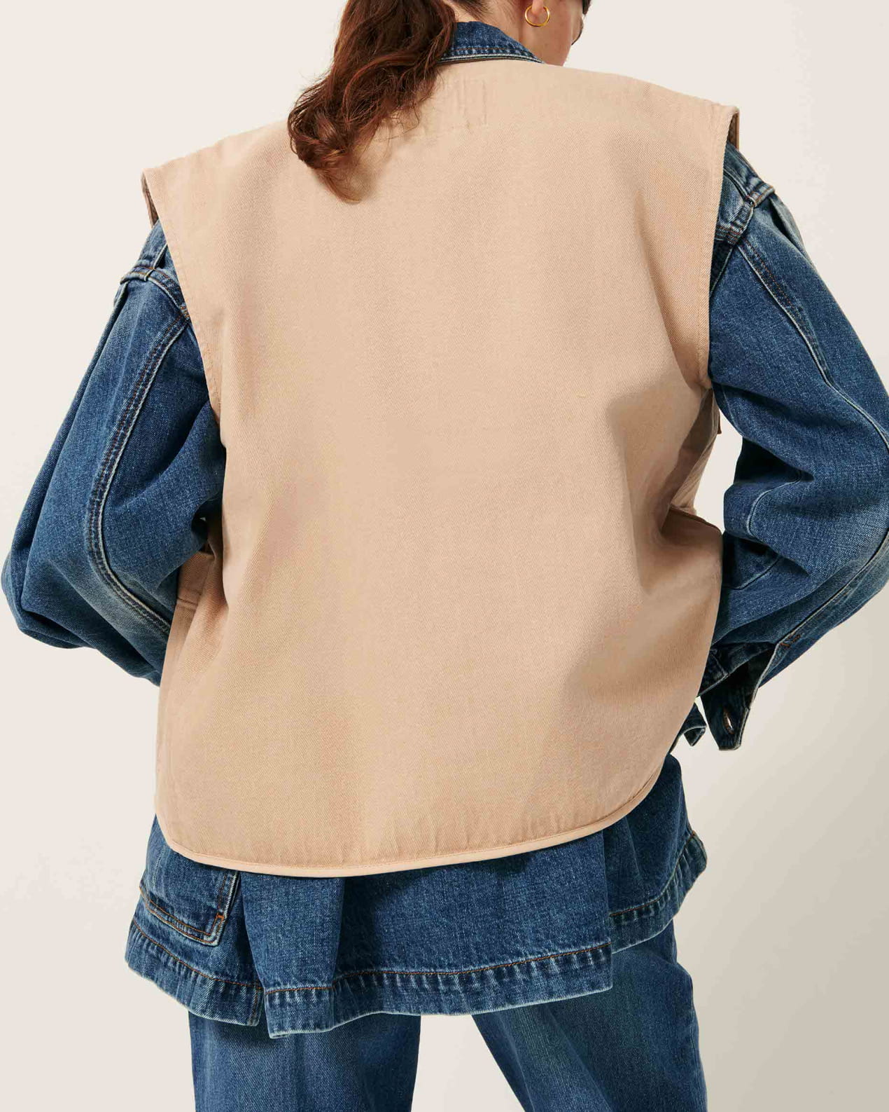 Sleeveless worker-style jacket with pockets, made from thread-dyed cotton twill with a chambray effect.