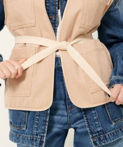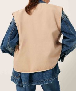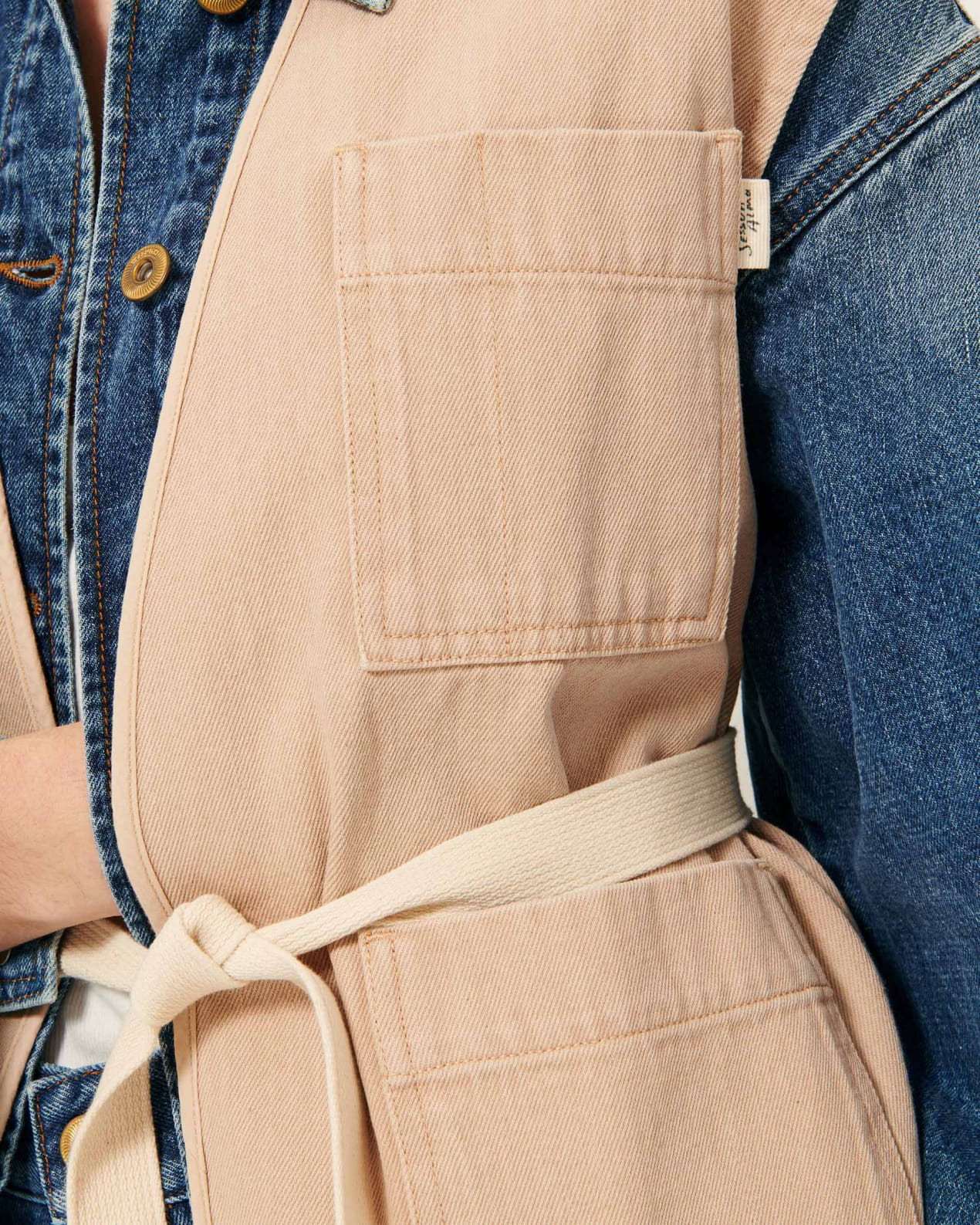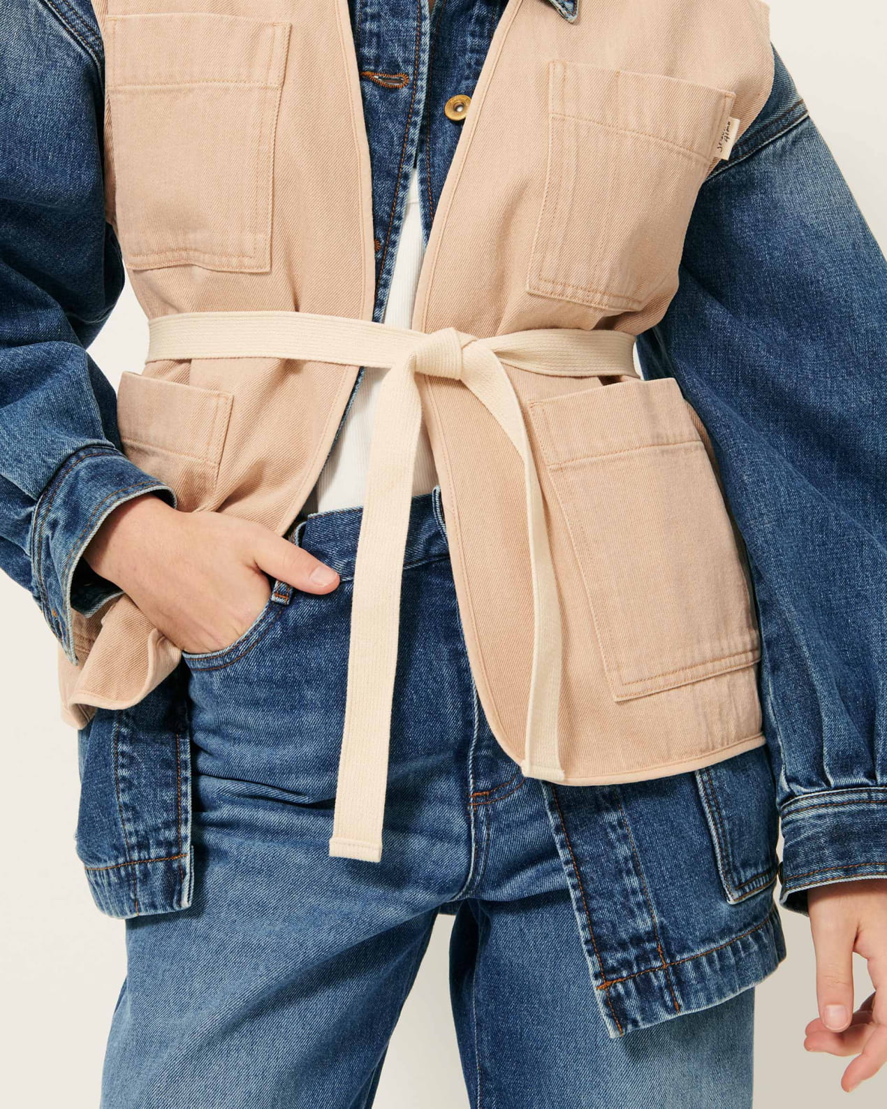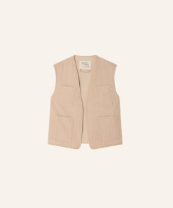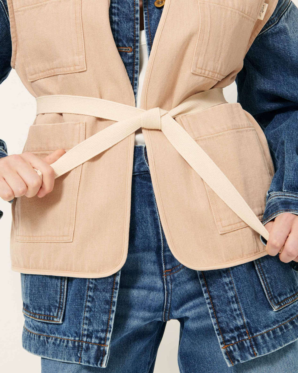 Sleeveless worker-style jacket with pockets, made from thread-dyed cotton twill with a chambray effect.