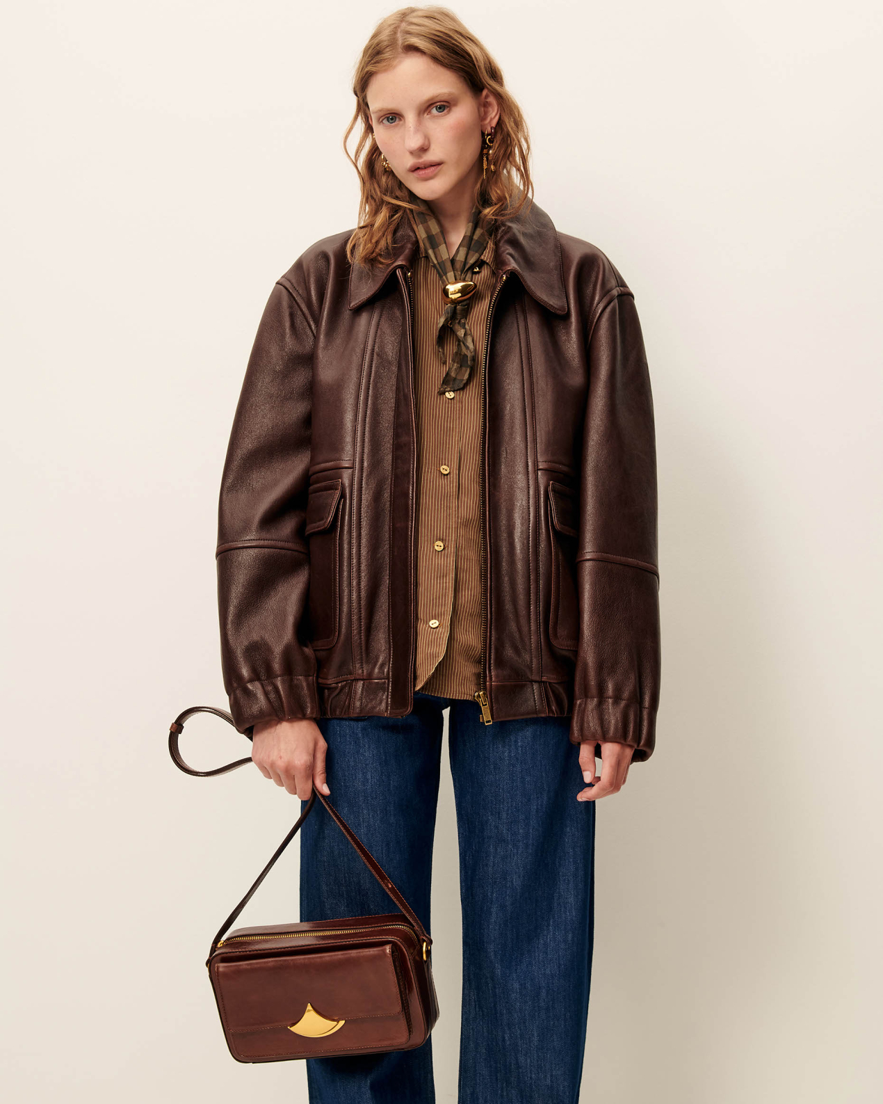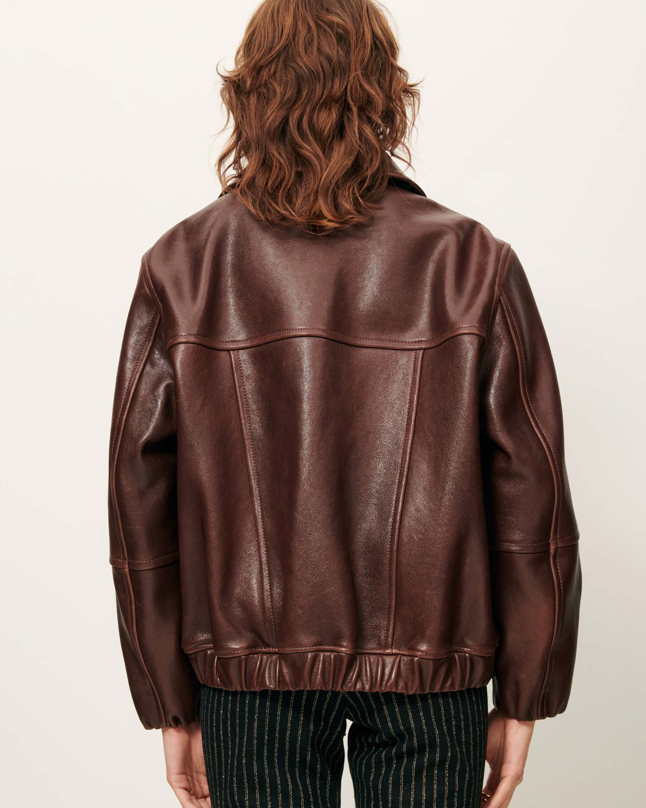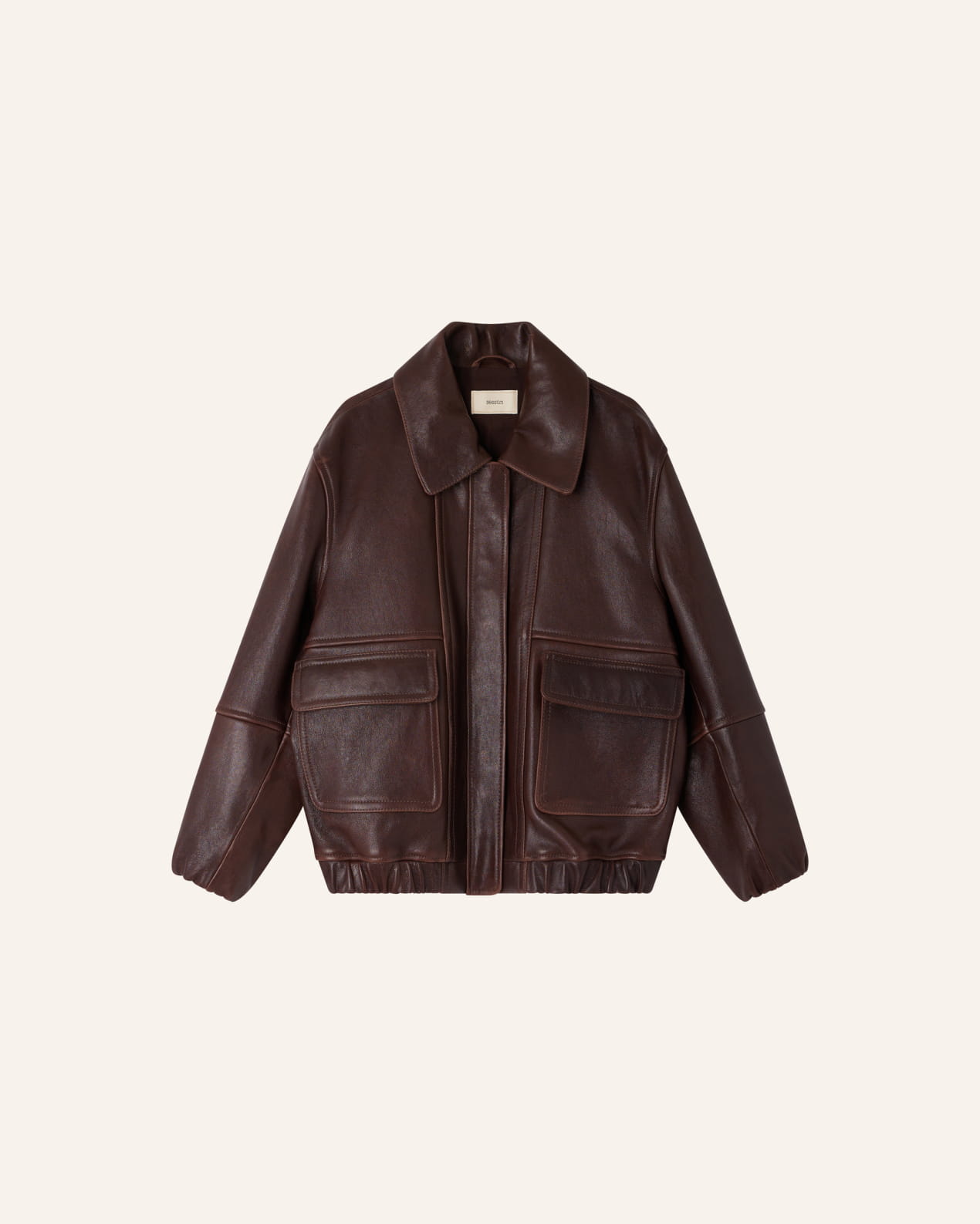 Loose-fitting elasticated blouson with patch pockets in patina-effect lamb leather.