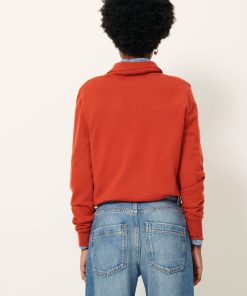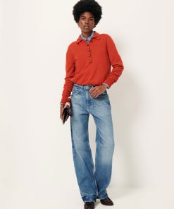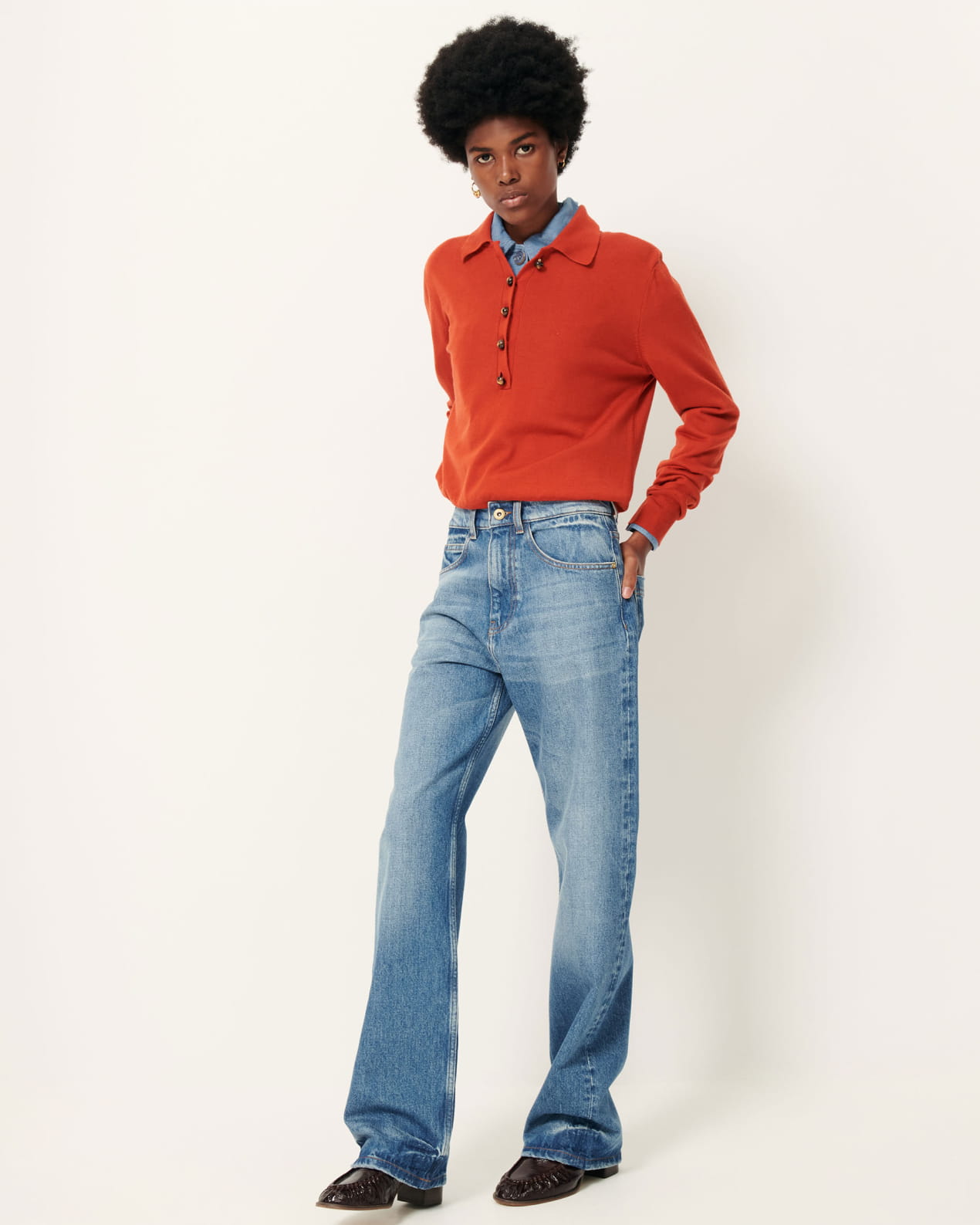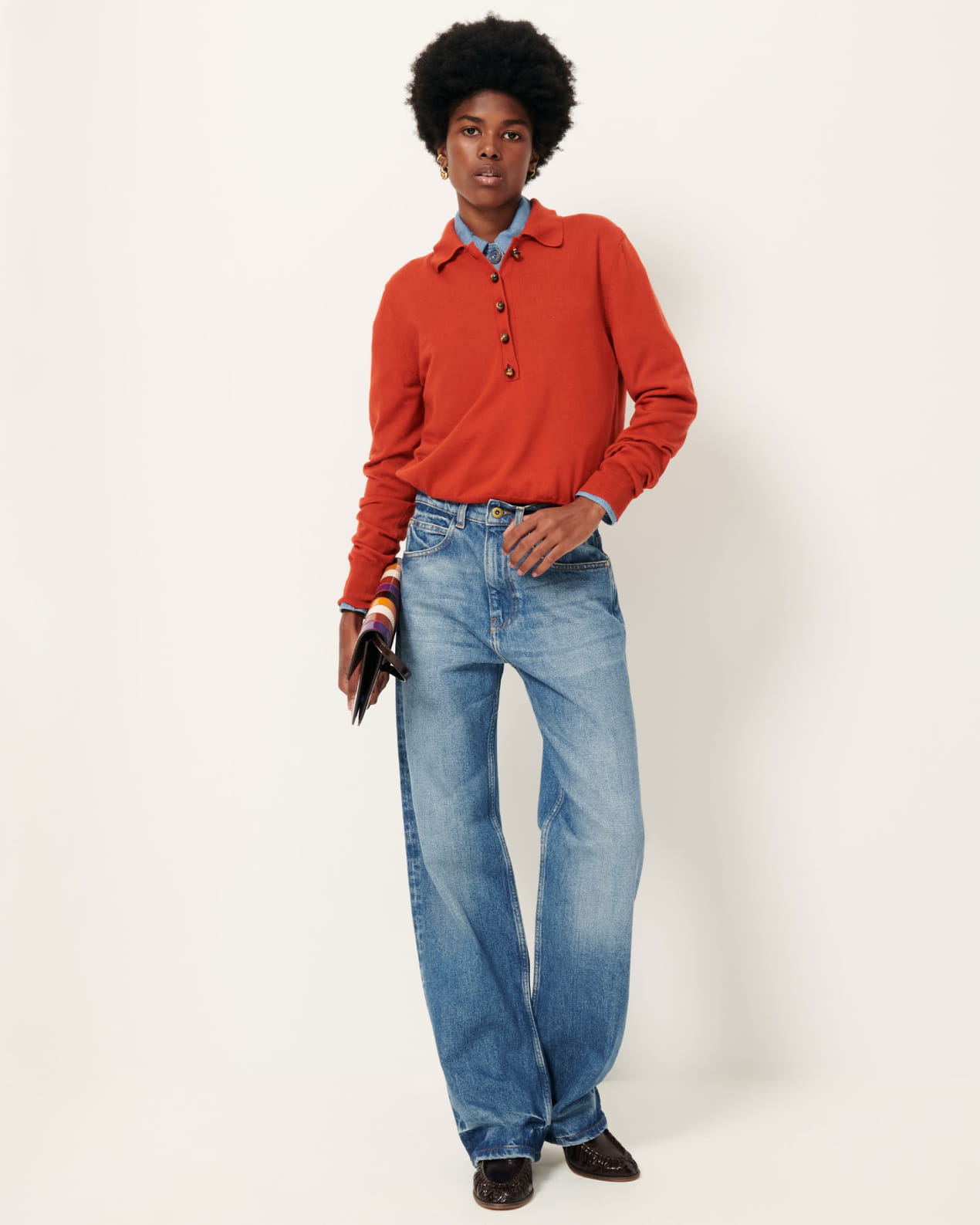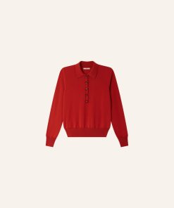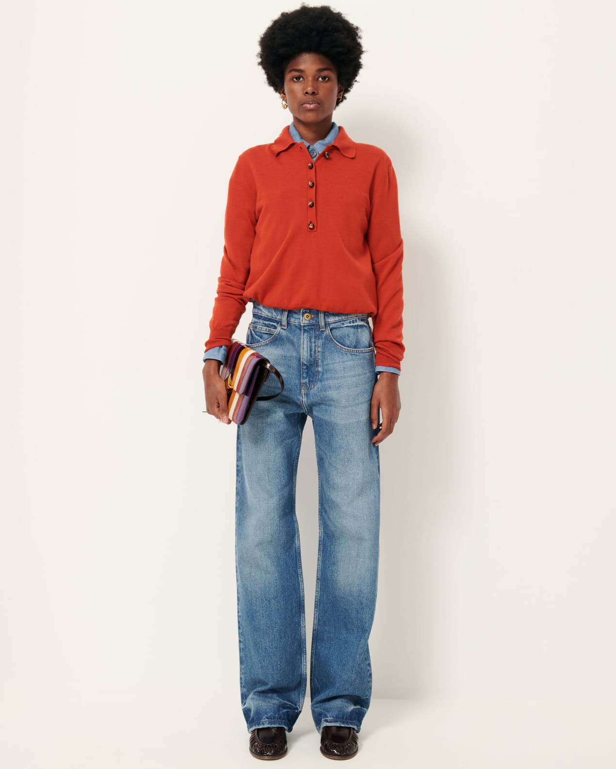 Long-sleeve polo-style jumper in fine merino wool knit with jewel buttons.